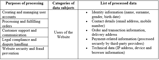The Company processes the following personal data of users of the Website for the following purposes: