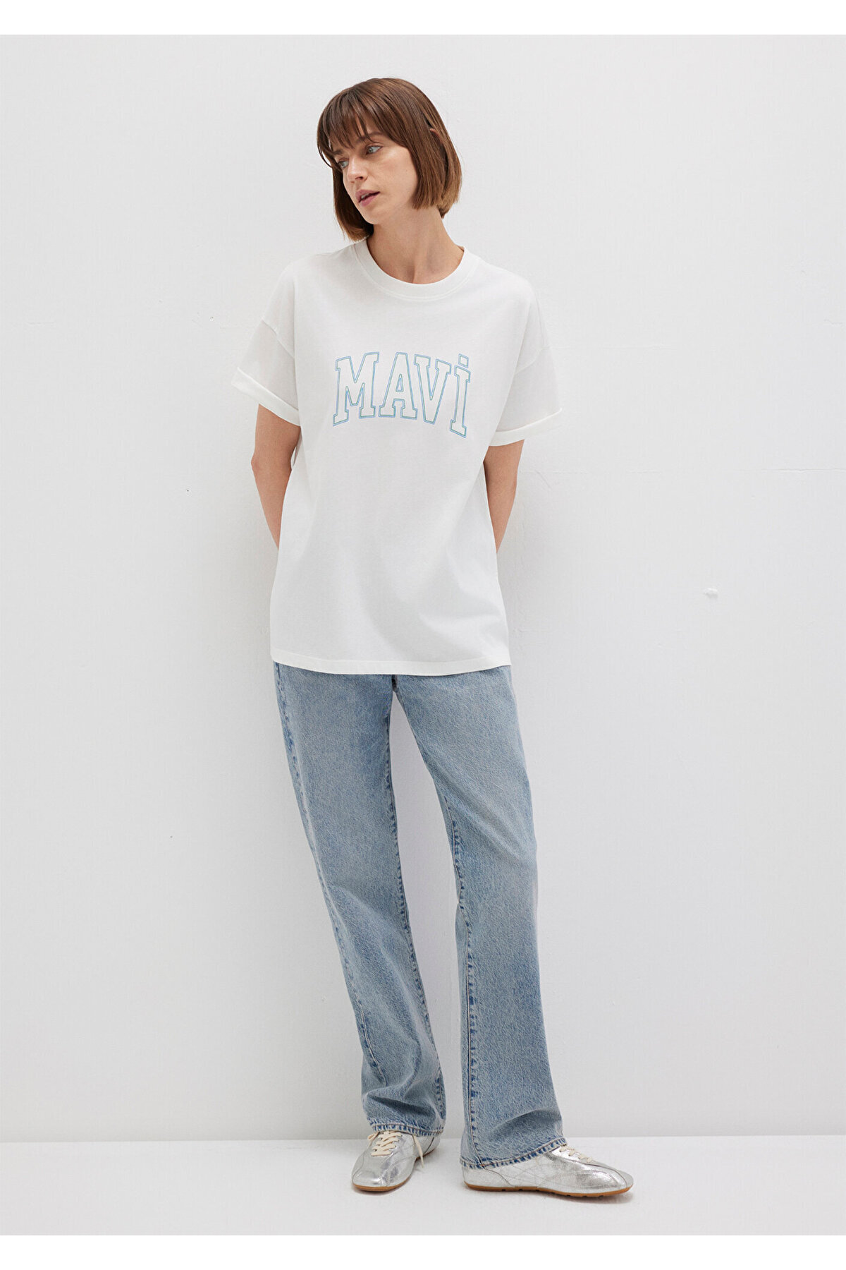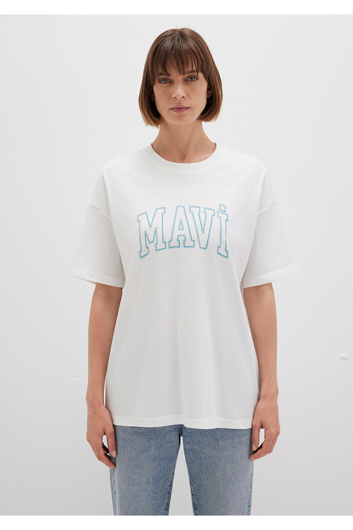 This t-shirt, which has a double-striped logo print in blue tones on the front, is ideal for daily use with its loose fit comfortable cut.