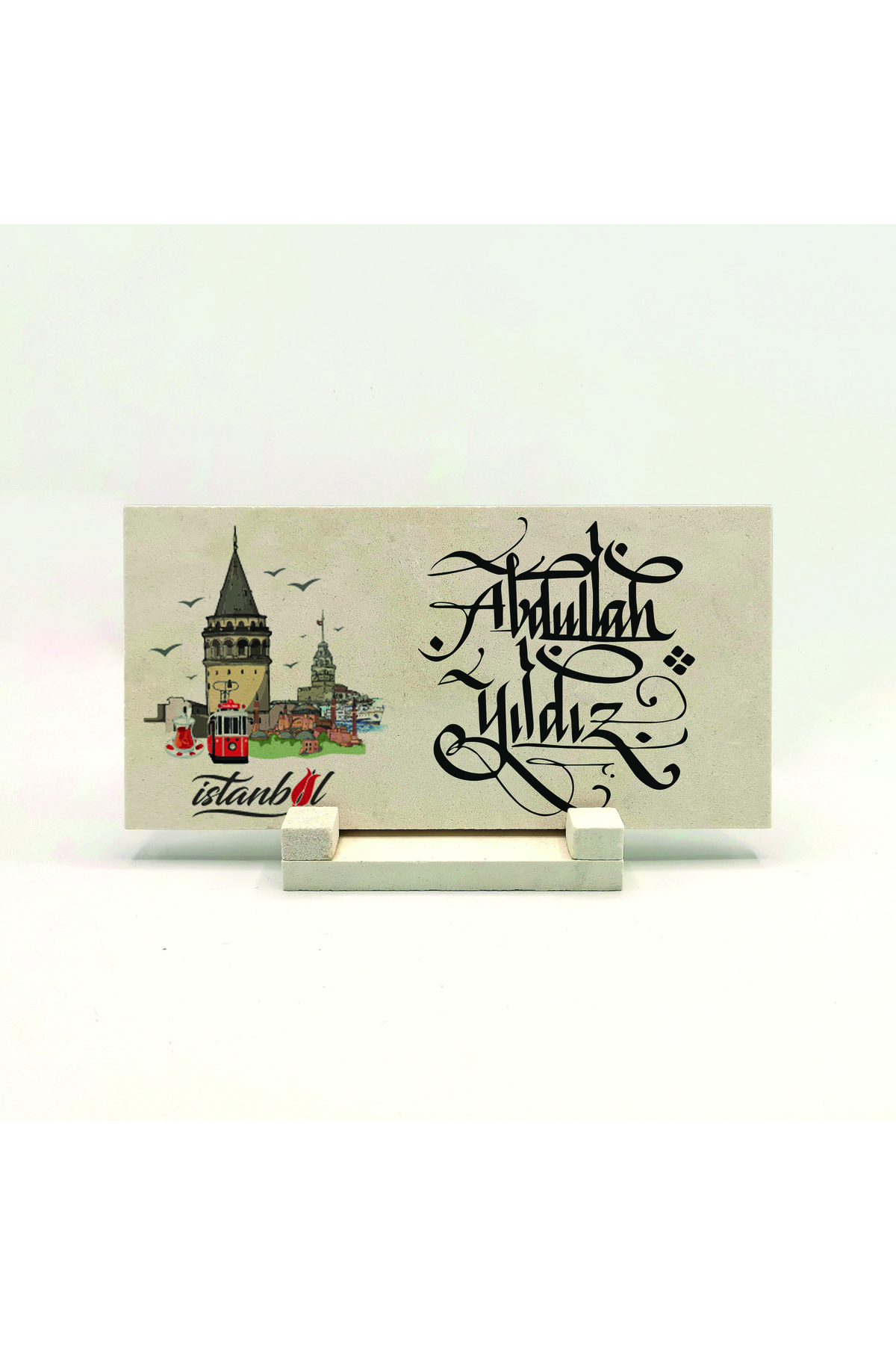 Names on natural stone, decorated with traditional calligraphy, provide a stylish touch on your desk