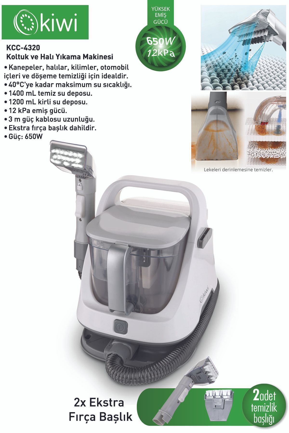 Thanks to the parking position, the Kiwi KCC-4320 seat and carpet washing machine can stand vertically when you are not using your vacuum cleaner.