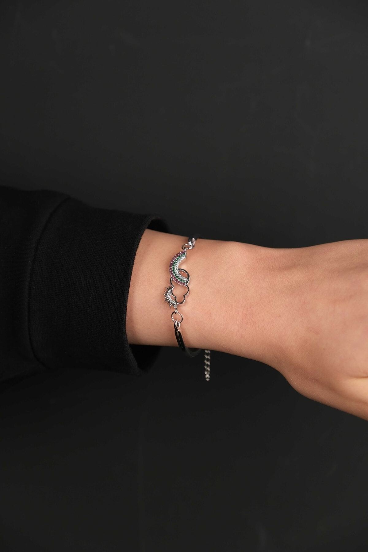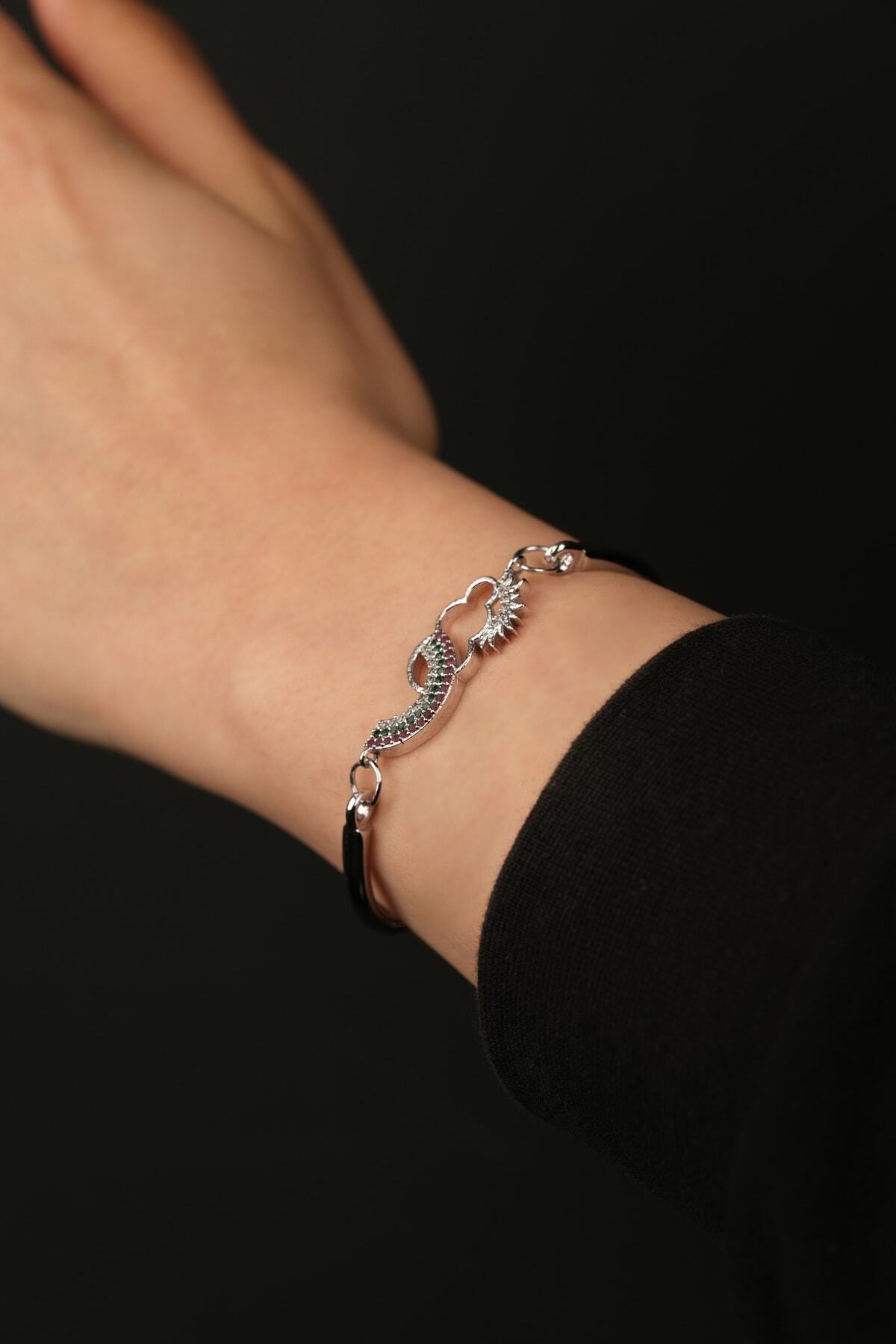 Attracting attention with its silver rainbow cloud design decorated with eye-catching zircon stones, this bracelet completes your elegance