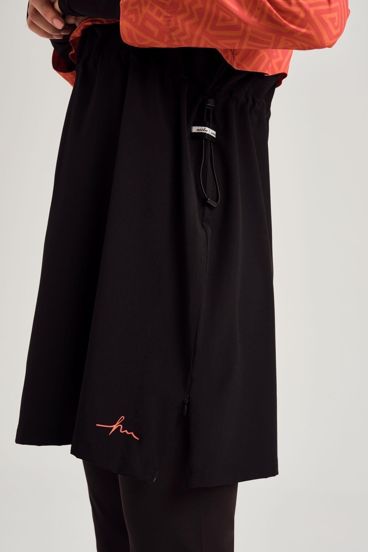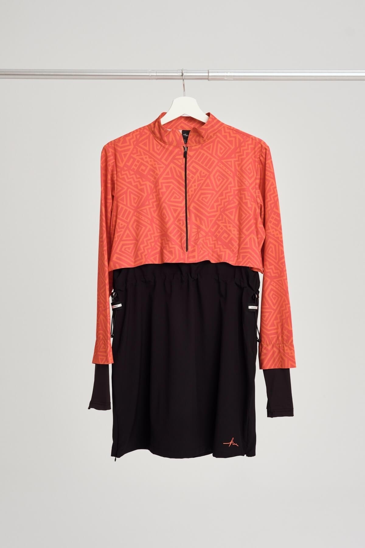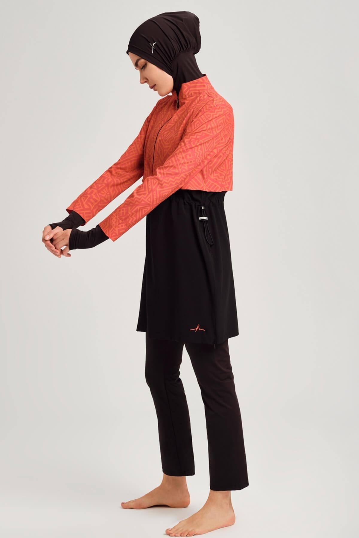 Attracting attention with its color block pattern, Esila orange black gilet full hijab swimsuit top completes your elegance at the beach and by the pool