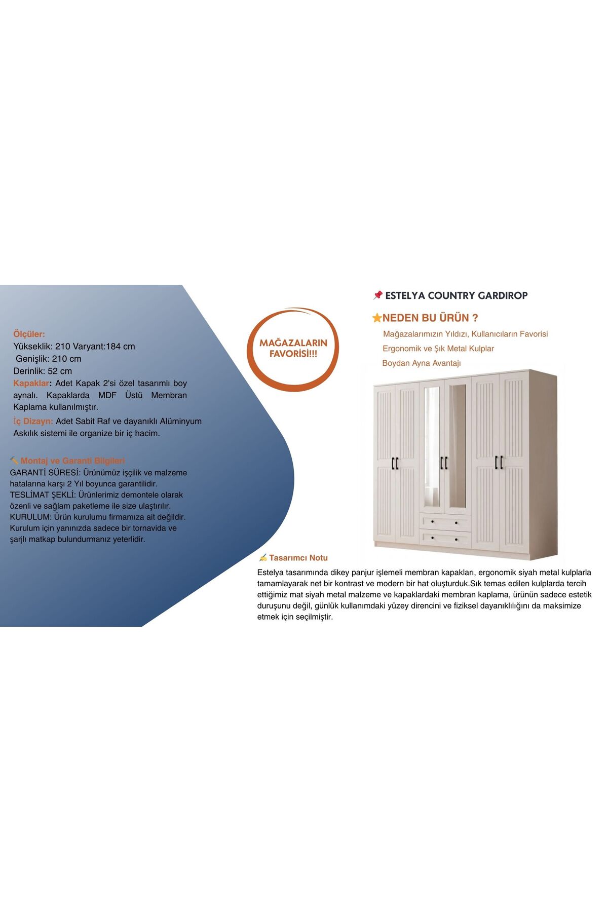 PRODUCT DIMENSIONS Length: 184 cm Width: 210 cm Depth: 52 cm PRODUCT COLOR Case: Matte white chipboard Covers: MEMBRANE COATING on MDF PRODUCT FEATURES Specially designed membrane covers Hafele brand hinge Stylish design metal handle 2 drawer systems 4 fixed shelves Aluminum hanger High quality chipboard body Quality disassembled connection systems WARRANTY PERIOD Our products are guaranteed for 3 years.