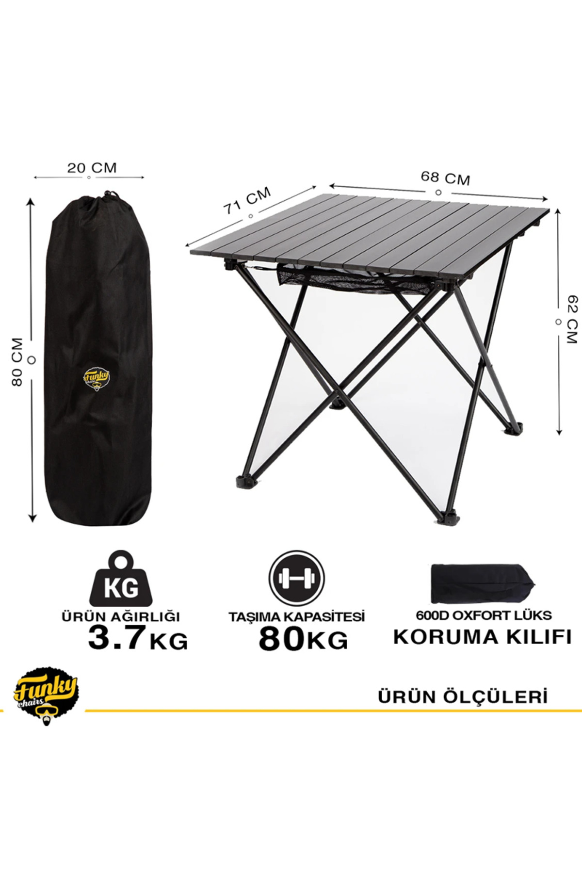 Funky chains BLACK CAMPING TABLE is DURABLE UP to 80 KG Thanks to its high resistance skeleton, it is resistant to EXTERNAL FACTORS WITH a carrying capacity of up to 80 kg. It is very resistant to the sun and rain. CARRYING BAG It can be easily carried with its bag made of quality fabric.