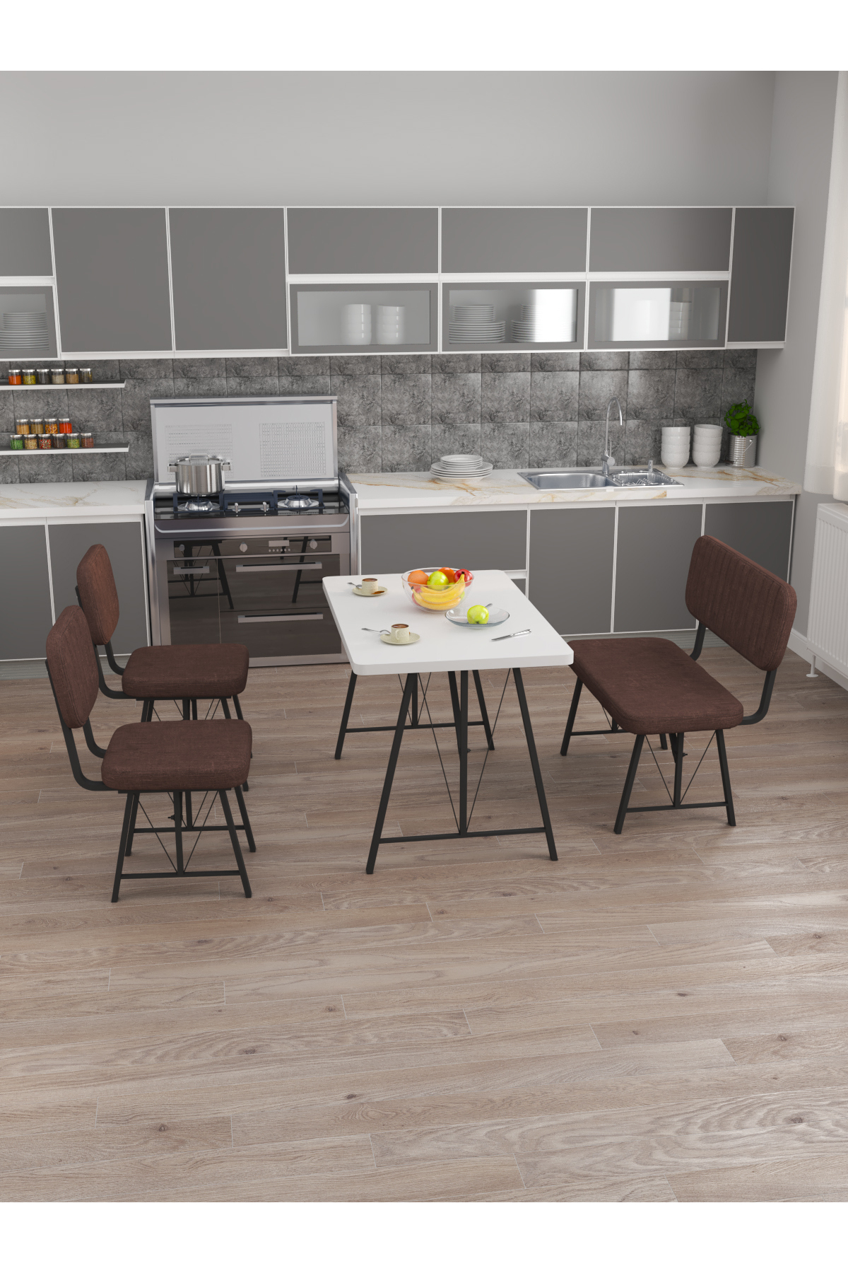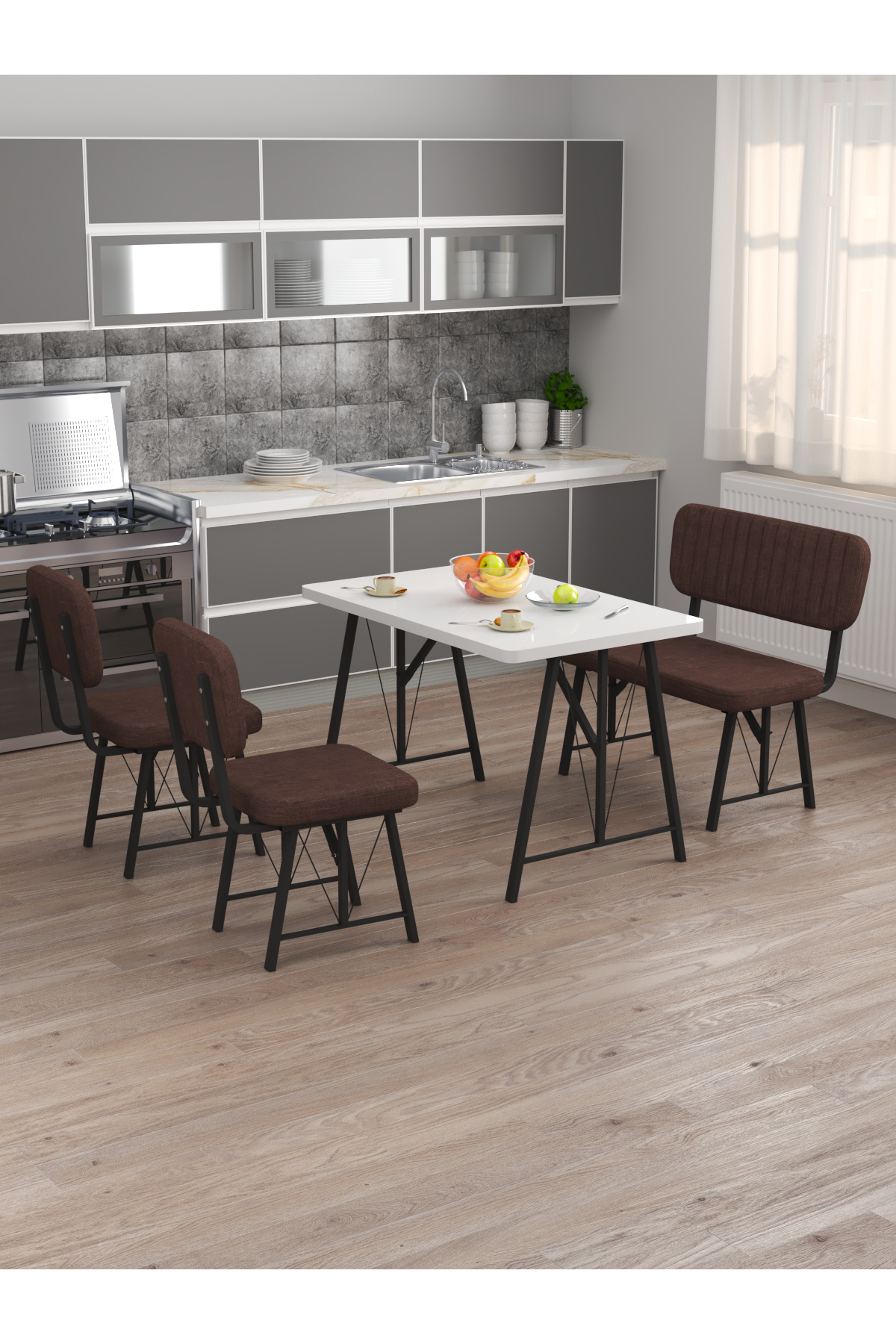 Mygusi Life 70x110 White, Kitchen Table Set, Dining Table, 2 Chairs 1 Bench - Brown | ByTR