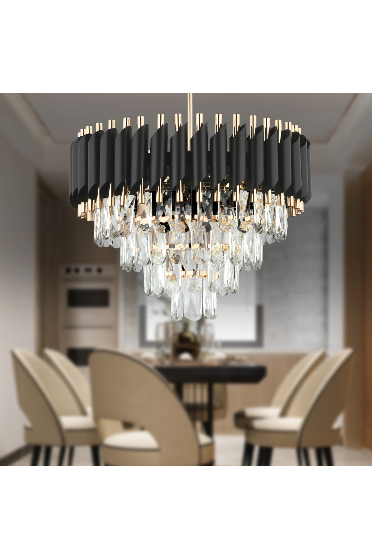 Give your home or workplace a distinctive elegance with its modern design, strong light distribution and fascinating glow of crystals! With its durable structure and eye-catching design, this chandelier will maintain its first-day glory for years.