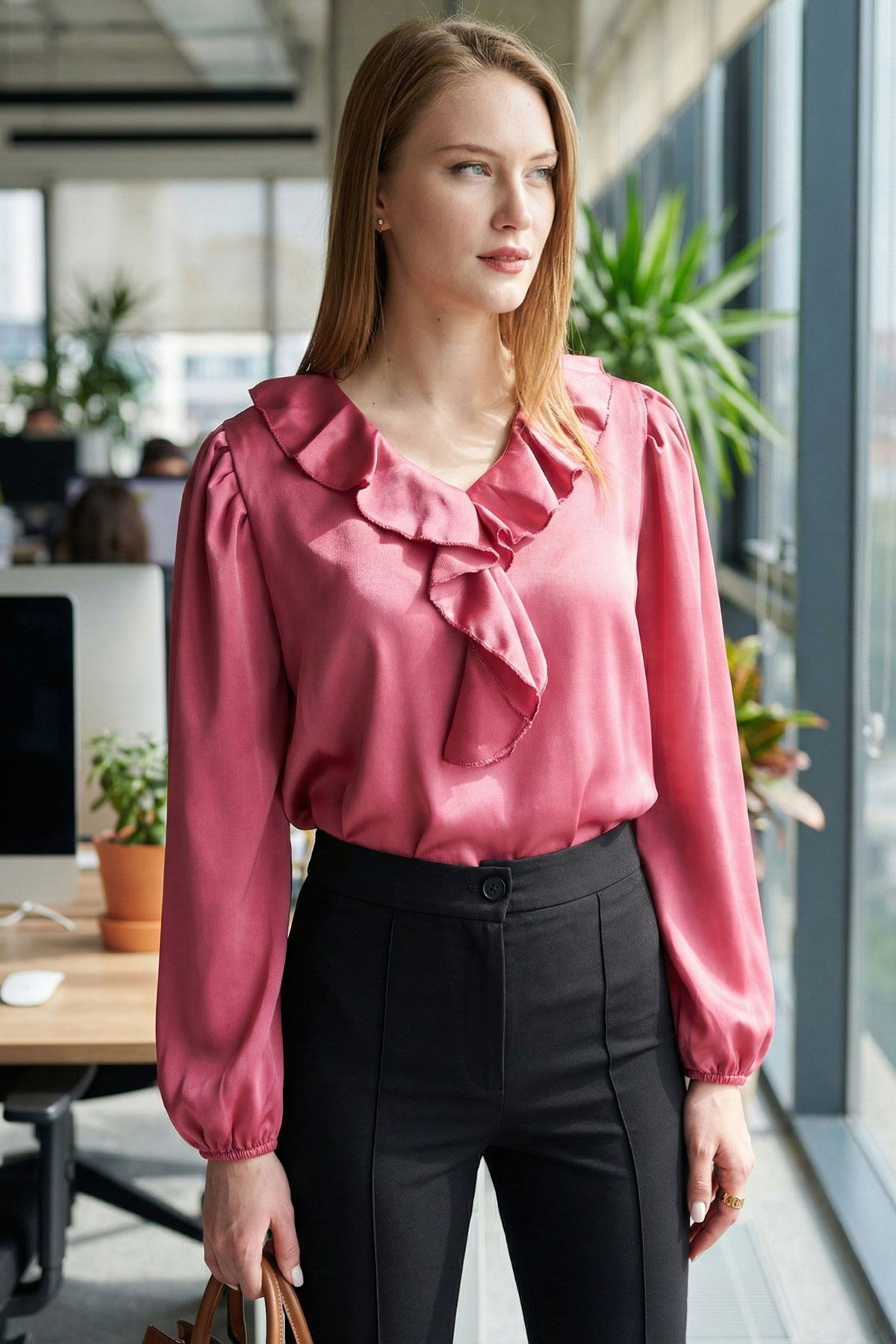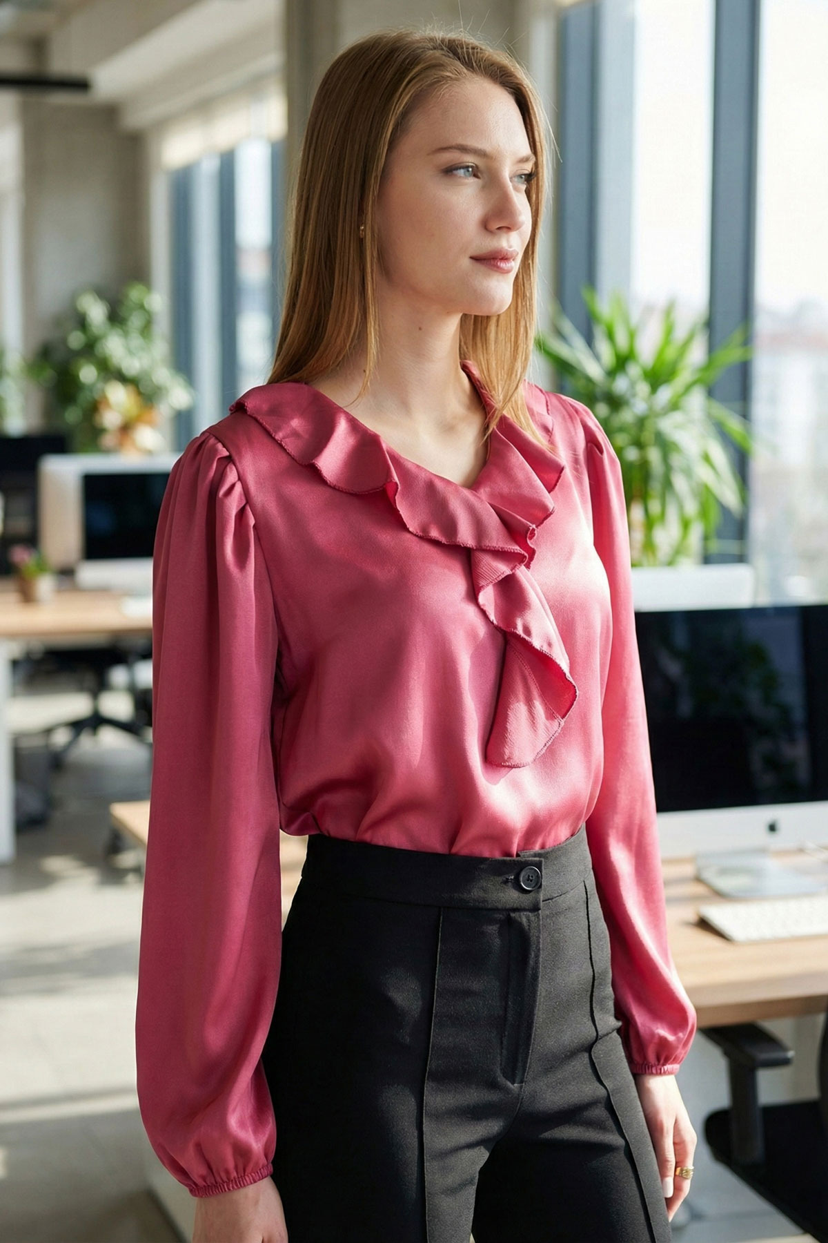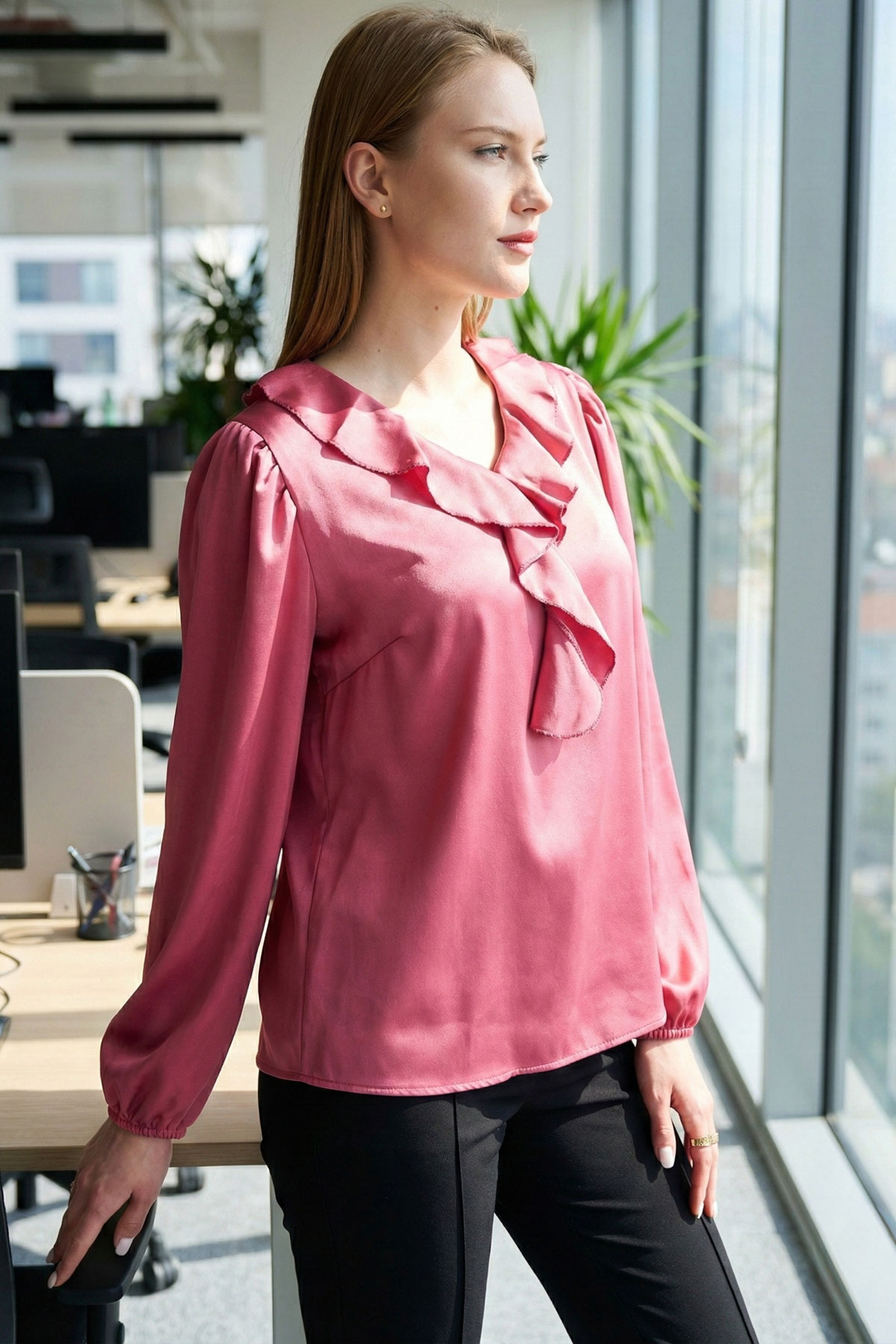 Stylish and suitable for night environments, this blouse creates a remarkable style by giving movement with ruffle details