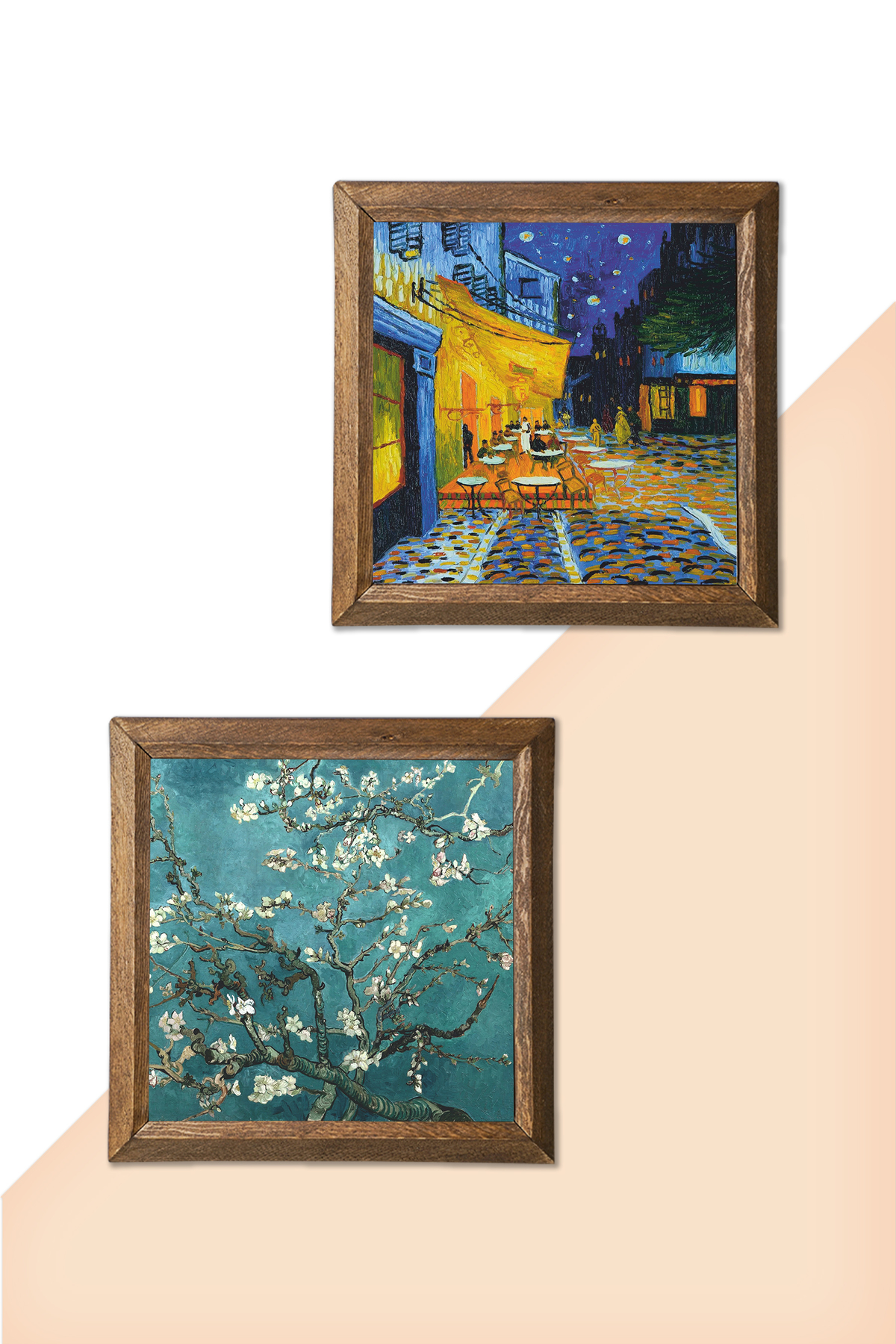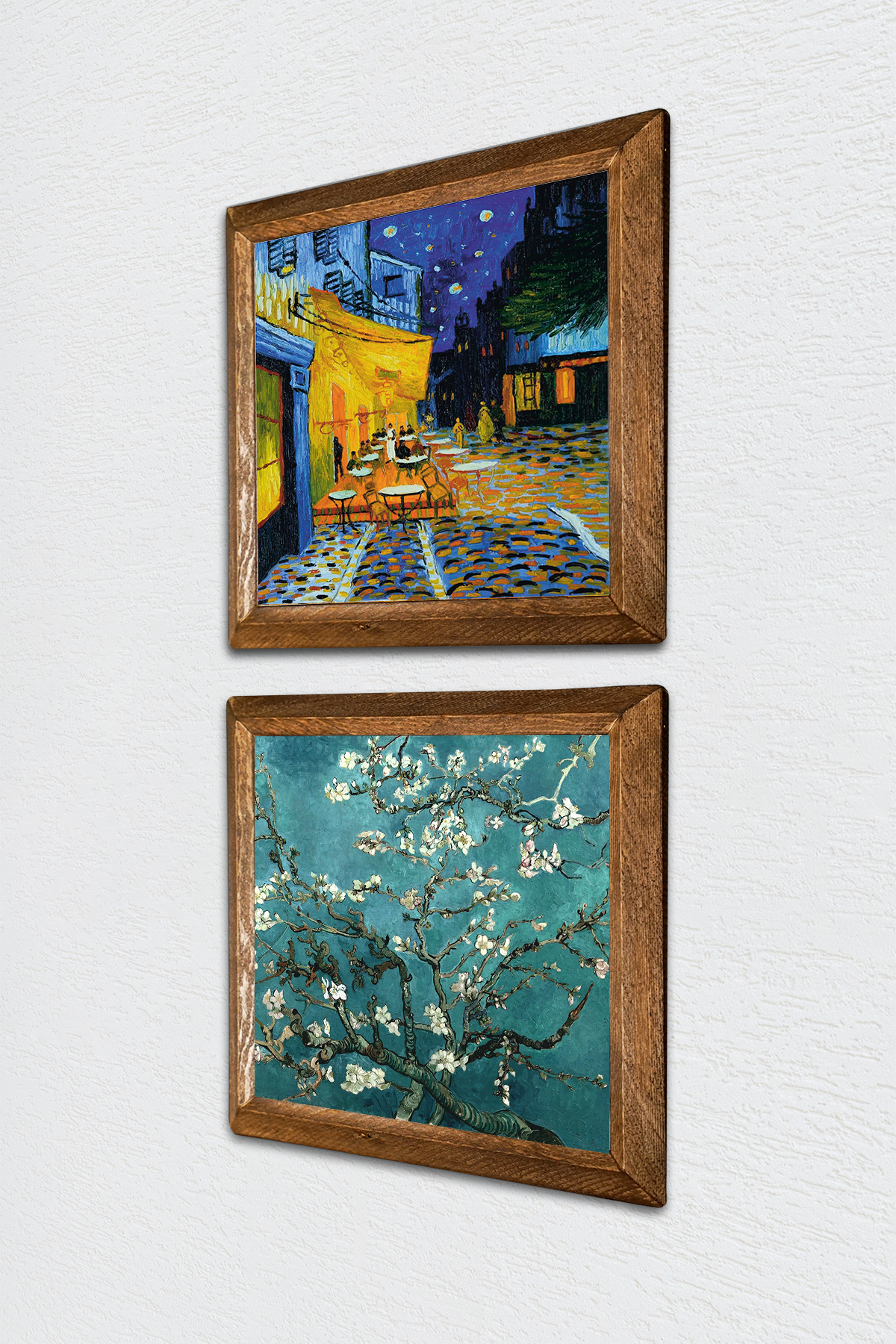 Van Gogh Cafe Night on the Terrace, Almond Tree - W2-374 - Natural stone material is used on the middle surface of the Wooden Framed Stone Wall Table.