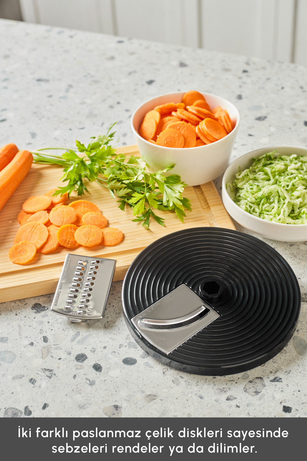 There are 2 different stainless steel discs that provide slicing and grating functions.