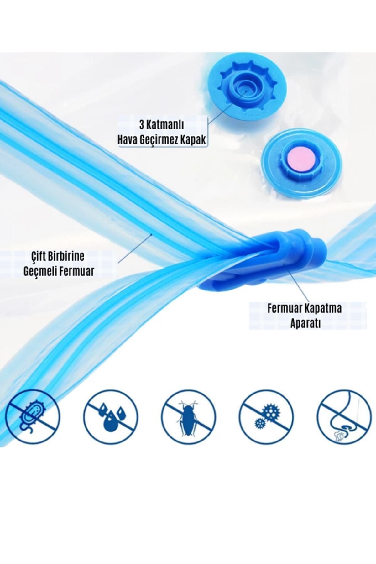 MAINTAINS ORDER AND ORDER. Many of your belongings that will not be needed for a long time and therefore should not be around can easily cause a mess. When it comes to storing your seasonal items such as quilts, blankets, sweaters, etc., you can reduce the storage space you need for these products by using your space-saving bags. FREE UP SPACE With space-saving storage bags, you can easily minimize the storage space in your home. Our bags allow you to vacuum air out and reduce the volume of items inside the bag after being placed in items such as blankets or your clothes. Depending on the size of the items to be stored in the bag, the volume of your items can be reduced by up to 75%. PROTECTS FROM EXTERNAL FACTORS Your belongings are not affected by moisture,mold, moth and odor in the bags. REUSABLE Your vacuum storage bags are suitable for repeated use as they are made of high quality plastic suitable for reuse. Open the zipper and take off your clothes, your bags are ready to vacuum and store your new belongings. Tips for Using Vacuum Bags