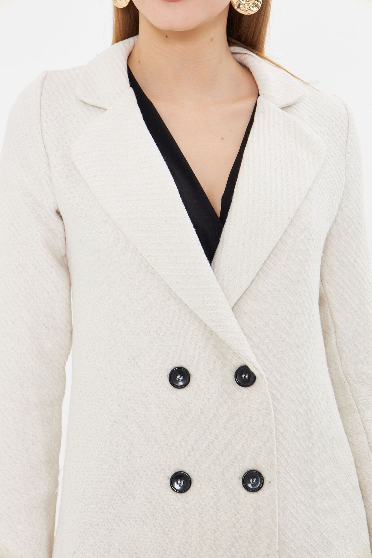 Buttoned closure allows practical use, while the double-breasted collar detail gives a modern look