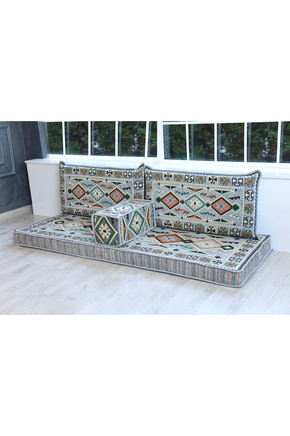 FLOOR CUSHION 1 x 70 x 190 x 10 cm BACK CUSHION 2 x 40 x 90 x 10 or 12 cm ARMREST 1 x 20 x 20 x 50 or 22 x 22 x 48 cm