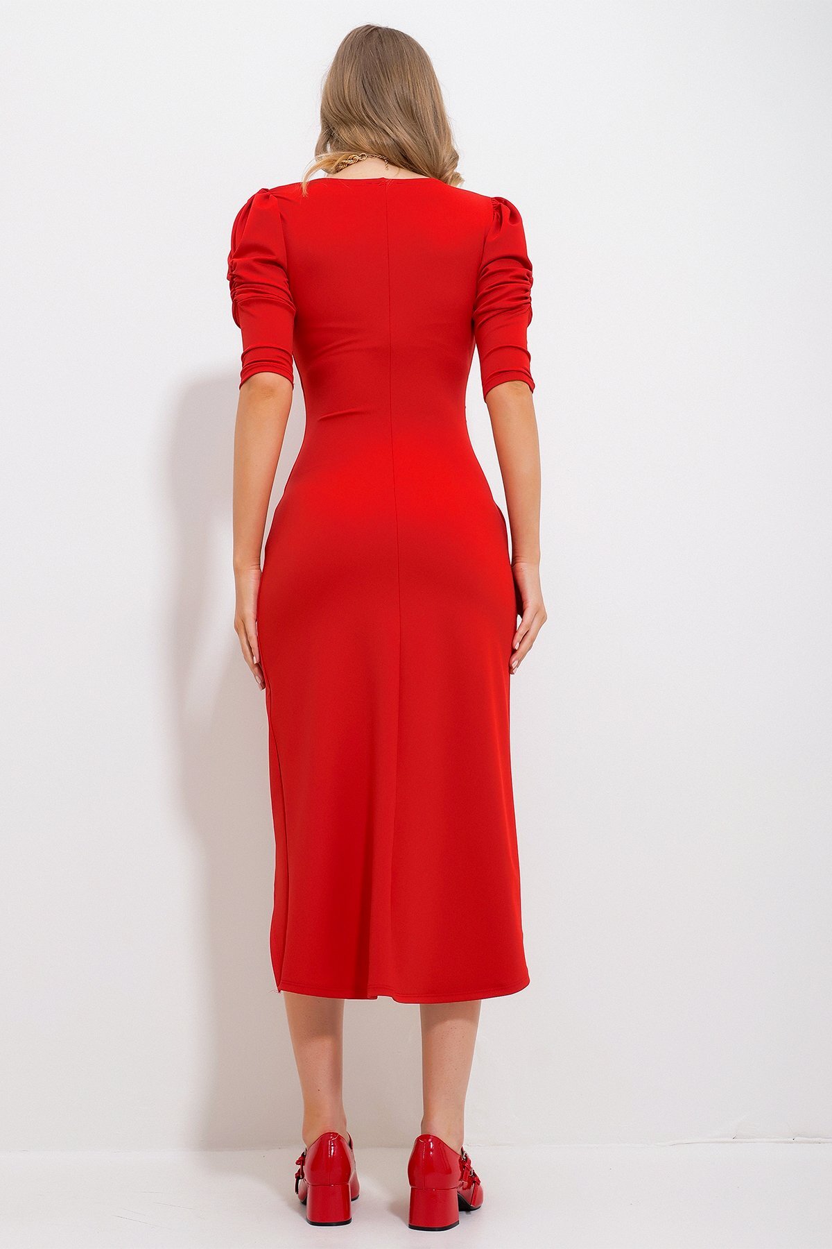 Trend Alaçatı Stili Red Wrap Collar Draped Princess Sleeve Cocktail Dress ALC-X11687 | ByTR