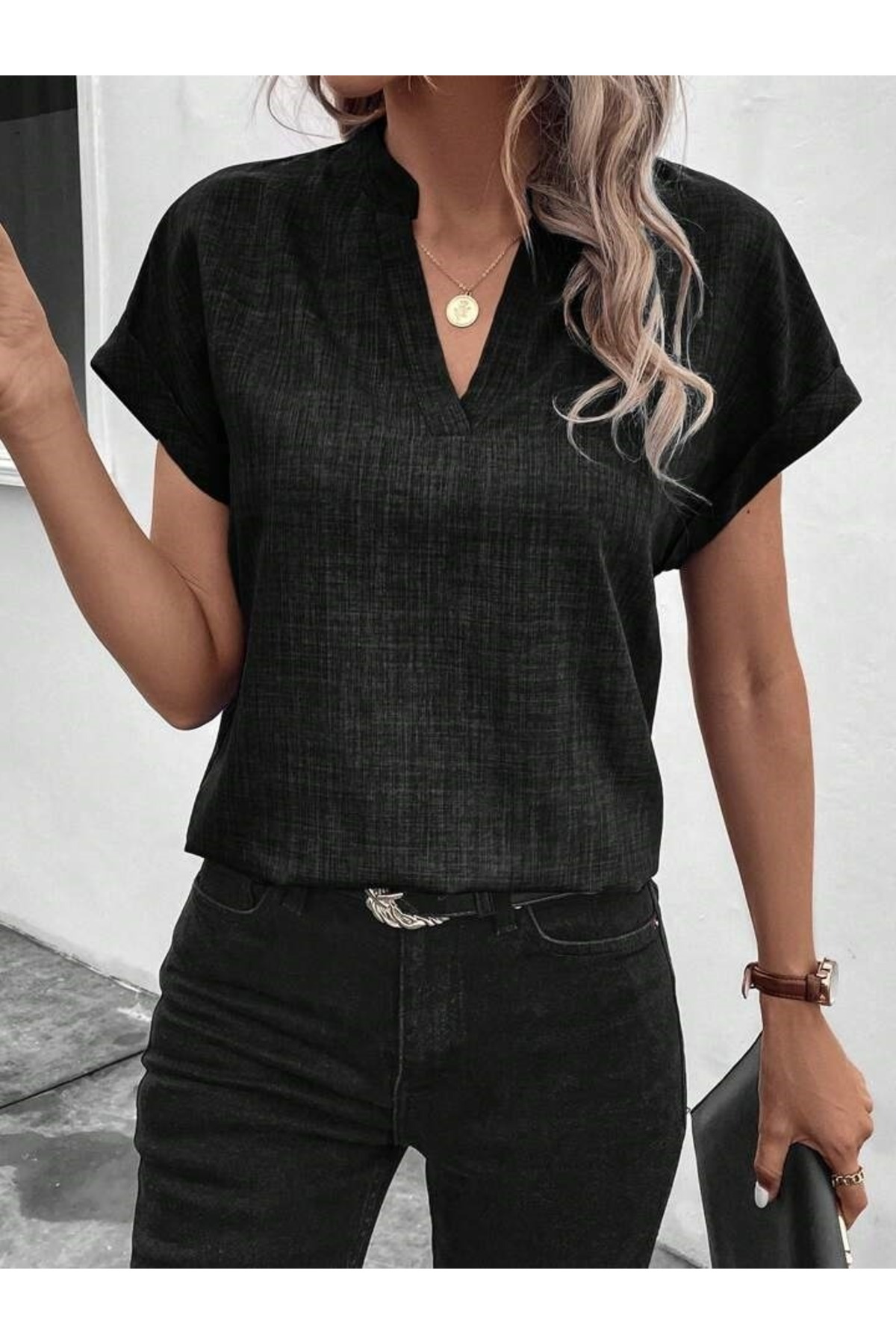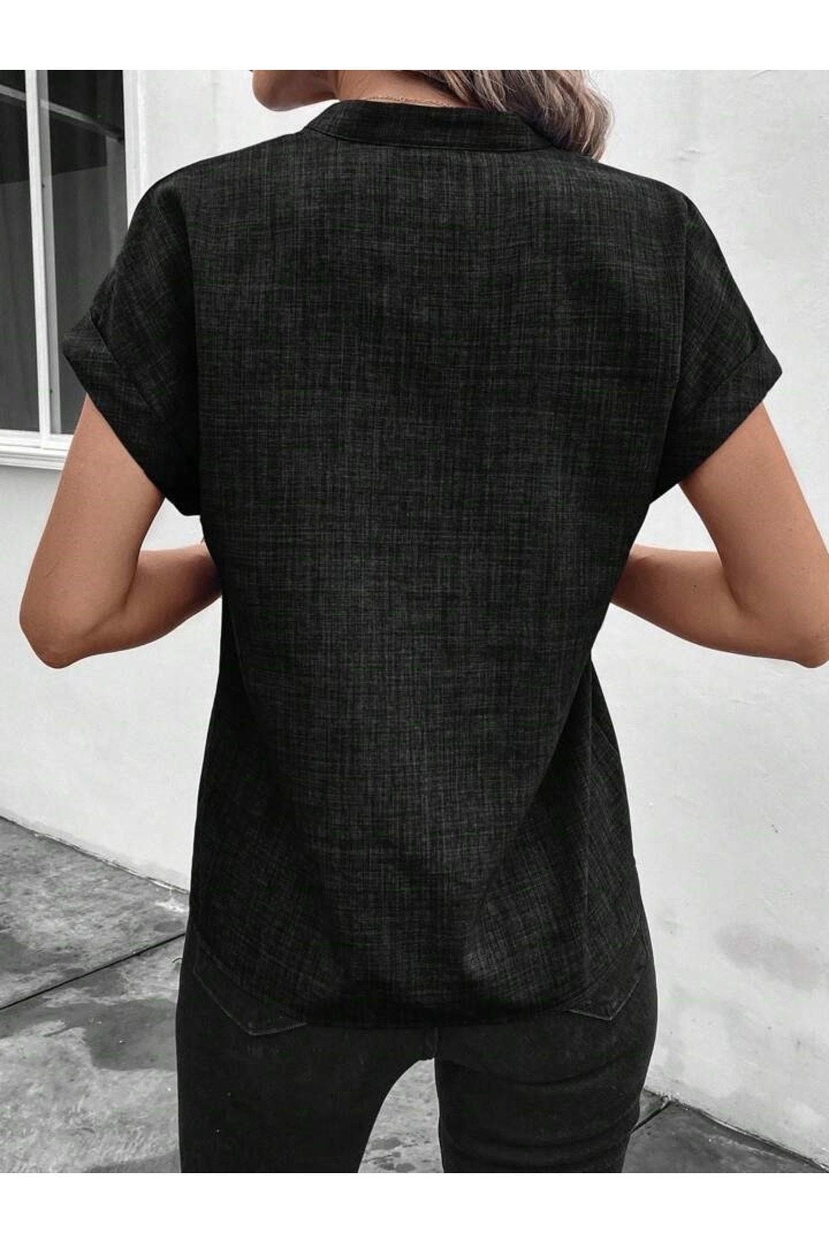 Short-sleeved dominant neck blouse that reflects the trends of the new season and offers a stylish and modern look.