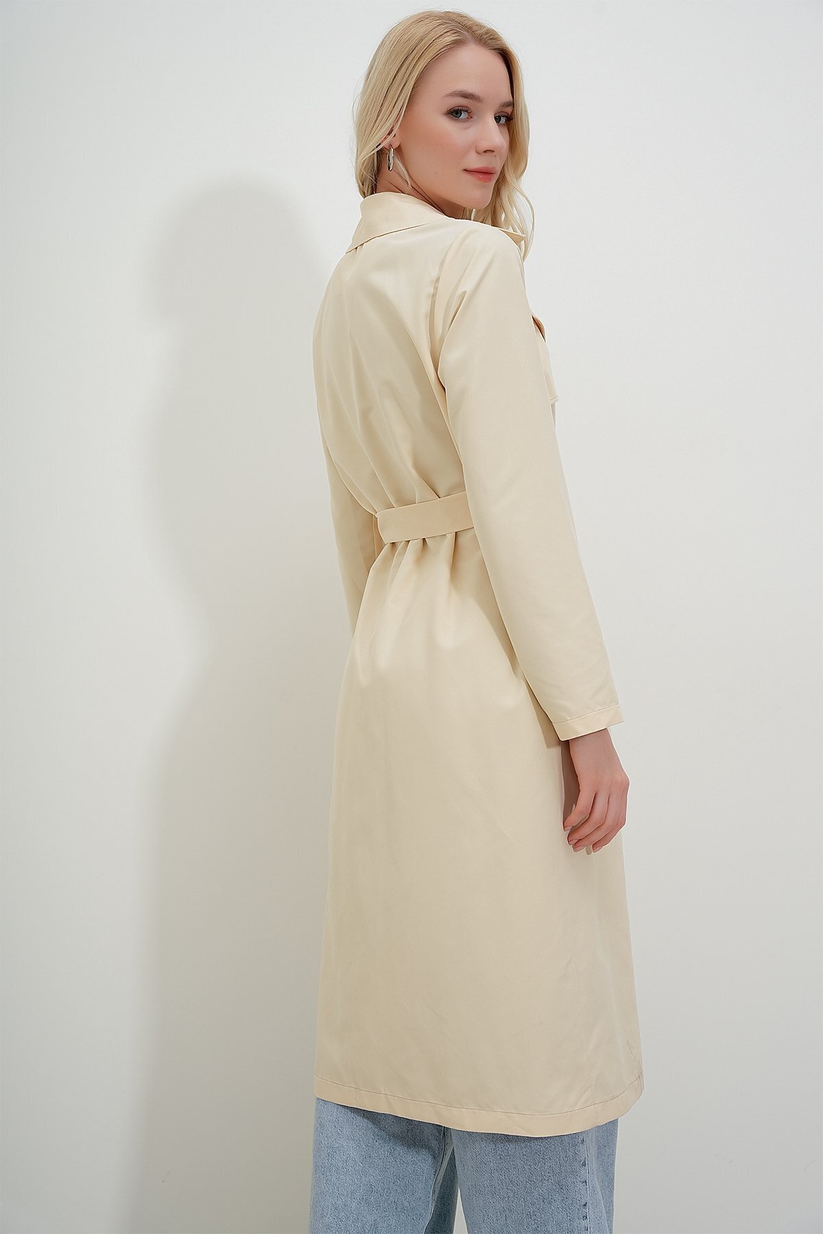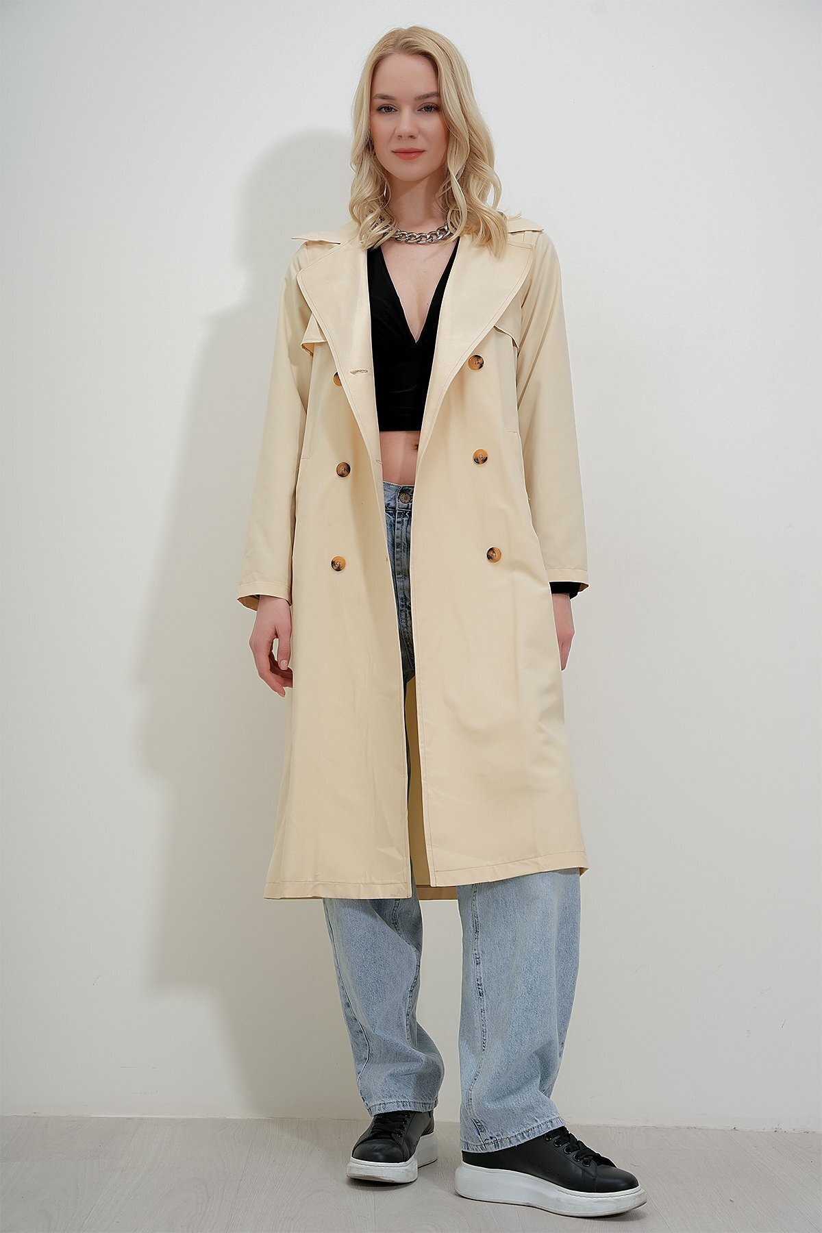 The double-breasted silhouette shows a feminine stance by perfectly matching your body contours