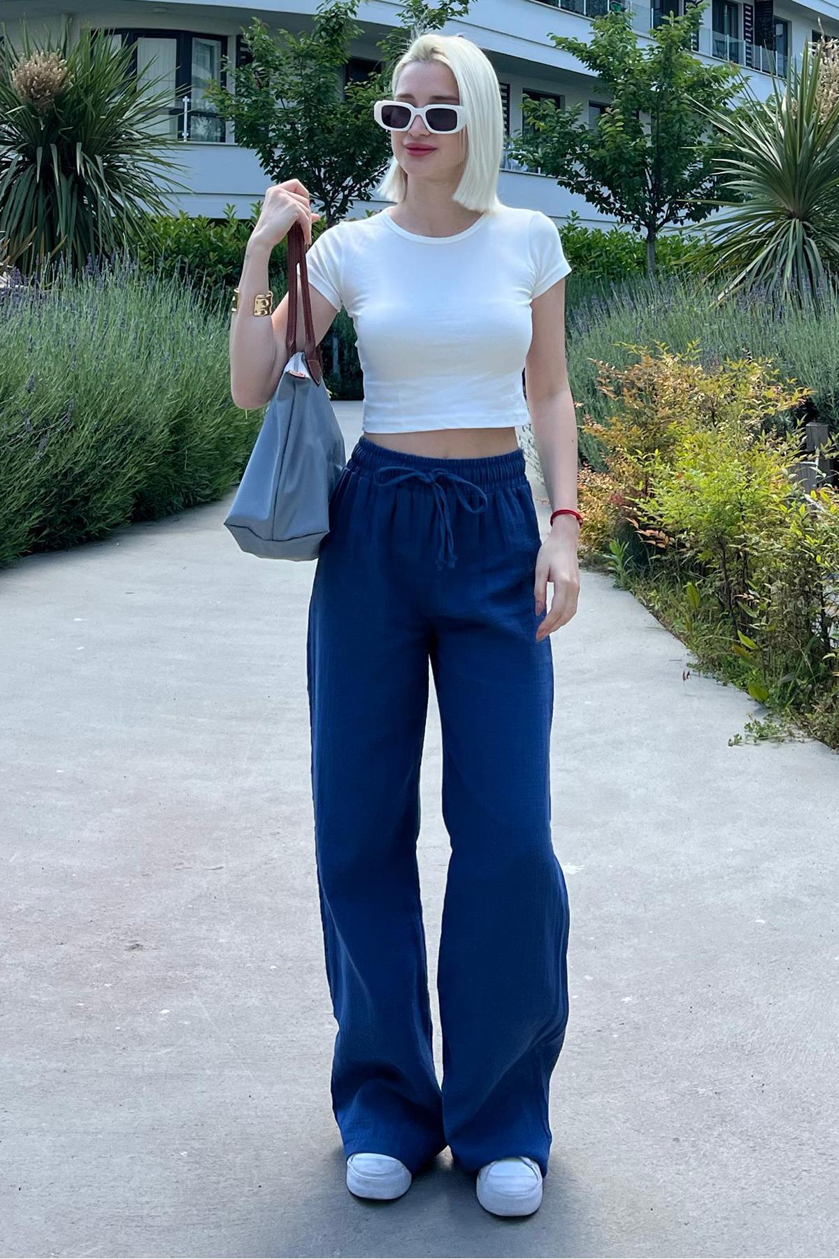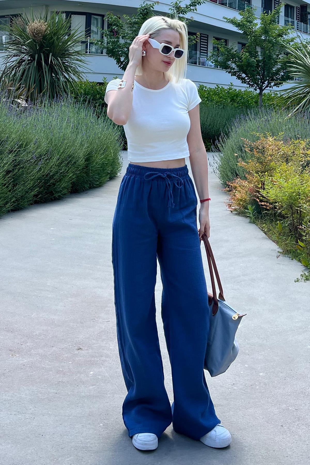 Madmext Dark Blue Wide Leg Muslin Women's Trousers MG1980 | ByTR