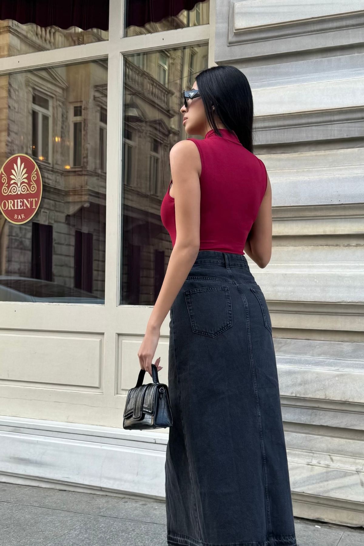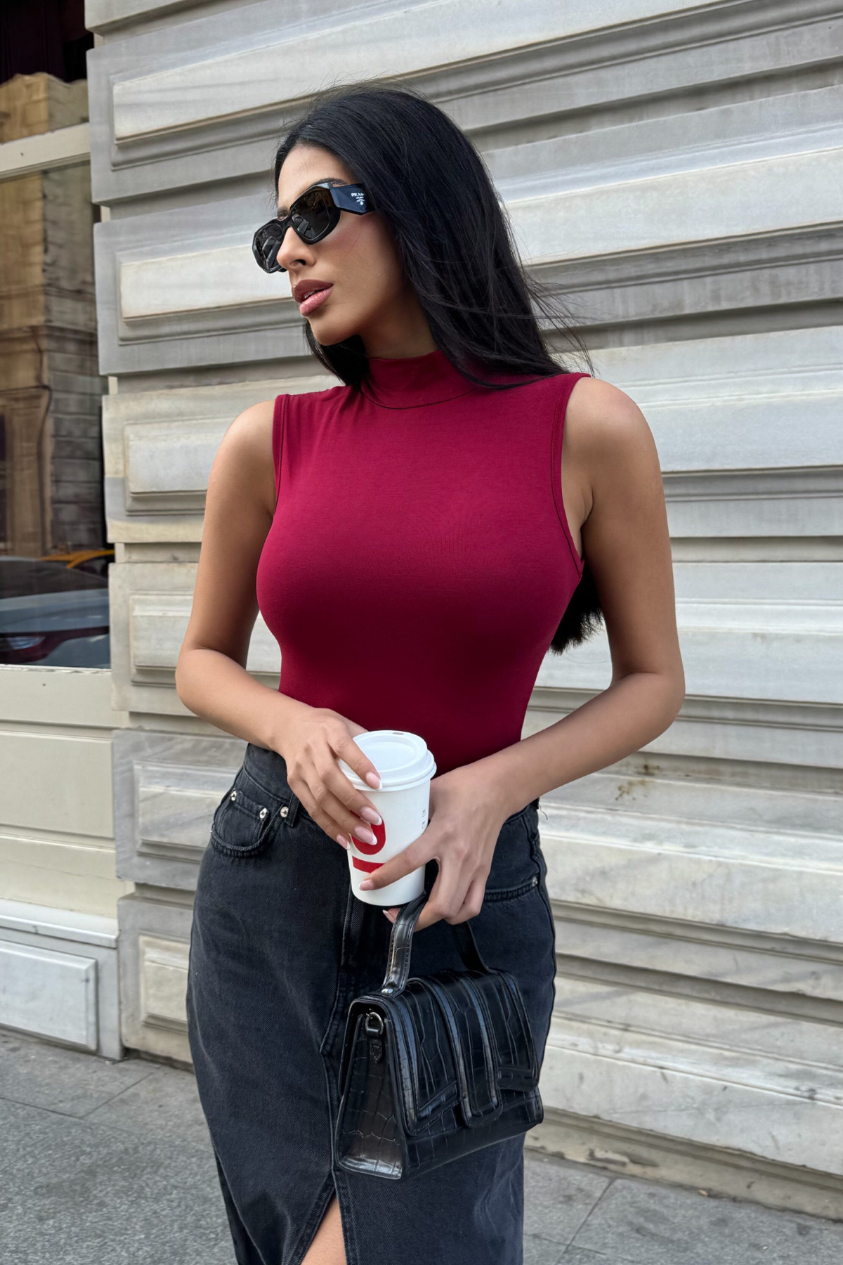 It offers a modern and elegant look with its half turtleneck detail