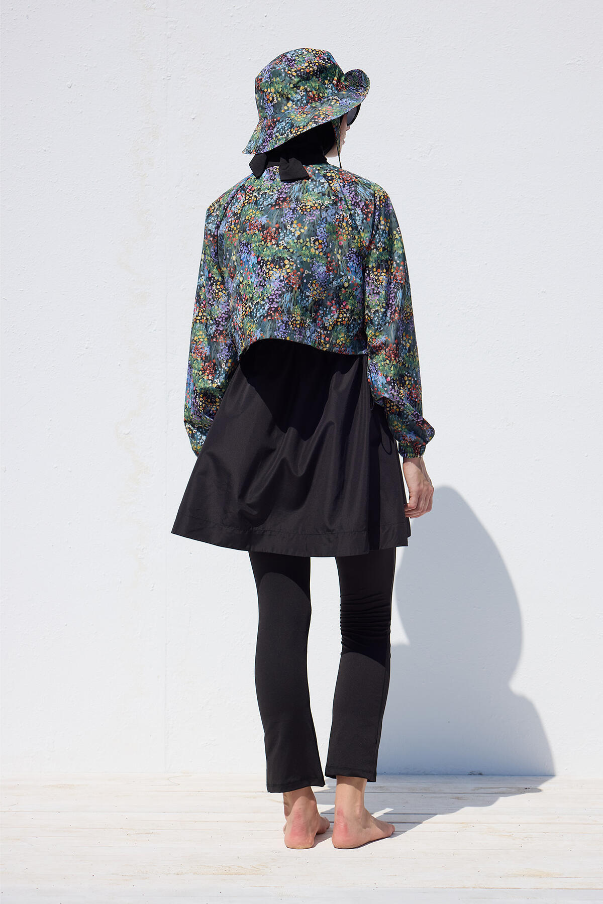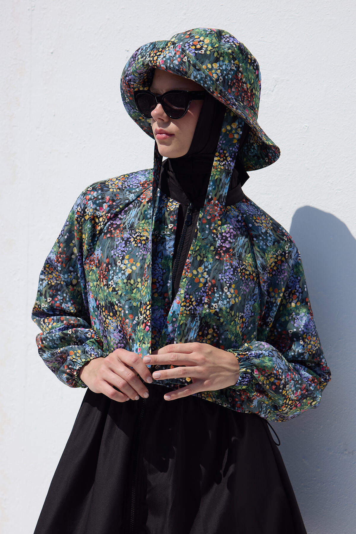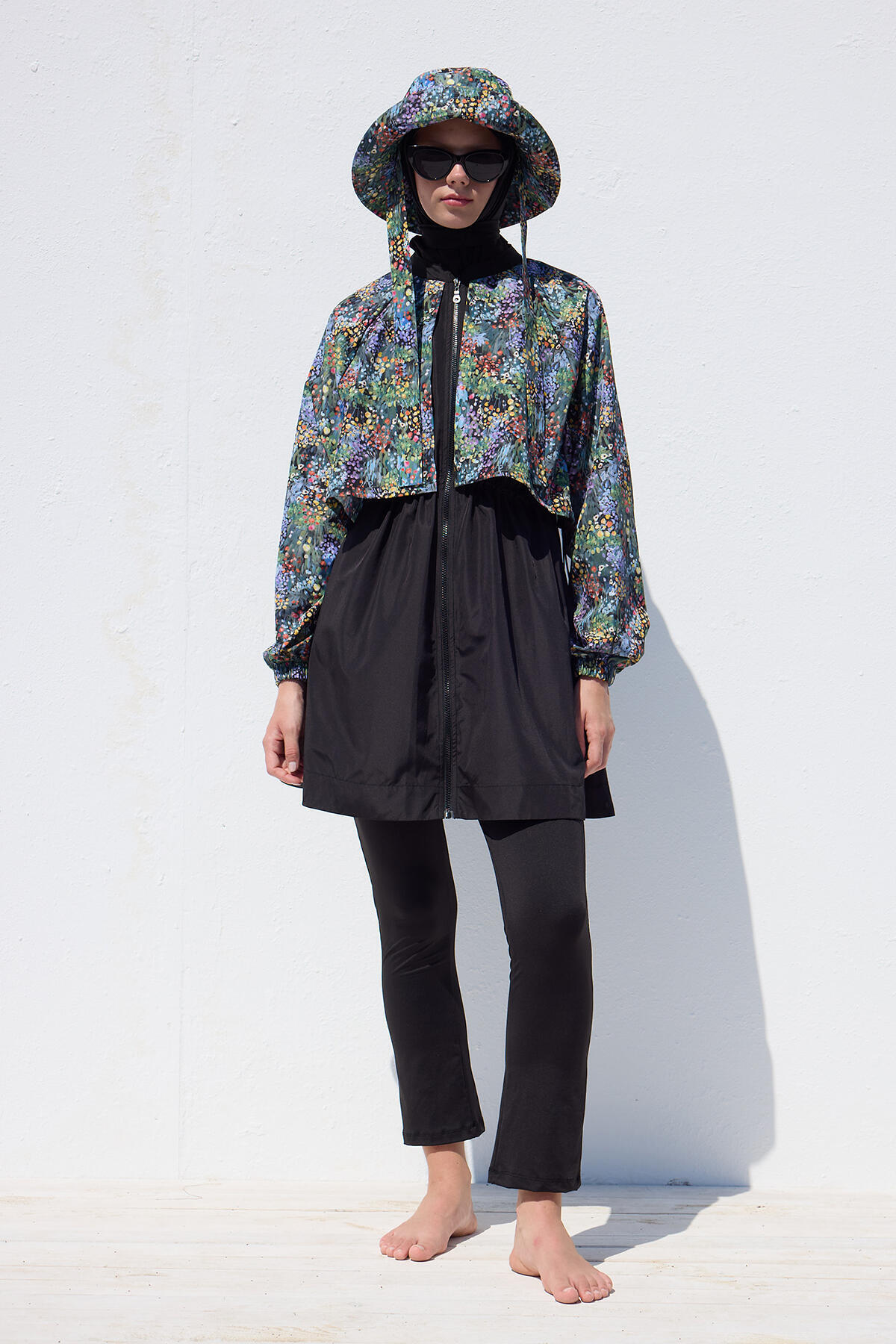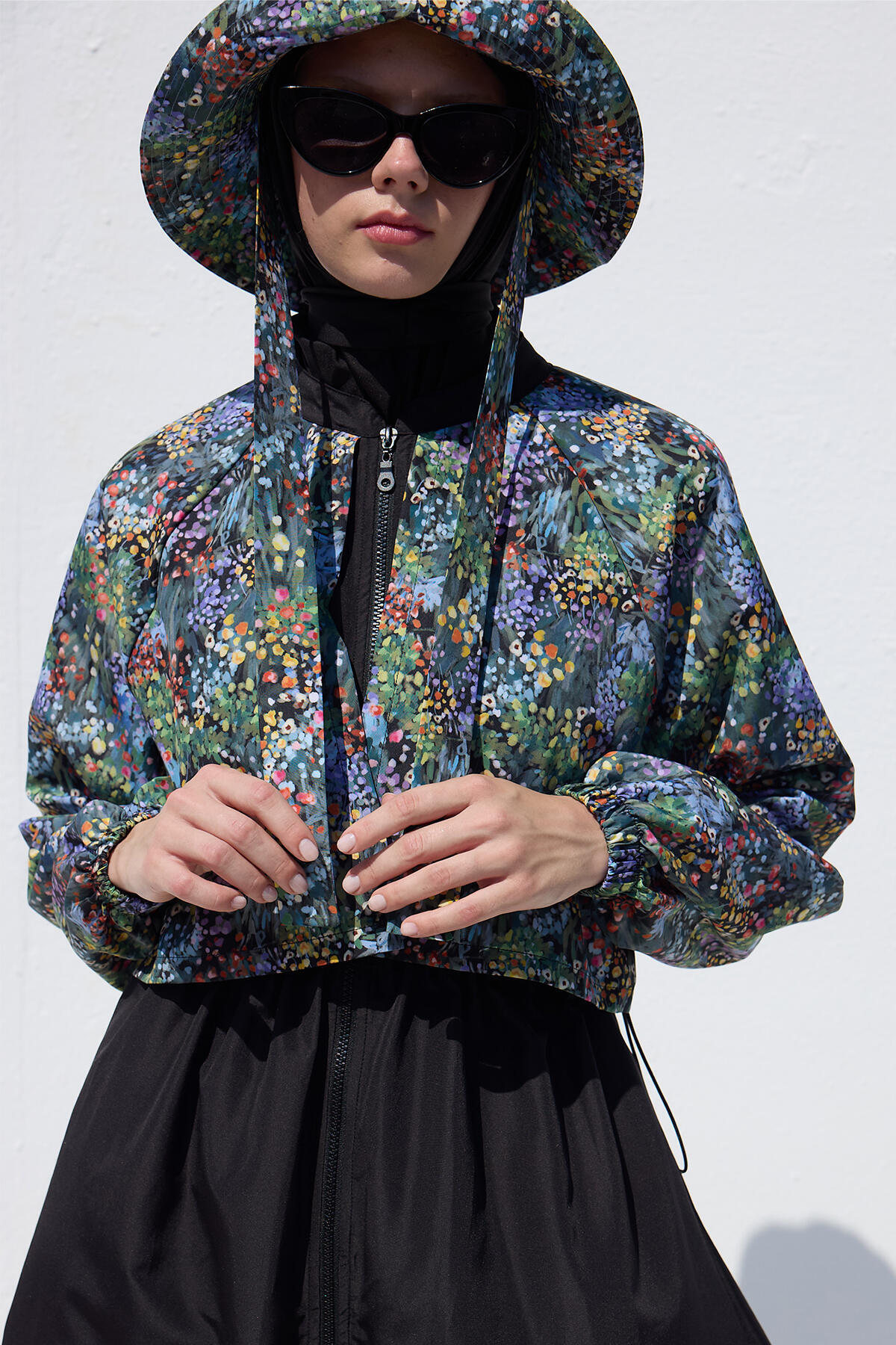 High collar, zipper closure, upper body printed, elastic sleeve end, fast drying woven fabric, elastic waist and stopper.