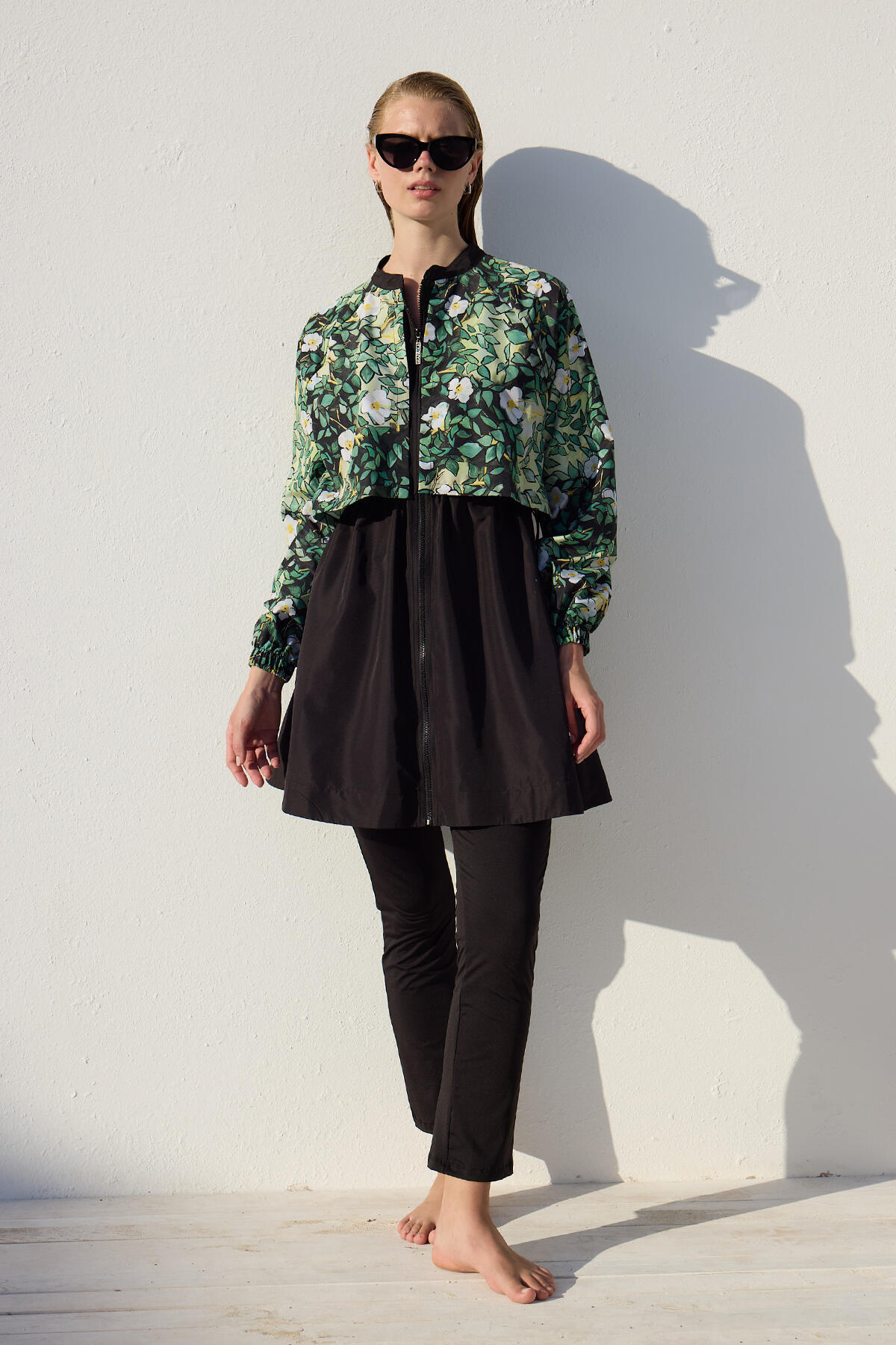 High collar, zipper closure, upper body printed, elastic sleeve end, fast drying woven fabric, elastic waist and stopper.