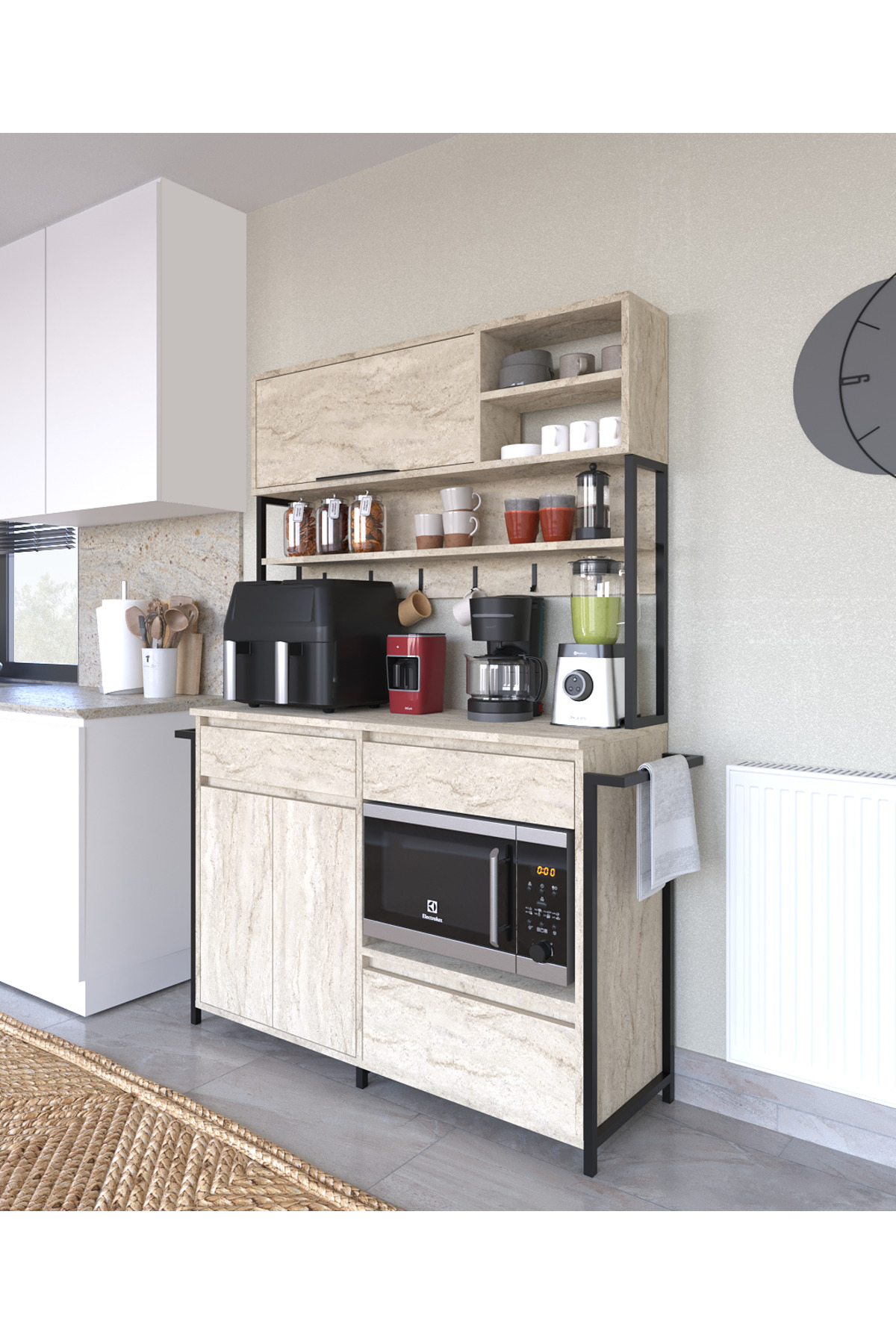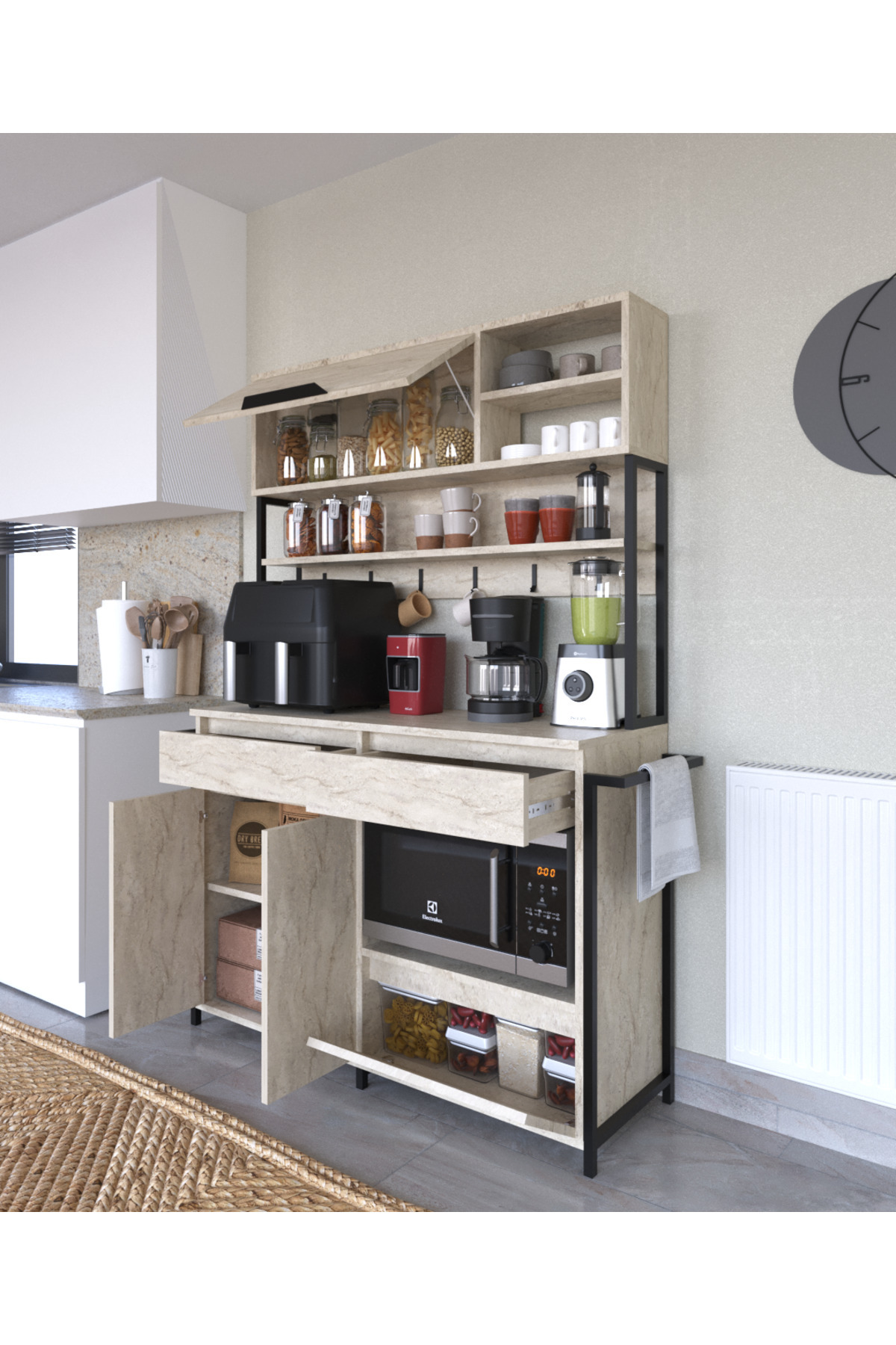 AYMOBSAN Laurel Coffee Corner Multipurpose Cabinet 3 Door 2 Drawer Pantry Kitchen Cabinet Travertine Pattern | ByTR