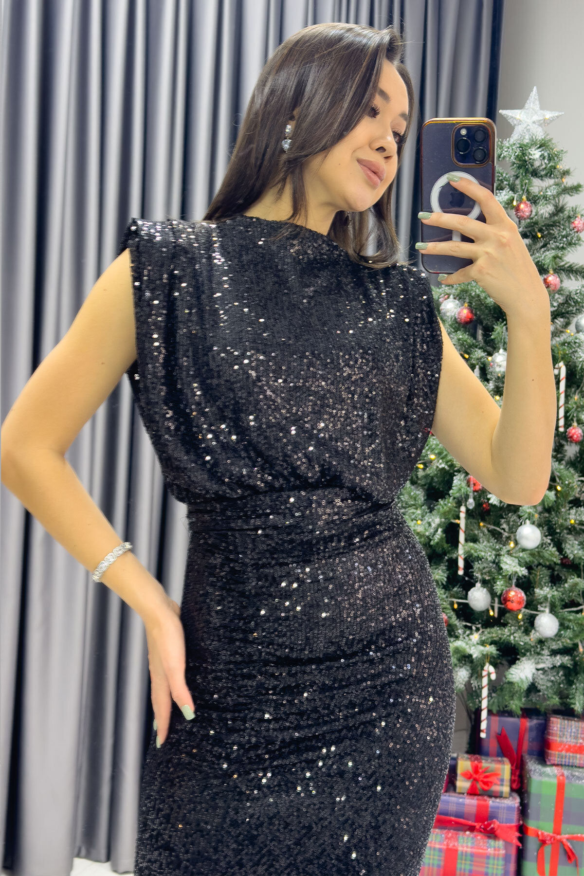 zks grup tekstil Women's Upright Neck Belt Detail Sequin Sequin Dress with Slit Navy Blue, Black, Damson, Powder | ByTR