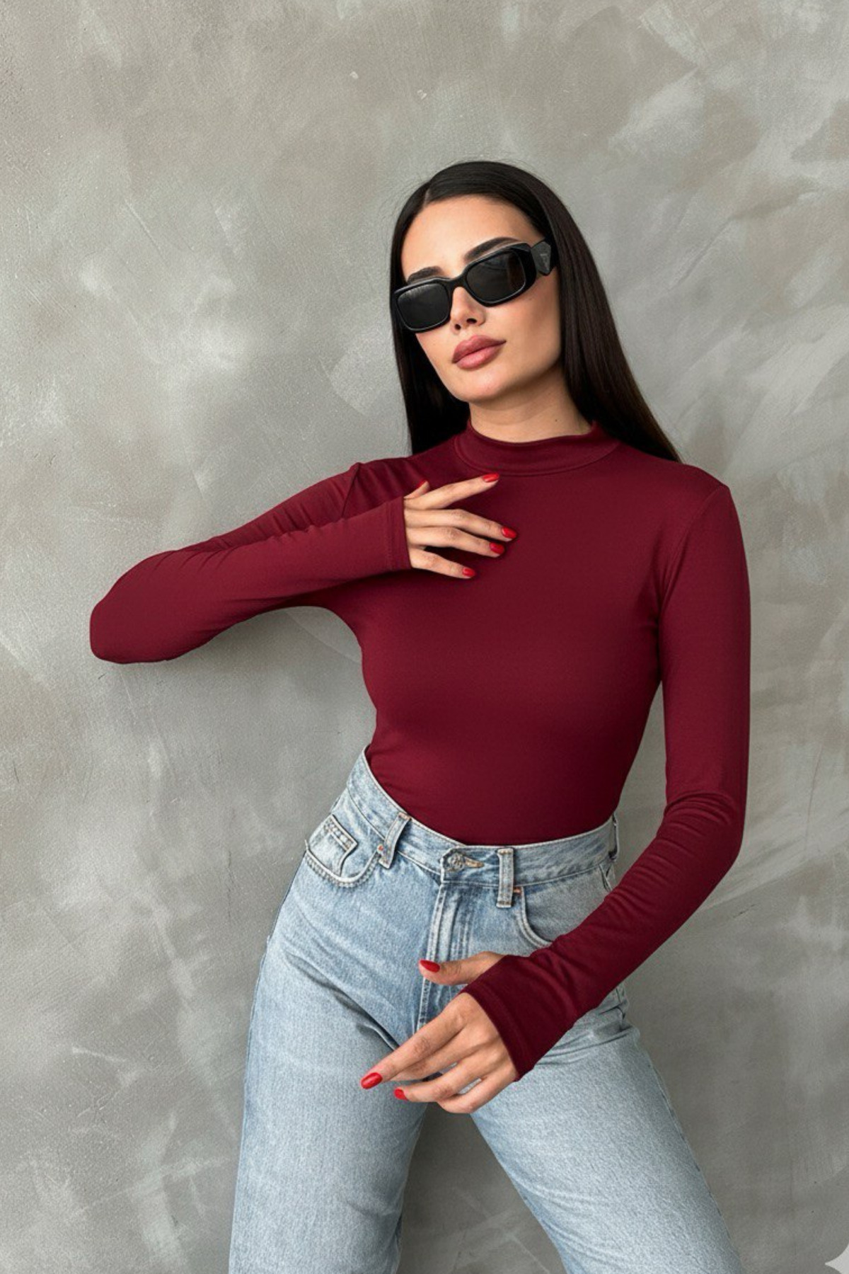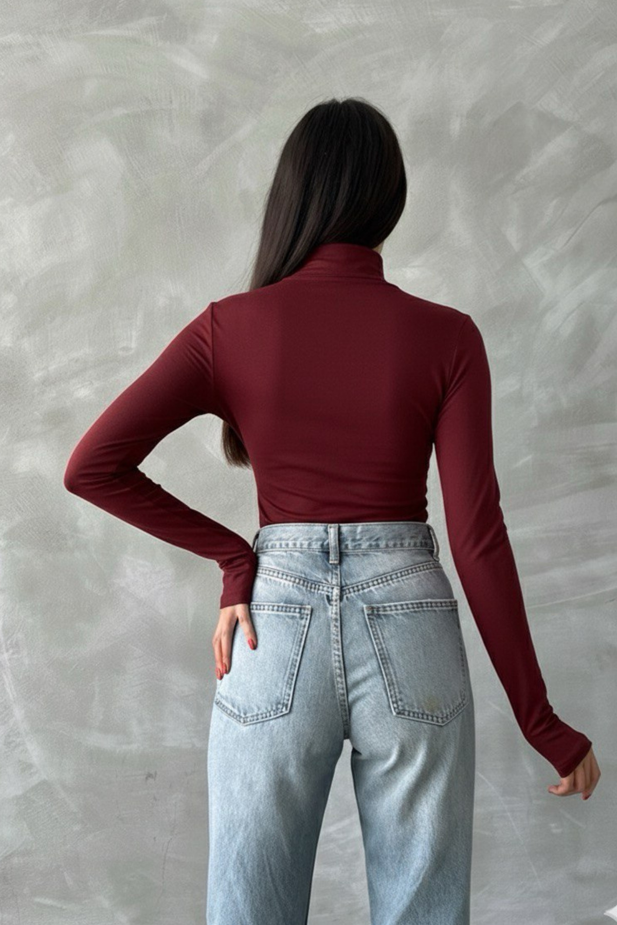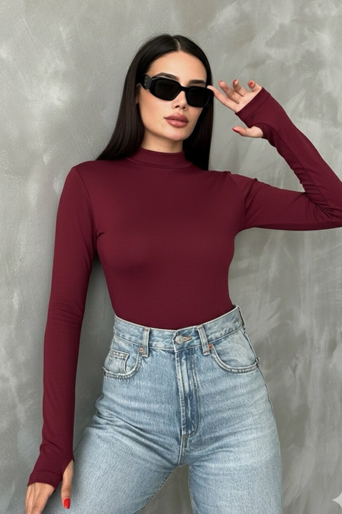 It offers a modern and trendy look with its semi-turtleneck design