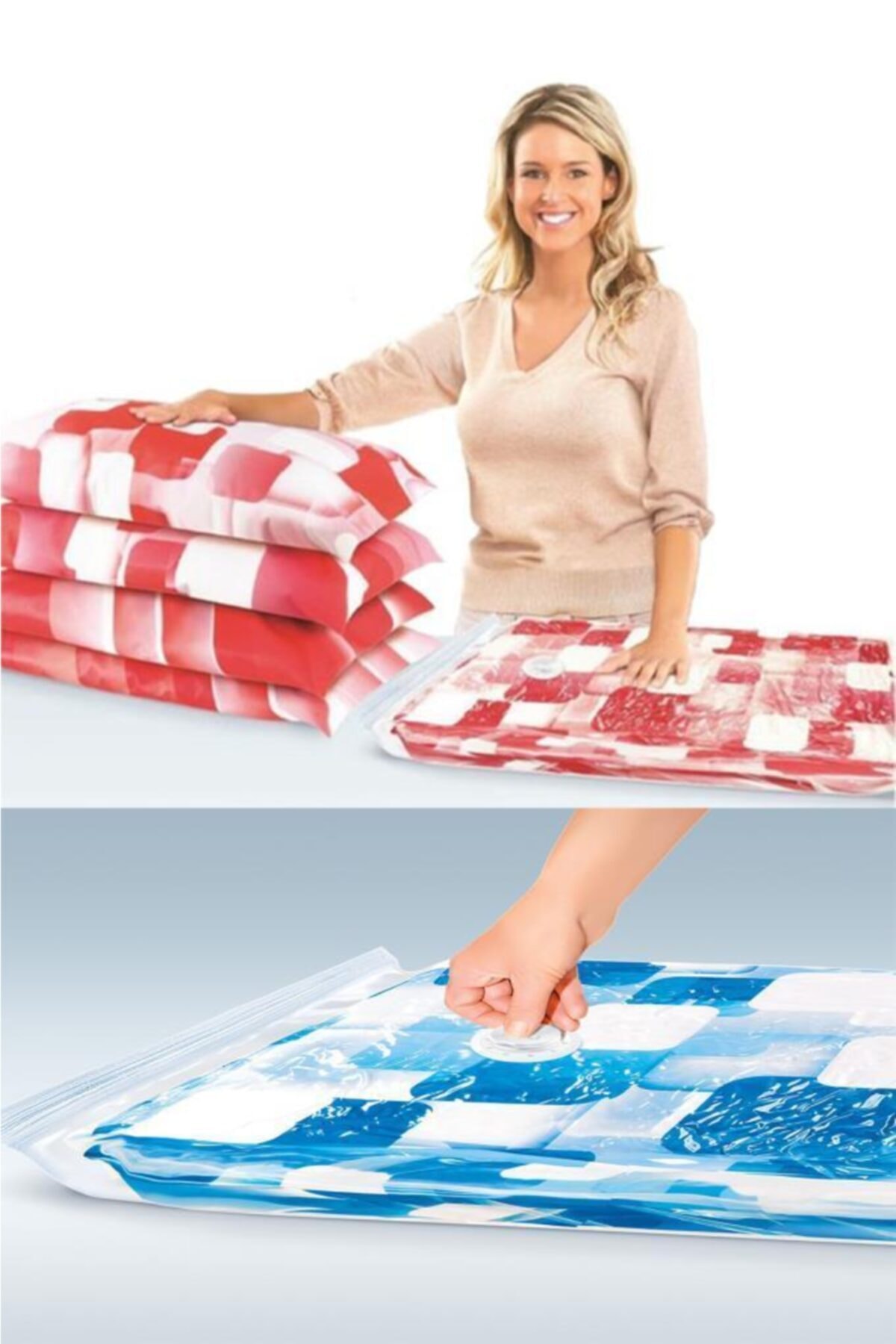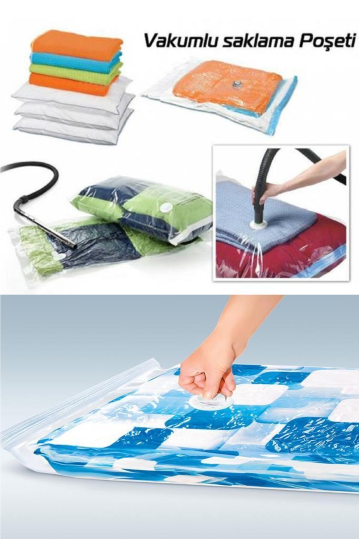 thanks to the fact that it protects your bulky and space-occupying items such as quilts, pillows, sweaters, jackets and delicately compresses them and saves space in your cabinets, it has become the easiest solution to the space problem encountered when placing items in your home. Now it only takes 15 seconds to do it. All products you vacuum must be clean and dry. Carefully fold each piece and stack it neatly and place it in the bag. Do not overfill the pouch. Leave a minimum distance of 10 cm at the edge of the closure to ensure density. It is only possible to store your belongings in small sizes by vacuuming with any vacuum cleaner. Product Features : * * One-way valve and biaxial nylon/polyethylene completely protect your items from water, dirt, mold, insects and bad odors. * * You can place your clothes, duvets, pillows and other clothing items in the bag regularly. * * You must close the bag by sliding the closure clip from one end of the bag opening to the other at least 2 or 3 times and gently pressing. * * After shooting all the air, you can turn the red arrow to the closed position and put it in place. * * Vacuum storage bags can be used at home or on the go. * * The vacuum bag system combines three sophisticated technologies to create an airtight closure system