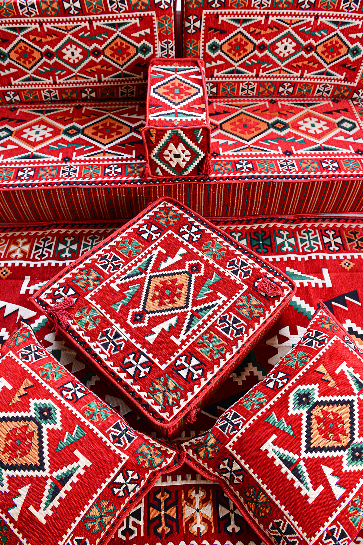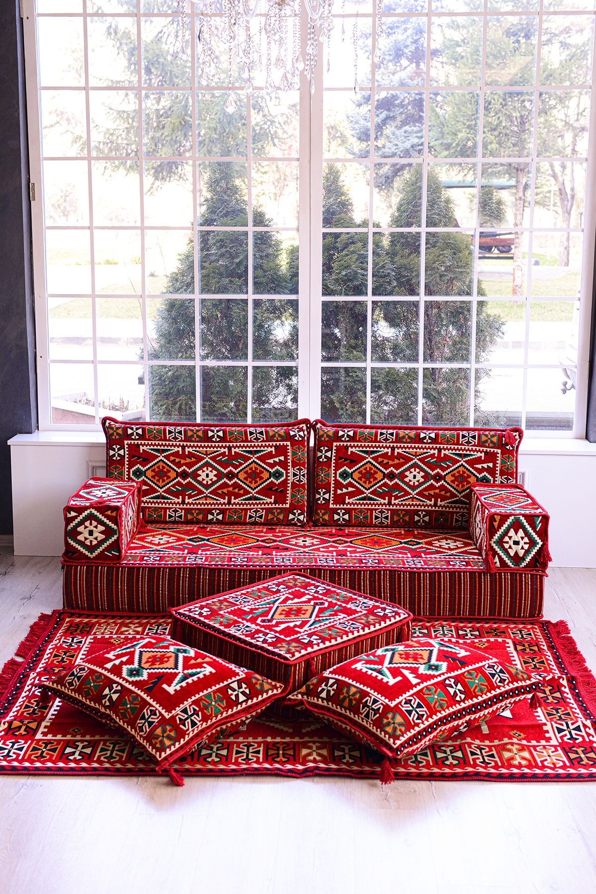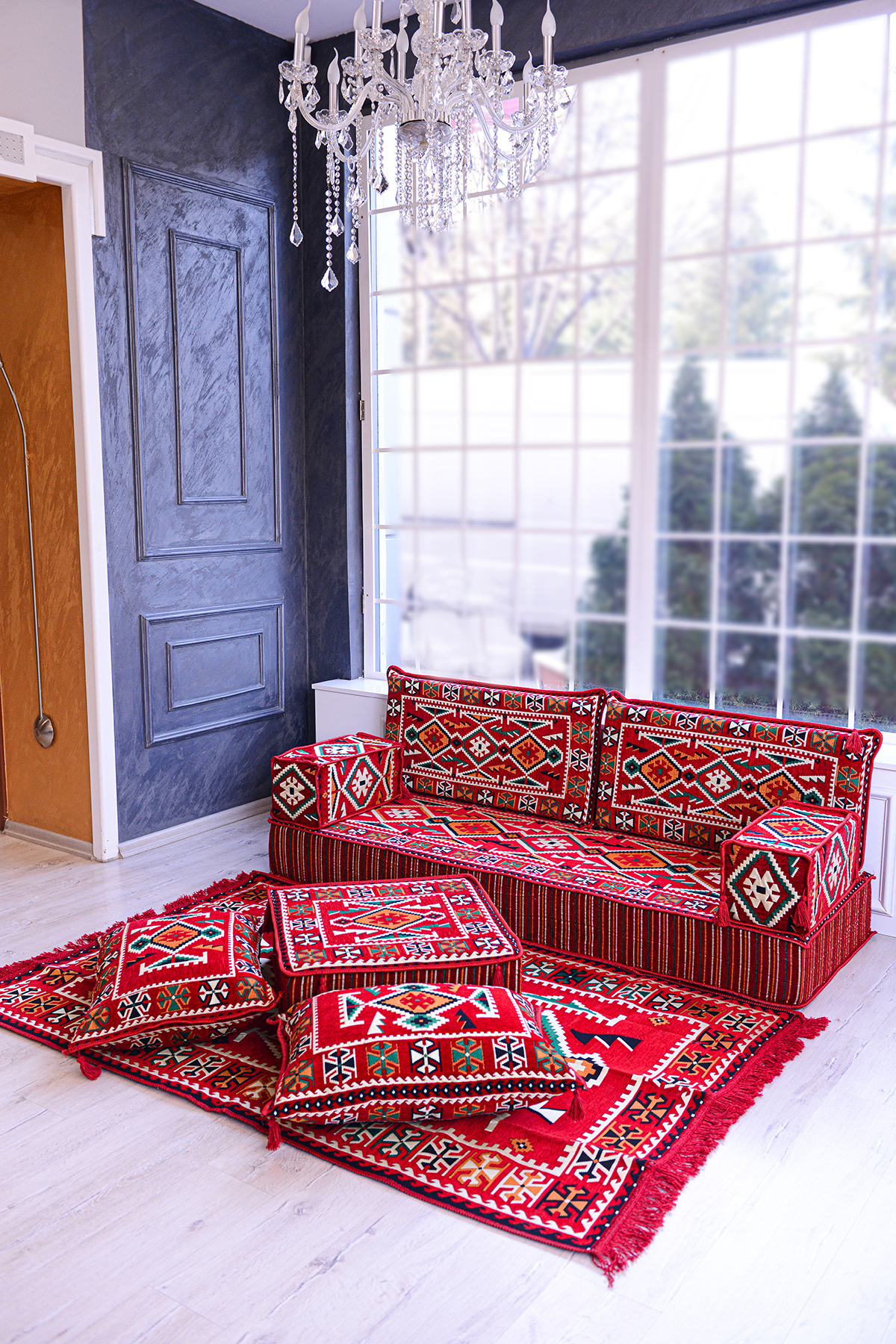 It consists of a total of 9 pieces, including 1 long sitting cushion (70 x 190 x 20 cm), 2 back cushions (42 x 92 x 10 cm) , 2 armrest cushions (22 x 22 x 50 cm), 1 ottoman sponge puff table (60 x 60 x 20 cm), 2 filled floor cushions (45 x 65 cm) and 1 rug ( 120 cm x 180 cm ).