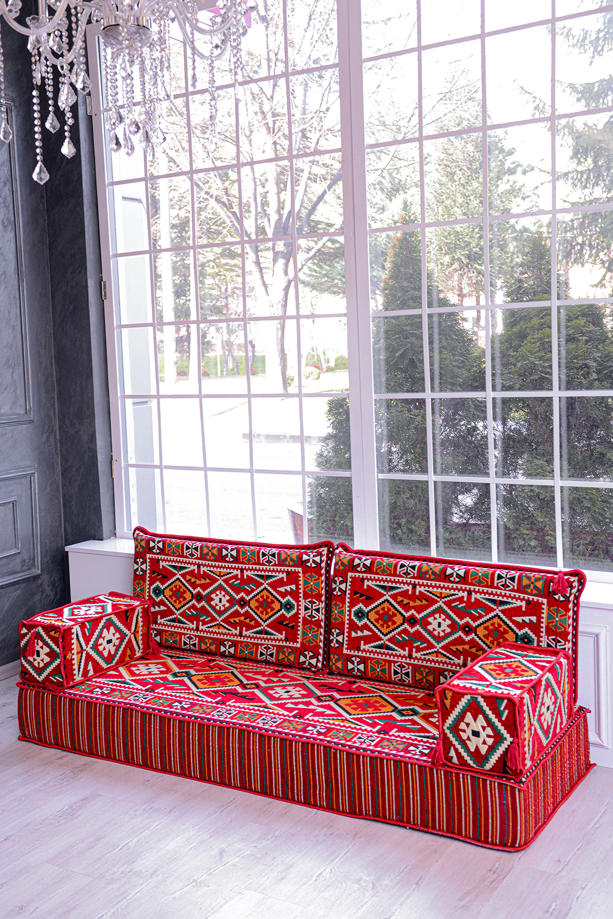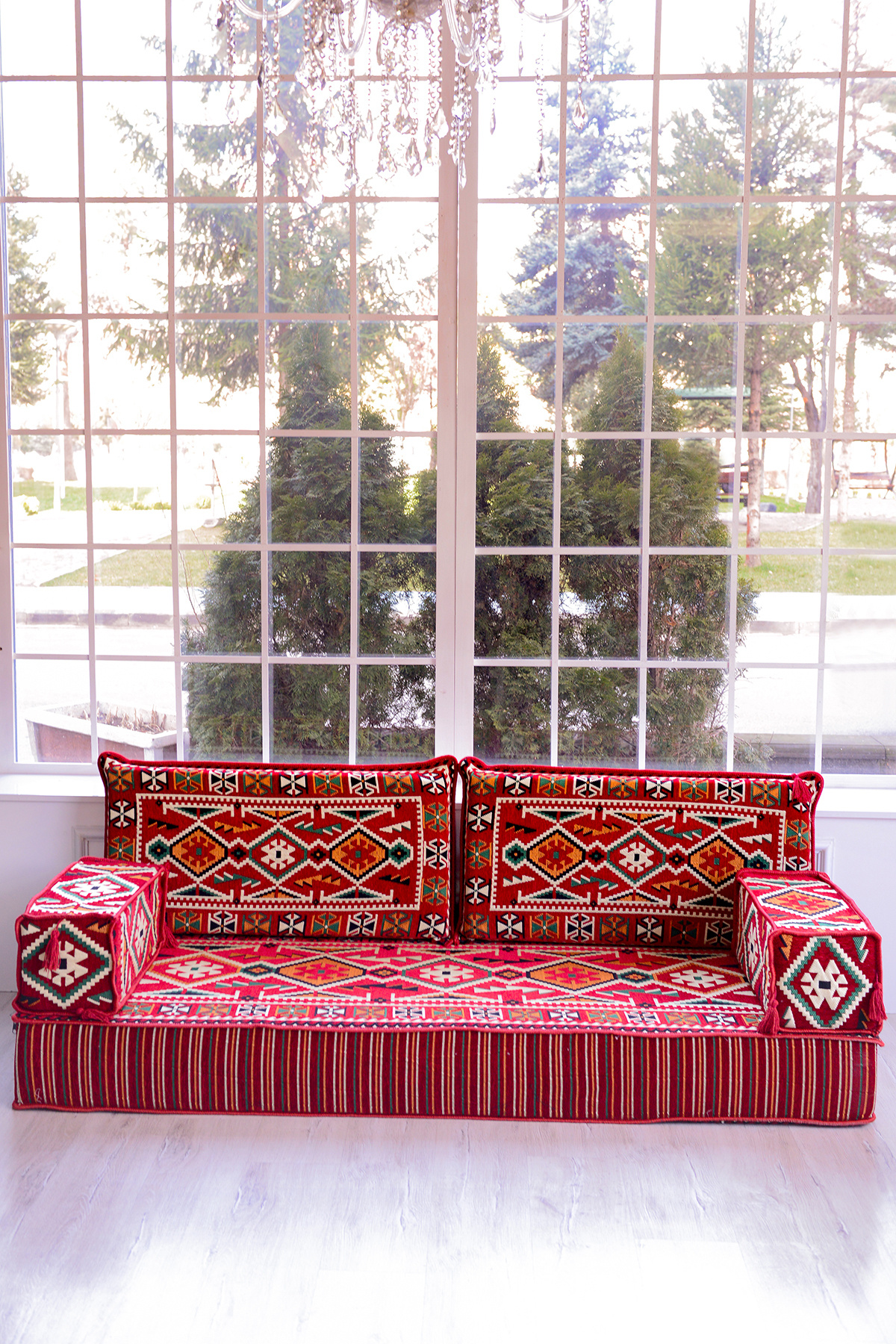 It consists of 5 pieces in total: 1 long sitting cushion (70 x 190 x 20 cm), 2 back cushions (42 x 92 x 10 cm) , 2 armrest cushions (22 x 22 x 50 cm).