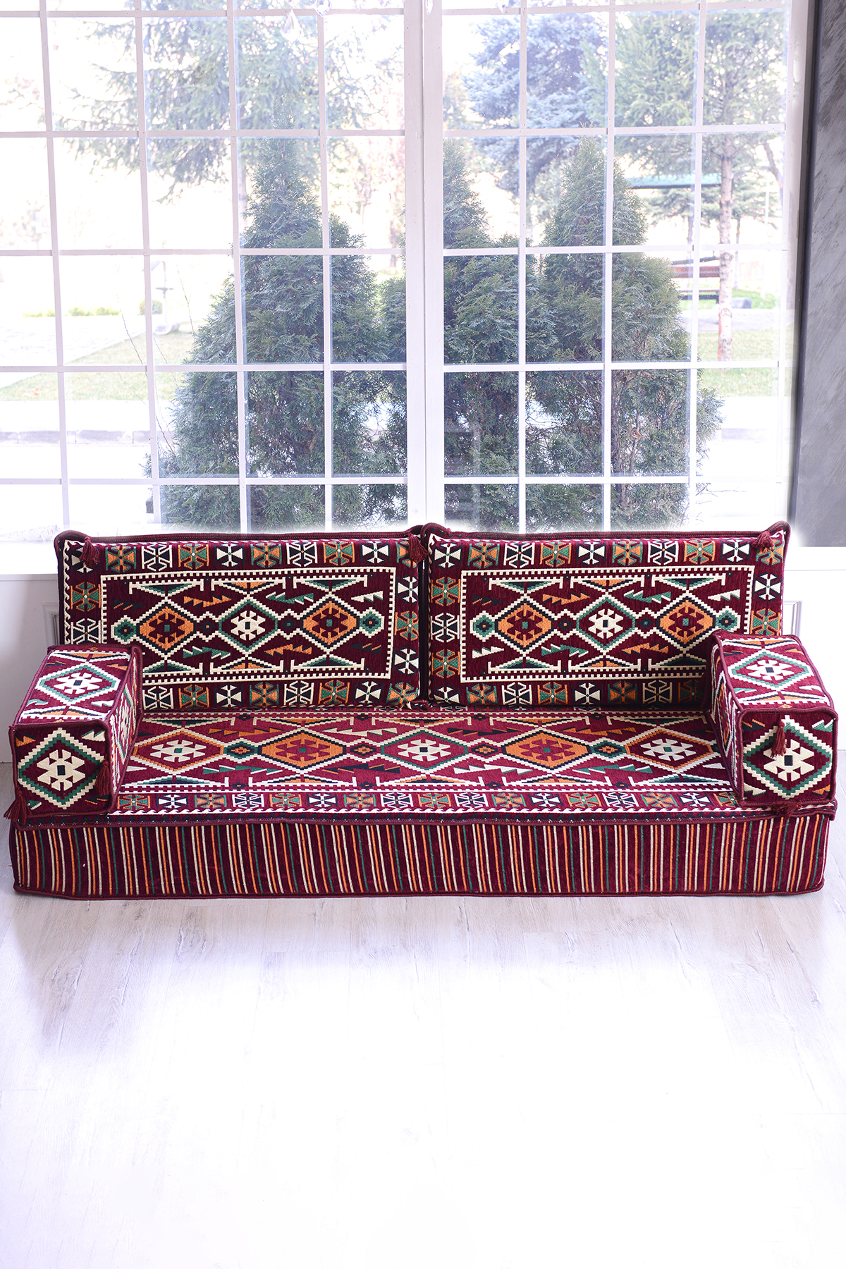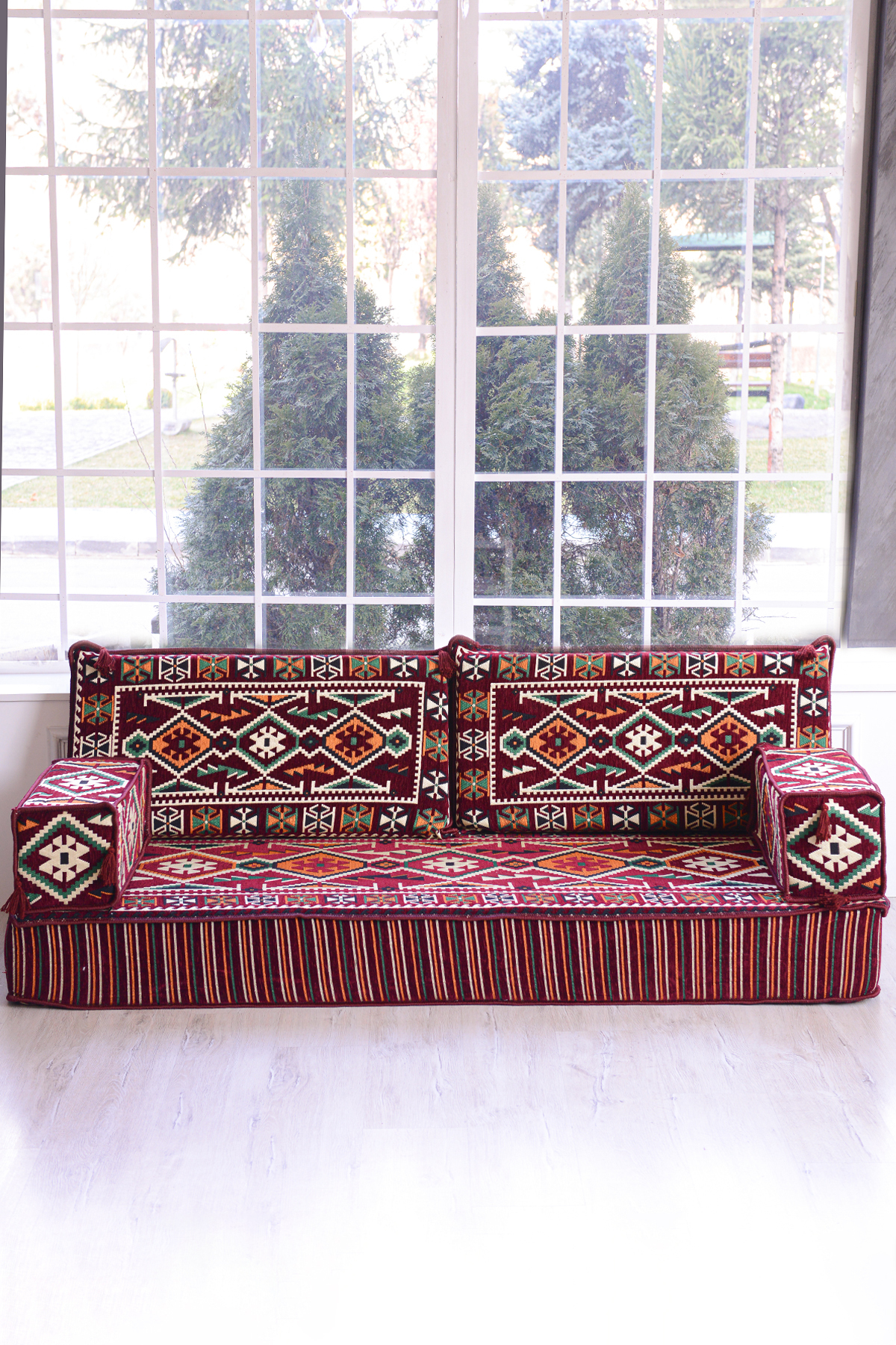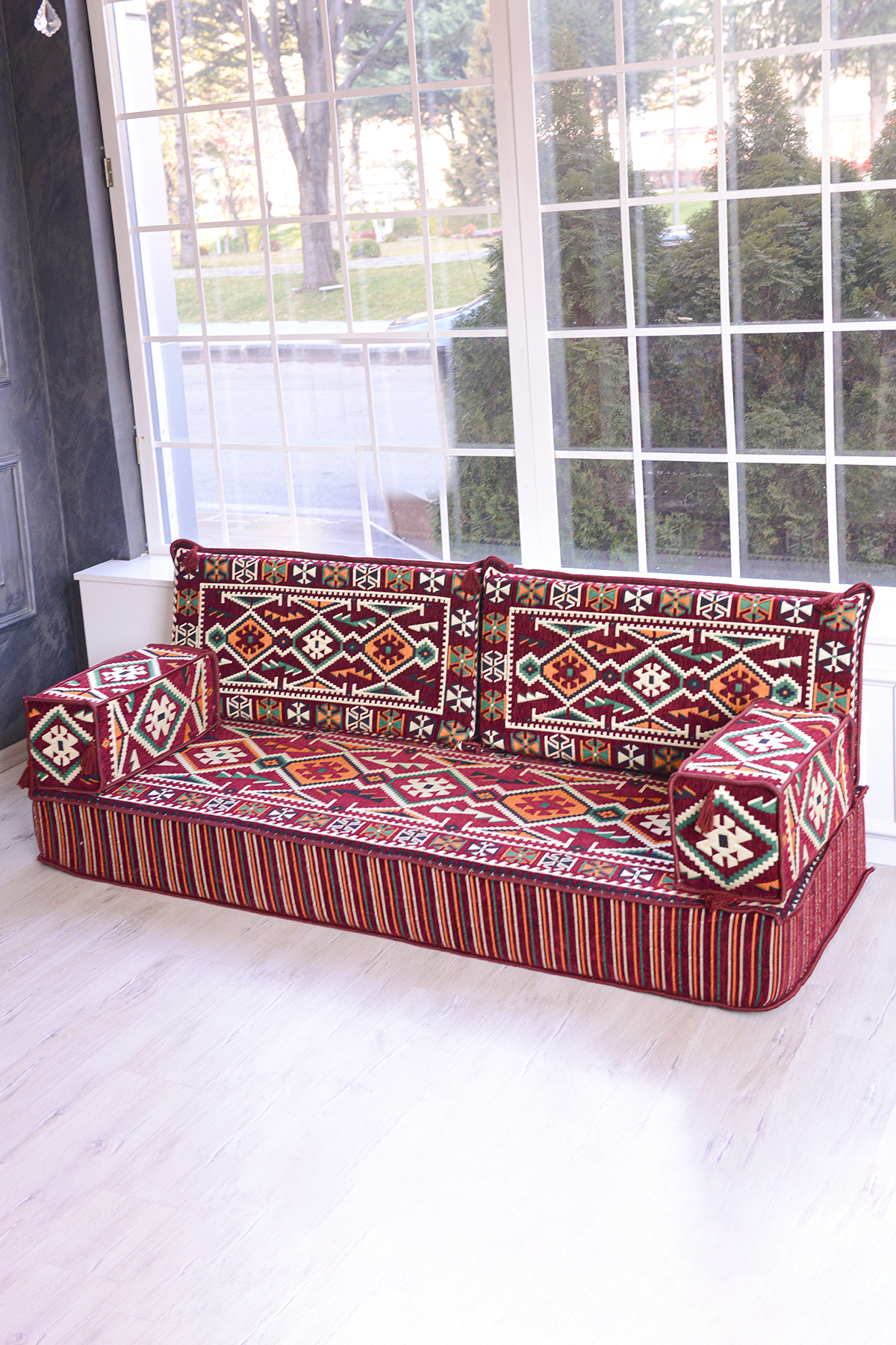 It consists of 5 pieces in total: 1 long sitting cushion (70 x 190 x 20 cm), 2 back cushions (42 x 92 x 10 cm) , 2 armrest cushions (22 x 22 x 50 cm).