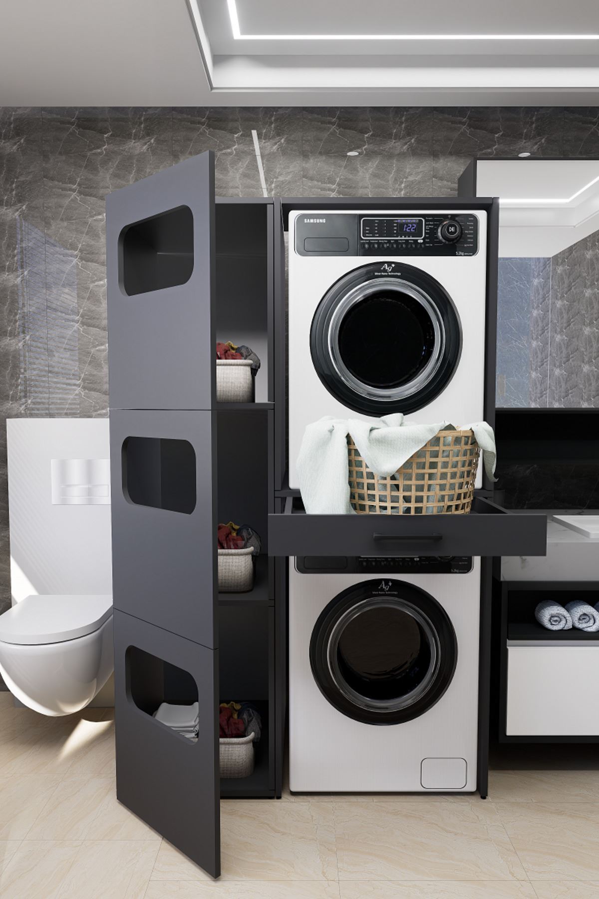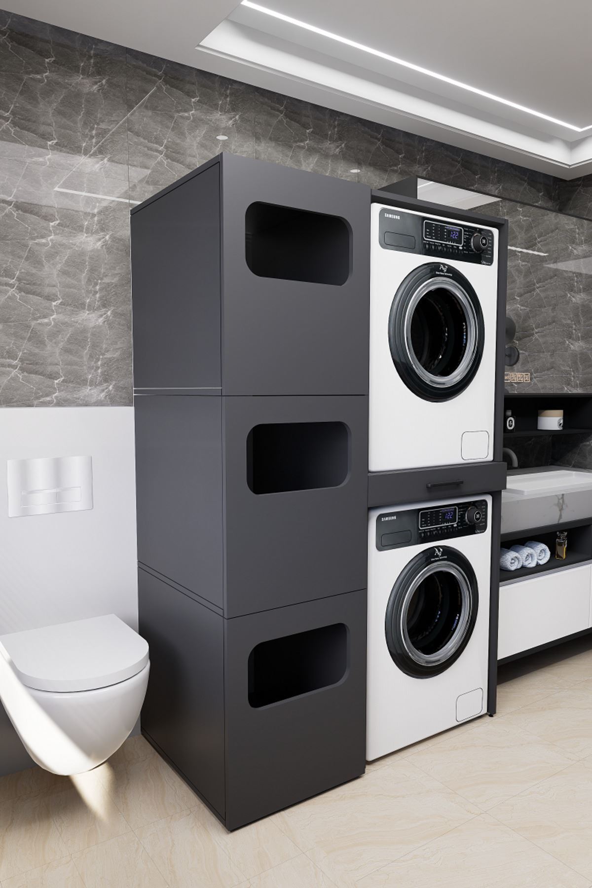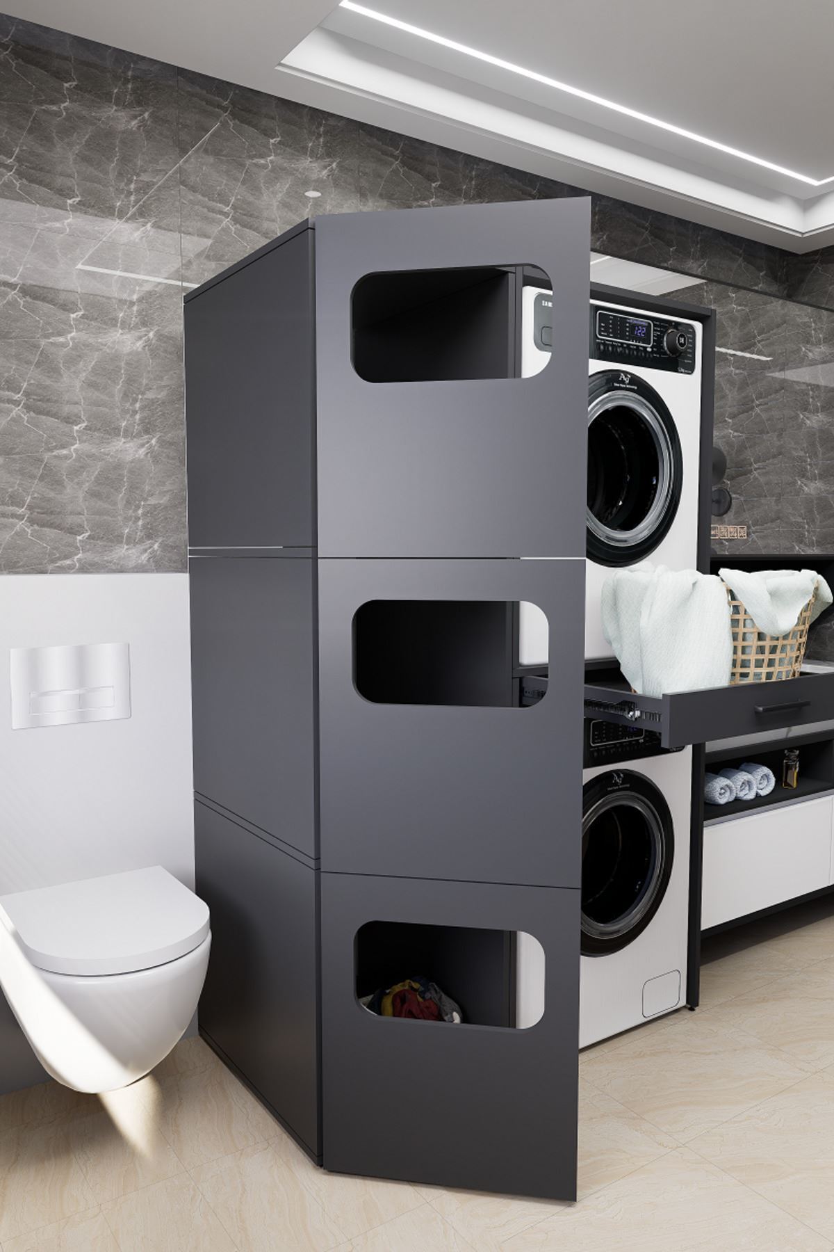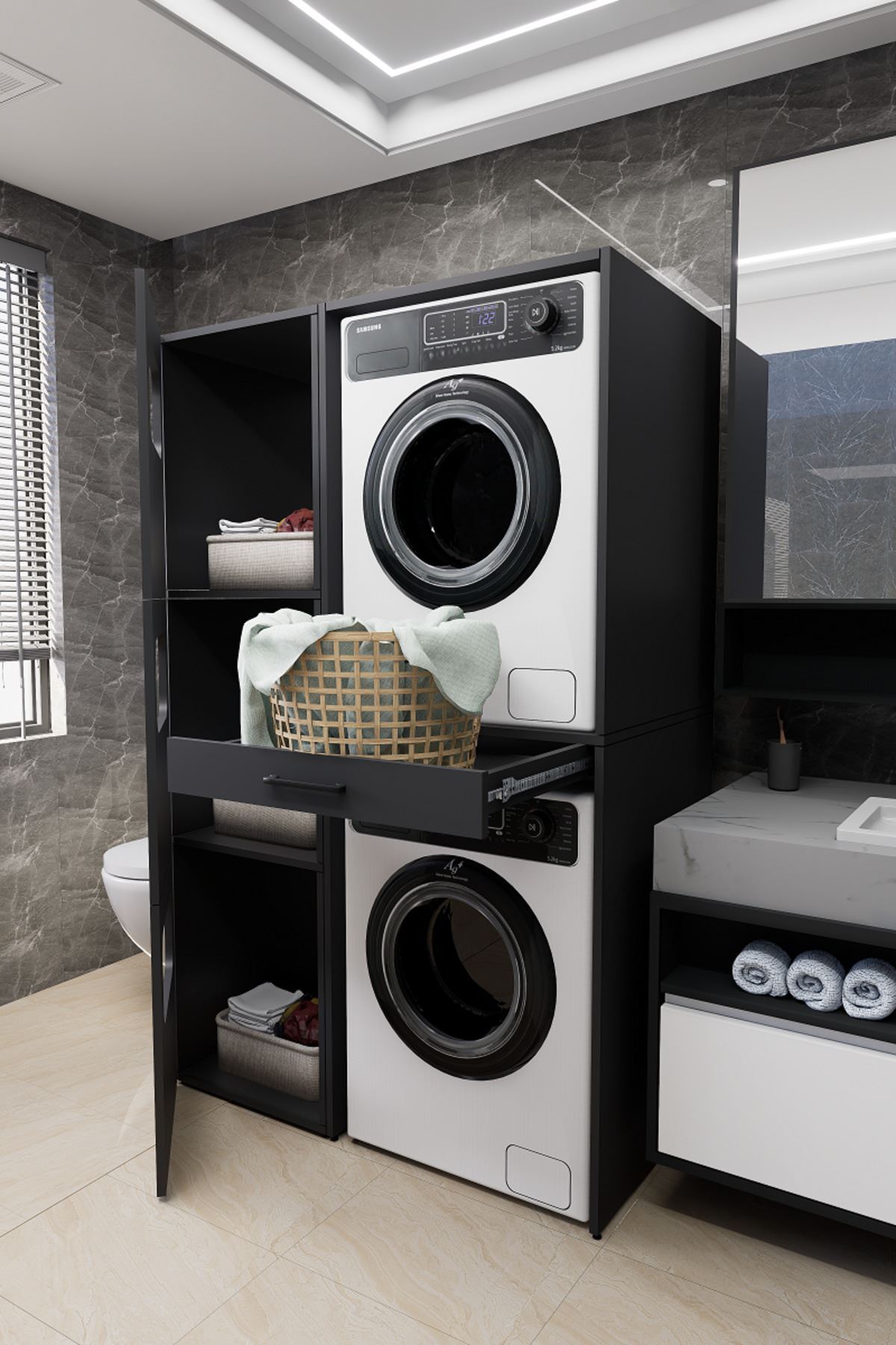 Mirobi WashBox adds order and elegance to your bathroom while creating an aesthetic storage space for your washing machines and dryers.