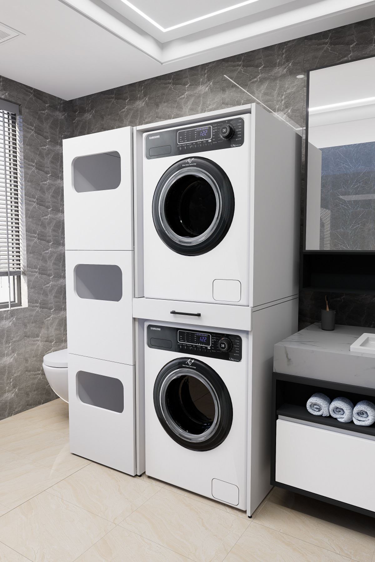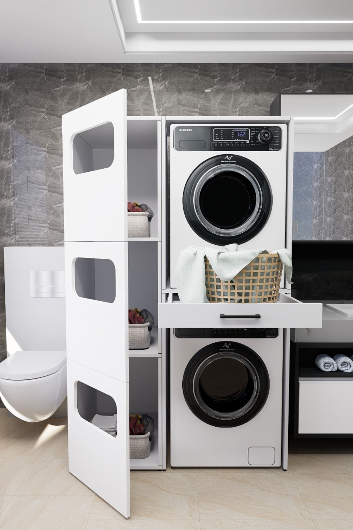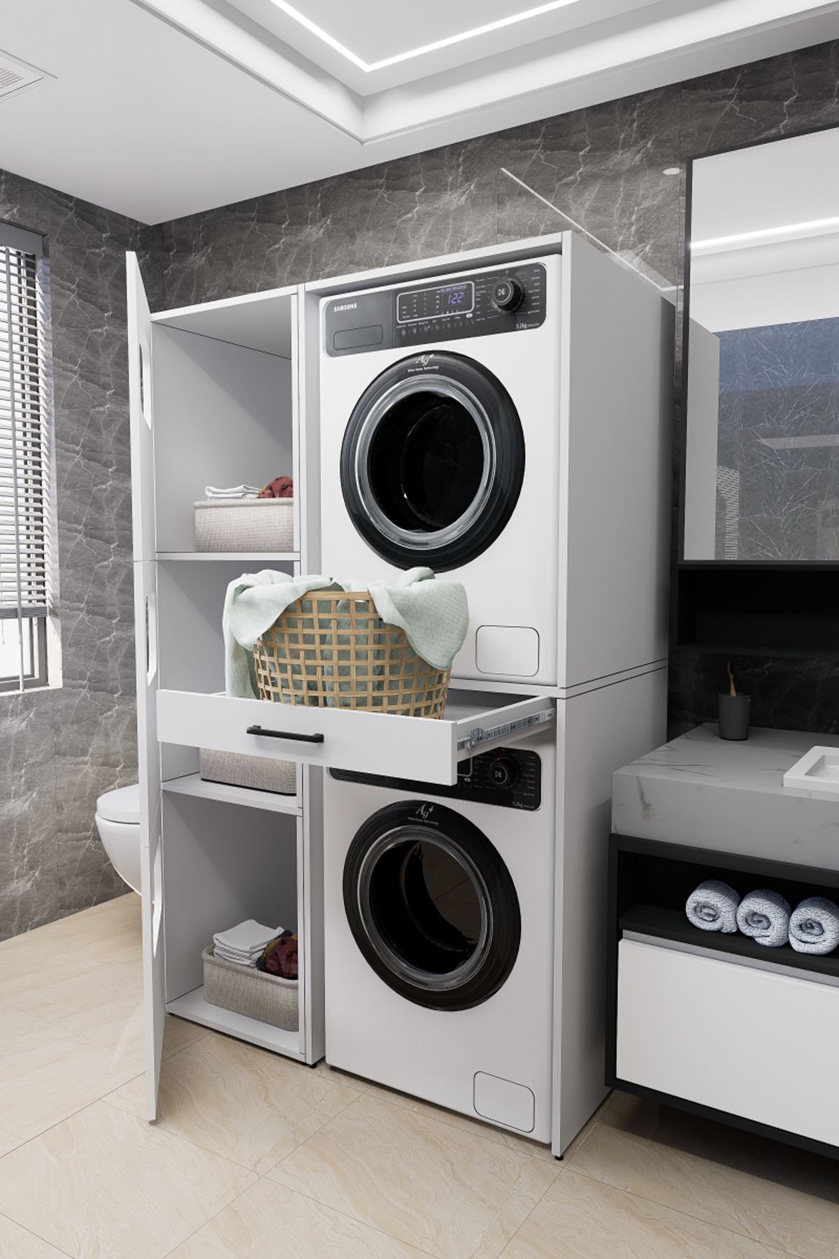 Mirobi WashBox adds order and elegance to your bathroom while creating an aesthetic storage space for your washing machines and dryers.