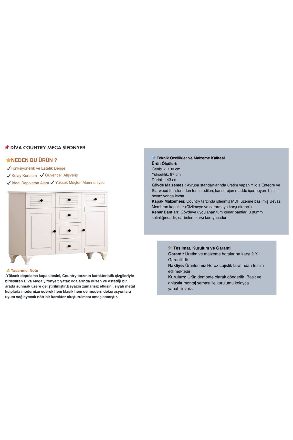 Diva Country Mega Dresser Features Product Dimensions · • 87cm height · • 130cm width · • 43cm depth.