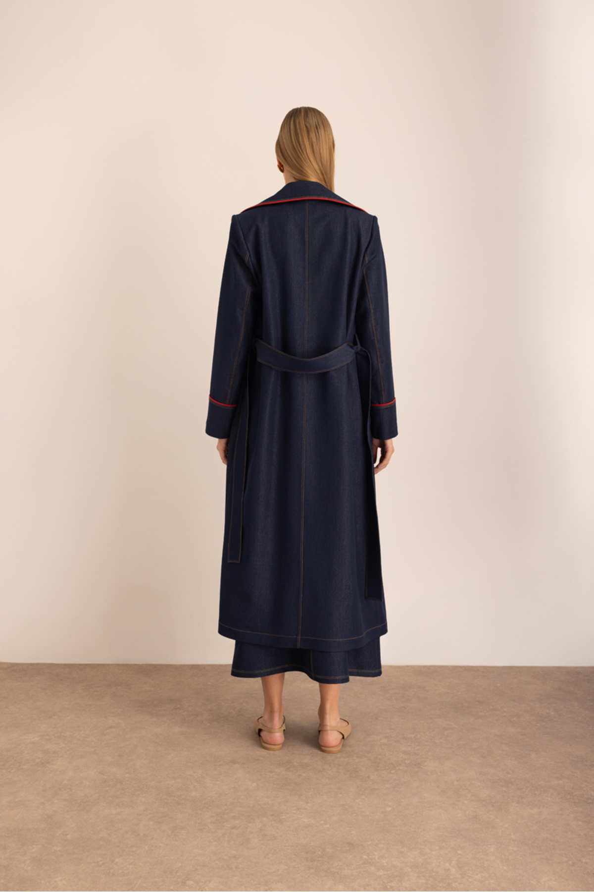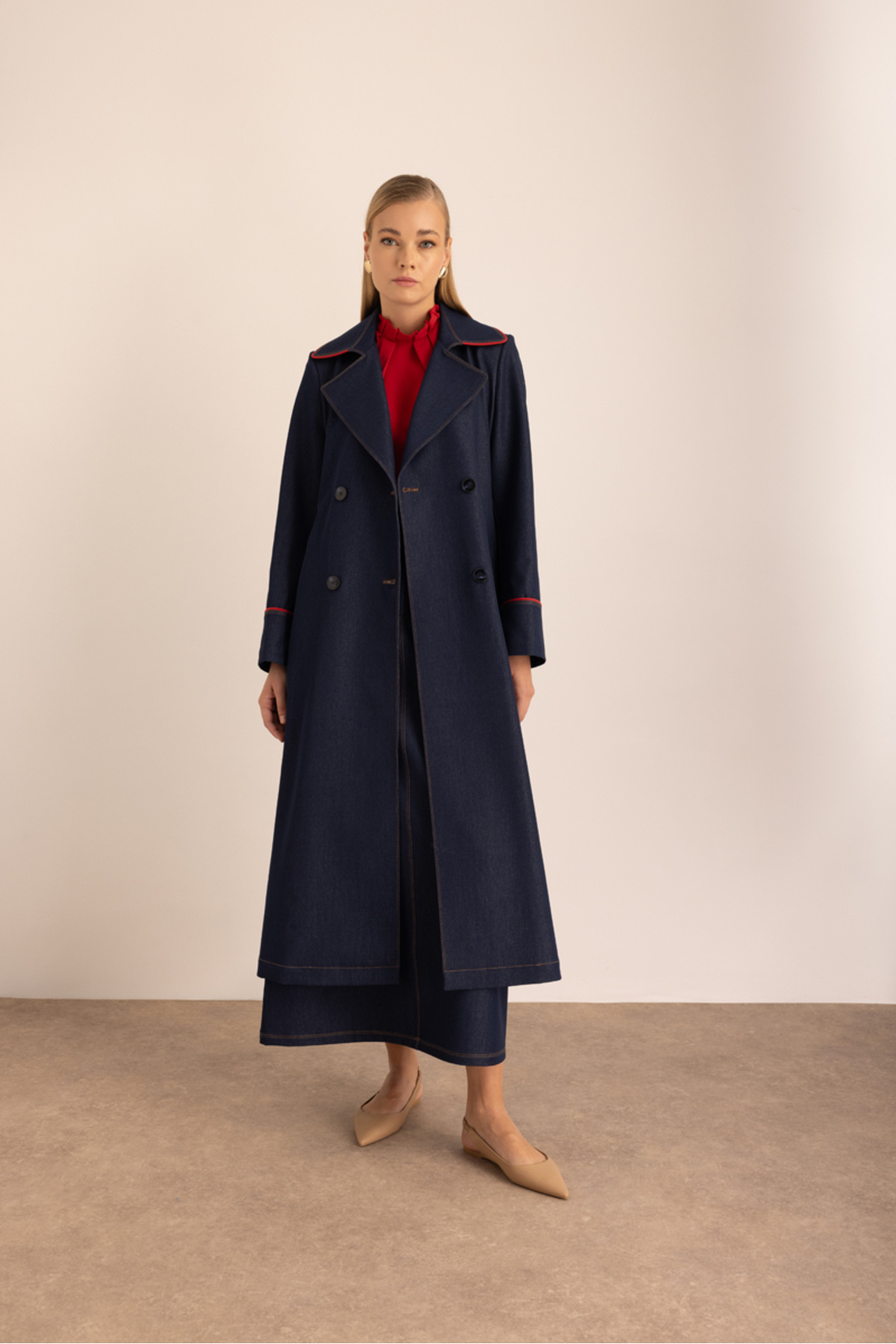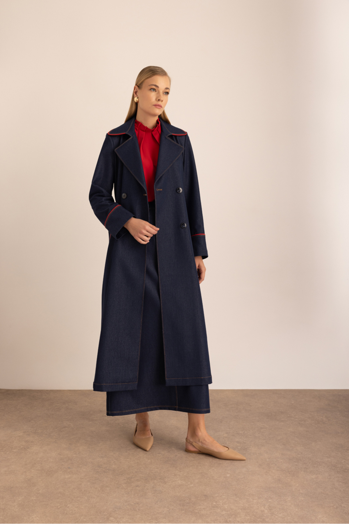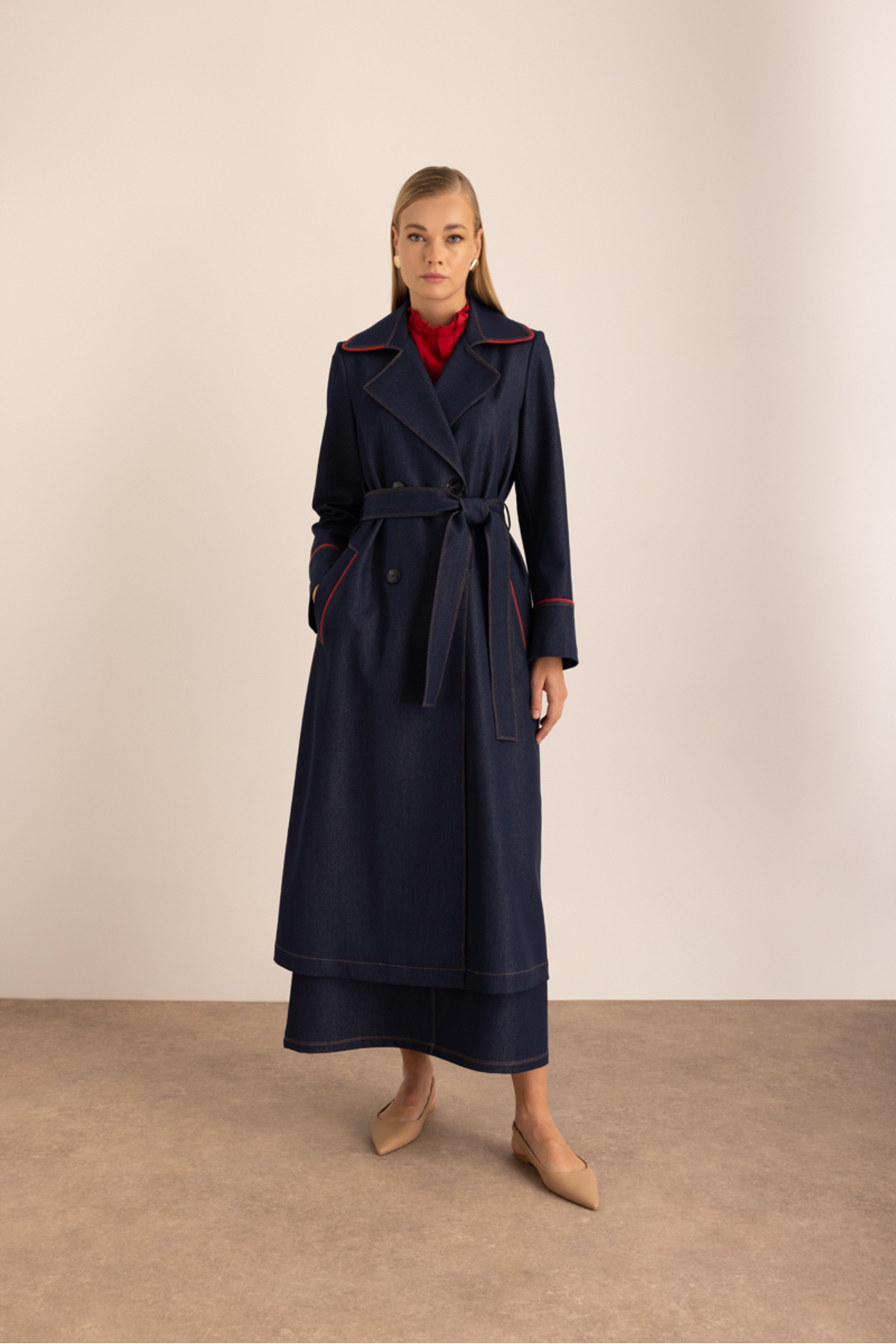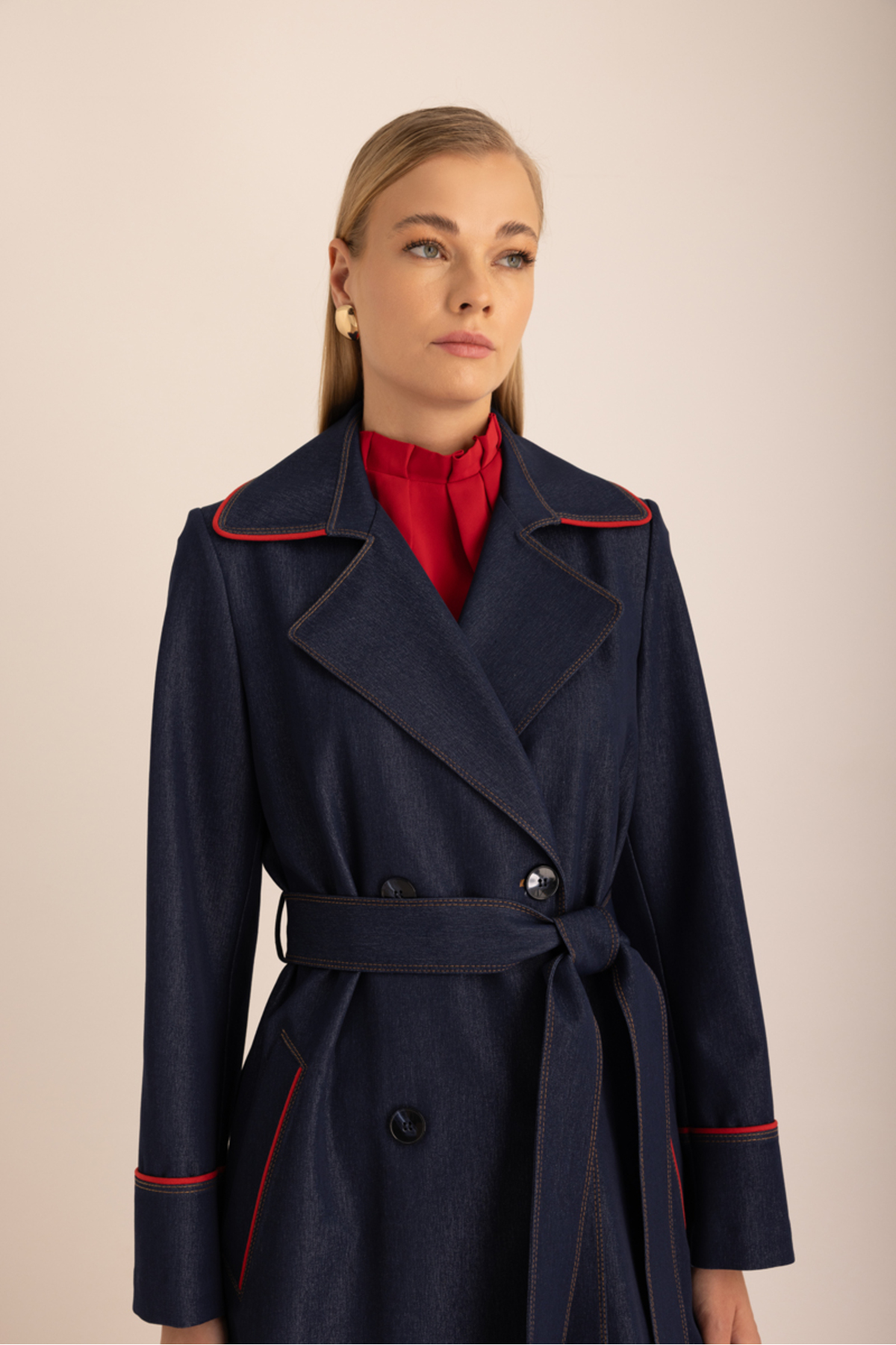 73% PES 22% VİS 6% EA Fabric Blend Main Fabric : 22% VISCOSE, Main Fabric: 5% ELASTANE, Main Fabric : 73% PES Do not wash Do not WASH Do NOT USE BLEACH No drying DRUM DRYING Iron ironed AT MAXIMUM 110°C DRY CLEANING CAN BE DONE Denim look, tie, buttoned trench coat