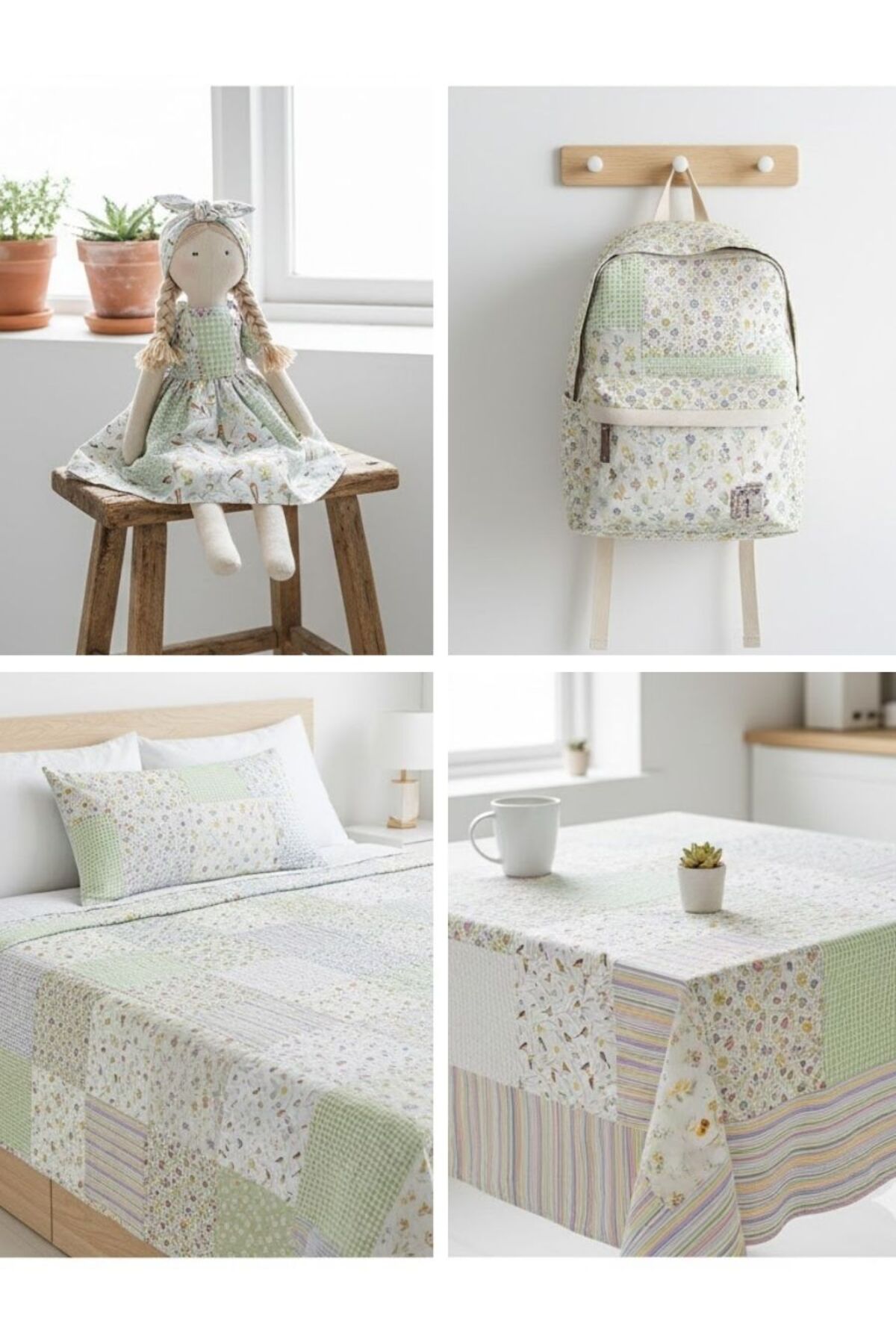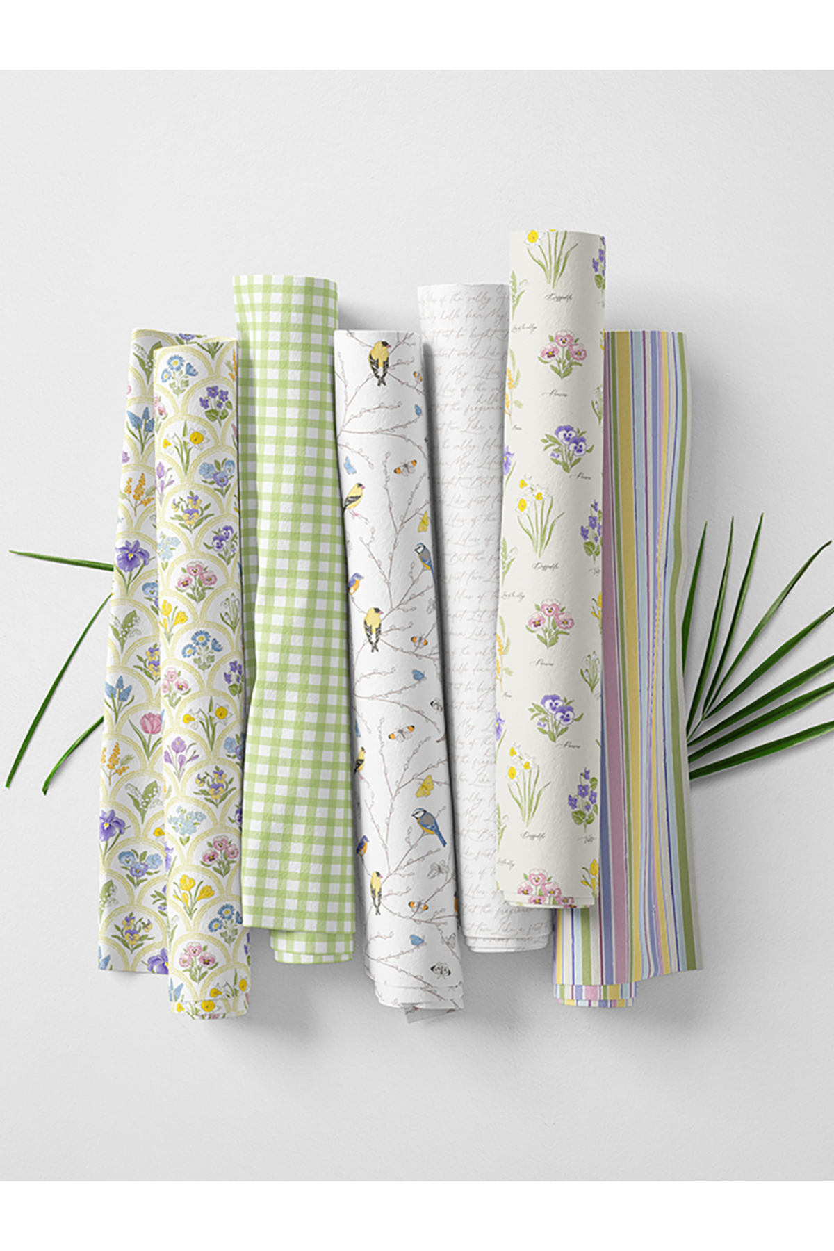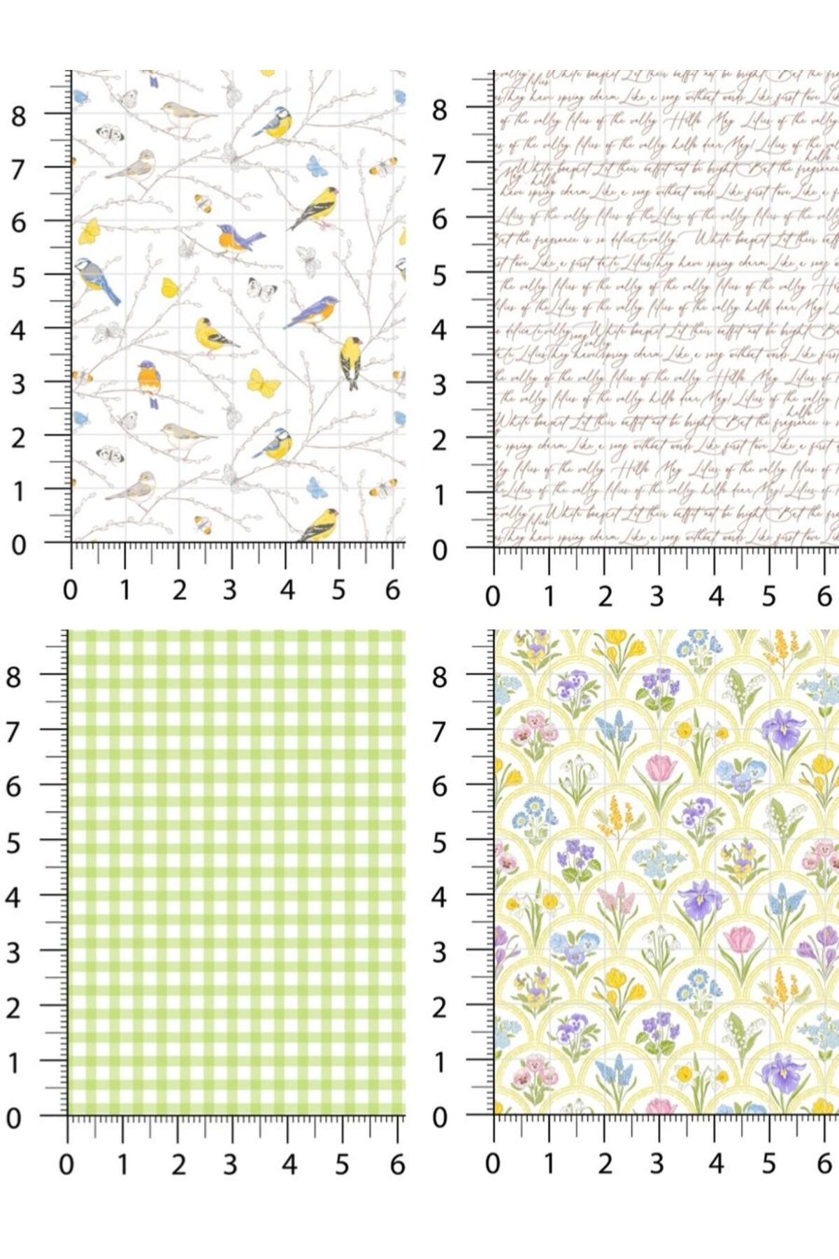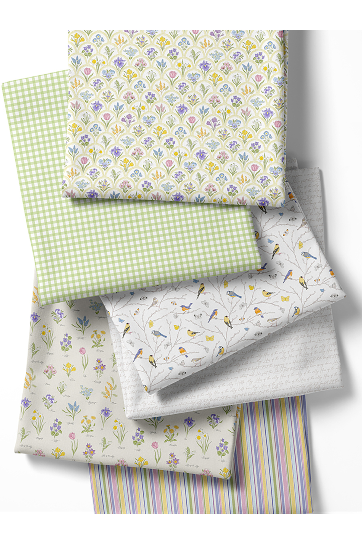 Cotton fabric set decorated with spring-themed bird and flower patterns, offering an eye-catching look.