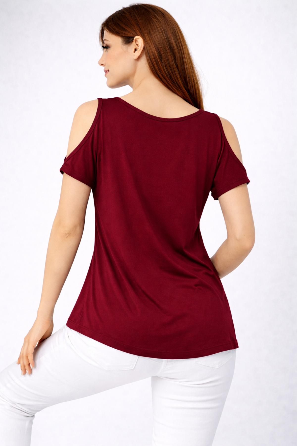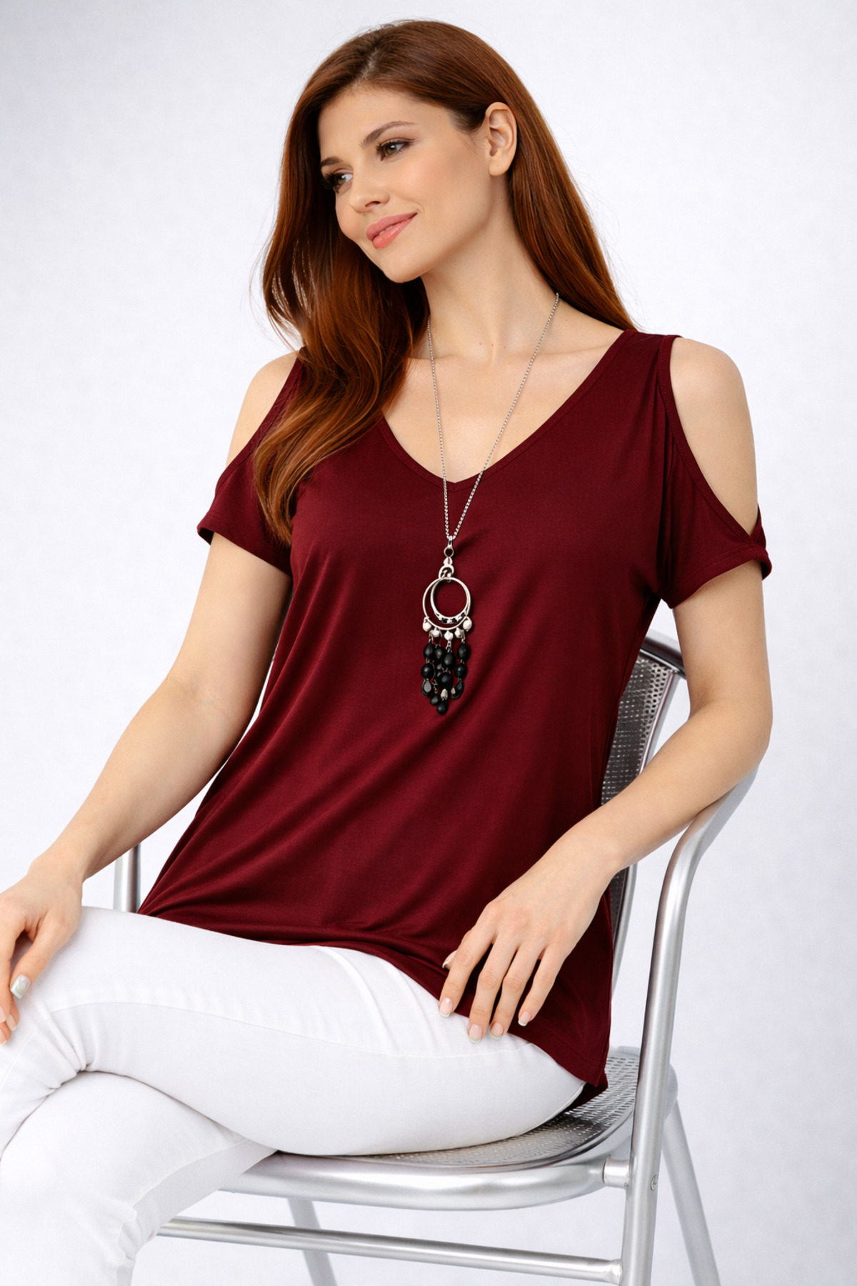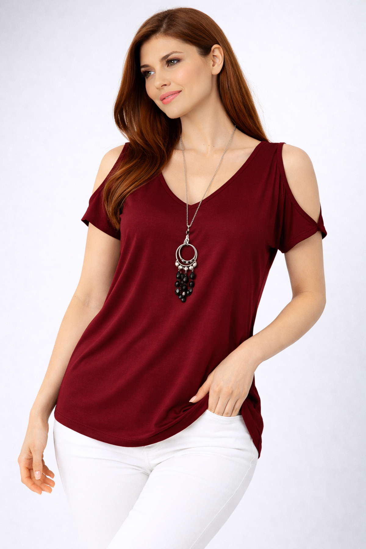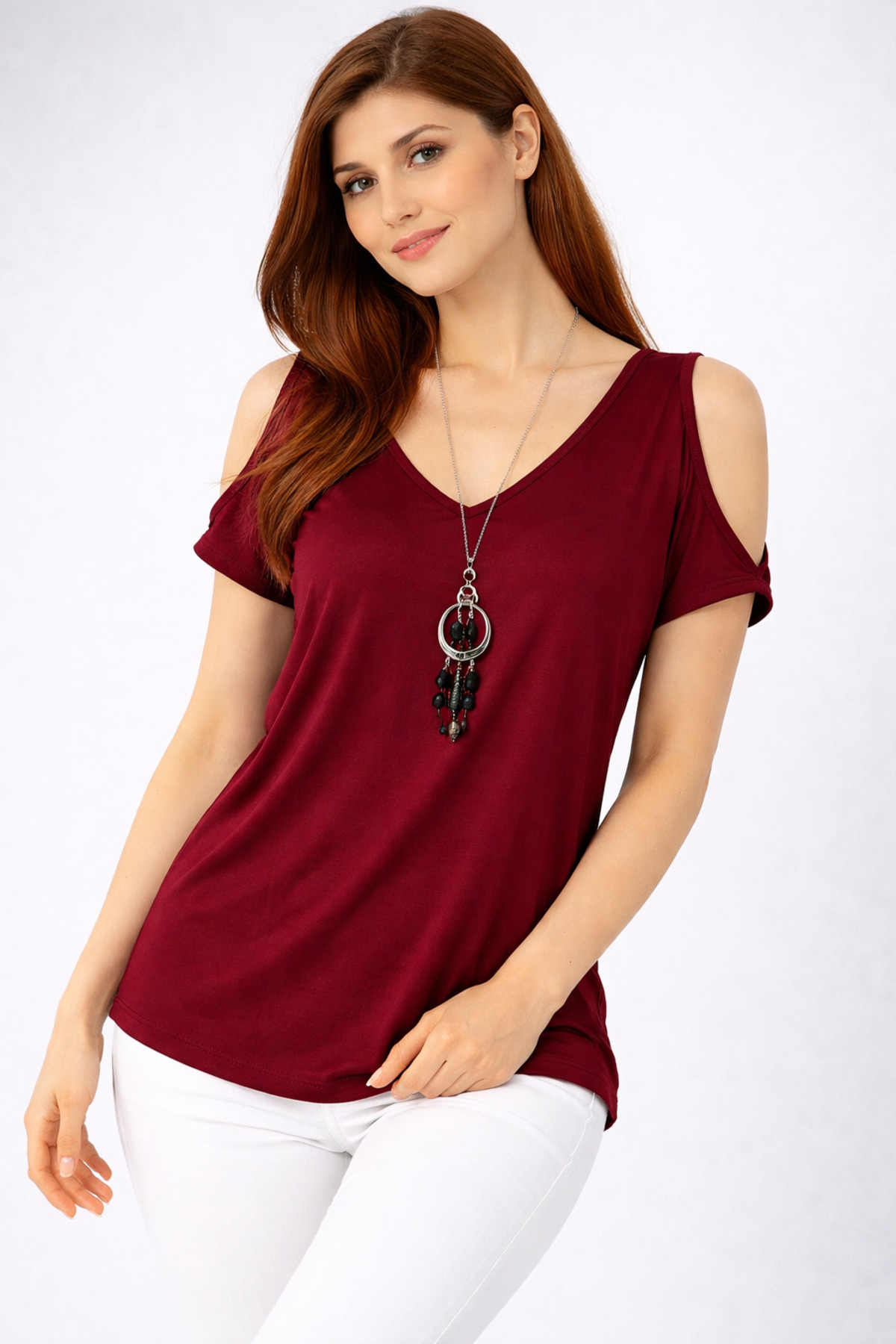 modavingo Women's Claret Red Open Shoulder Necklace Accessory Comfortable Fit Blouse | ByTR