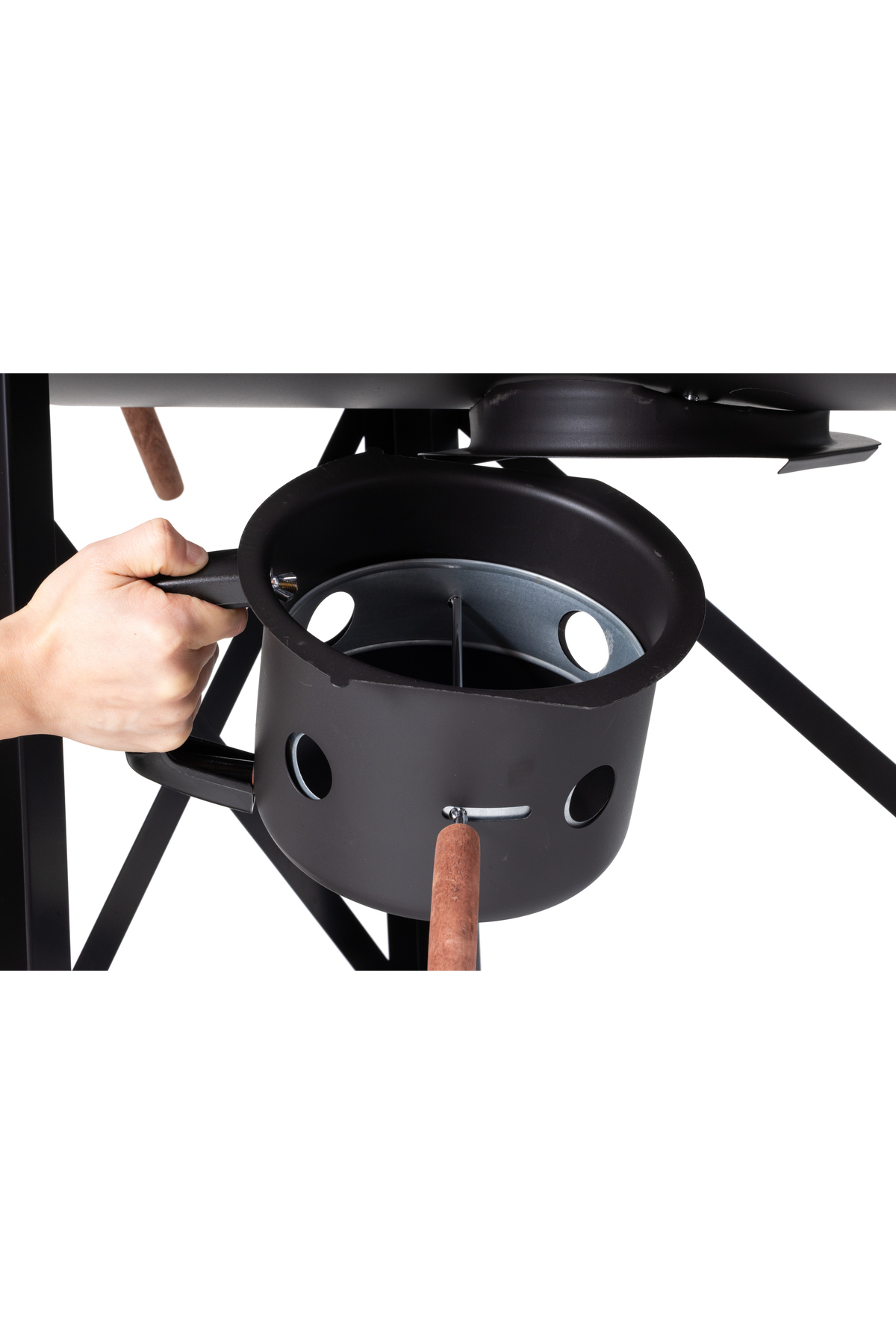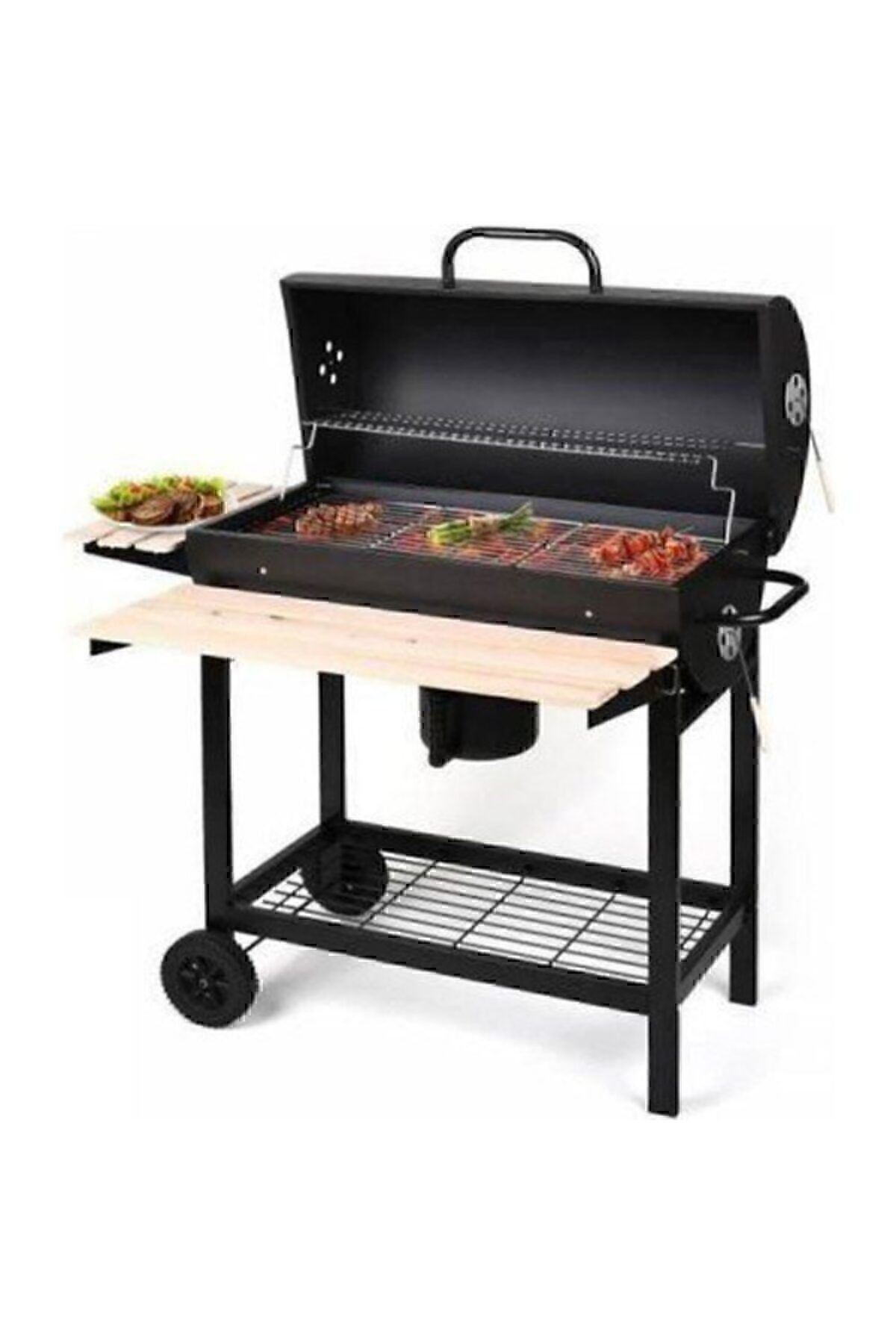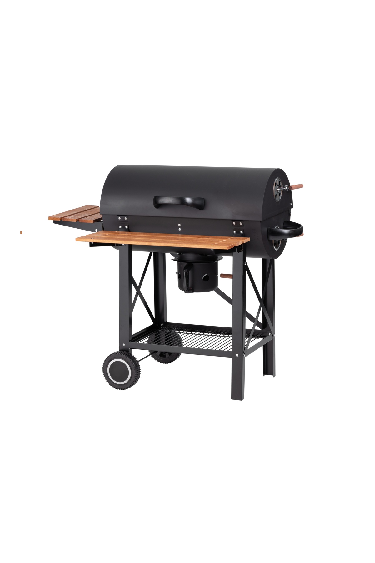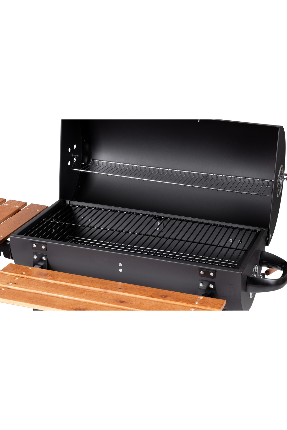 - 1 piece of porcelain enamel steel cooking grill Powder coated steel fire dish and ash pan, chrome plated steel heating rack, zinc plated steel coal grill Foldable FSC certified wooden side table and front shelf 2 pieces of large wheeled bottom storage rack ECO packaging Product Dimensions (D x W x H): 74,00 x 115,00 x 99,00 cm Intended Use: This product is for indoor and outdoor use Cooking Grill Material: Chrome plated steel Product Material: Main material: powder coated steel Cooking Grill Dimensions (L x W): 71 x 35 cm x cm BBQ Type: BBQ Grill Fuel Type: Coal Product Weight: 19,5000 kg Side Table Foldable: Yes Heat Resistant Handles: Yes Is there a lid: Yes Is there a removable ashtray: Yes Is there a side table: Yes If it is with a heating rack: Yes
