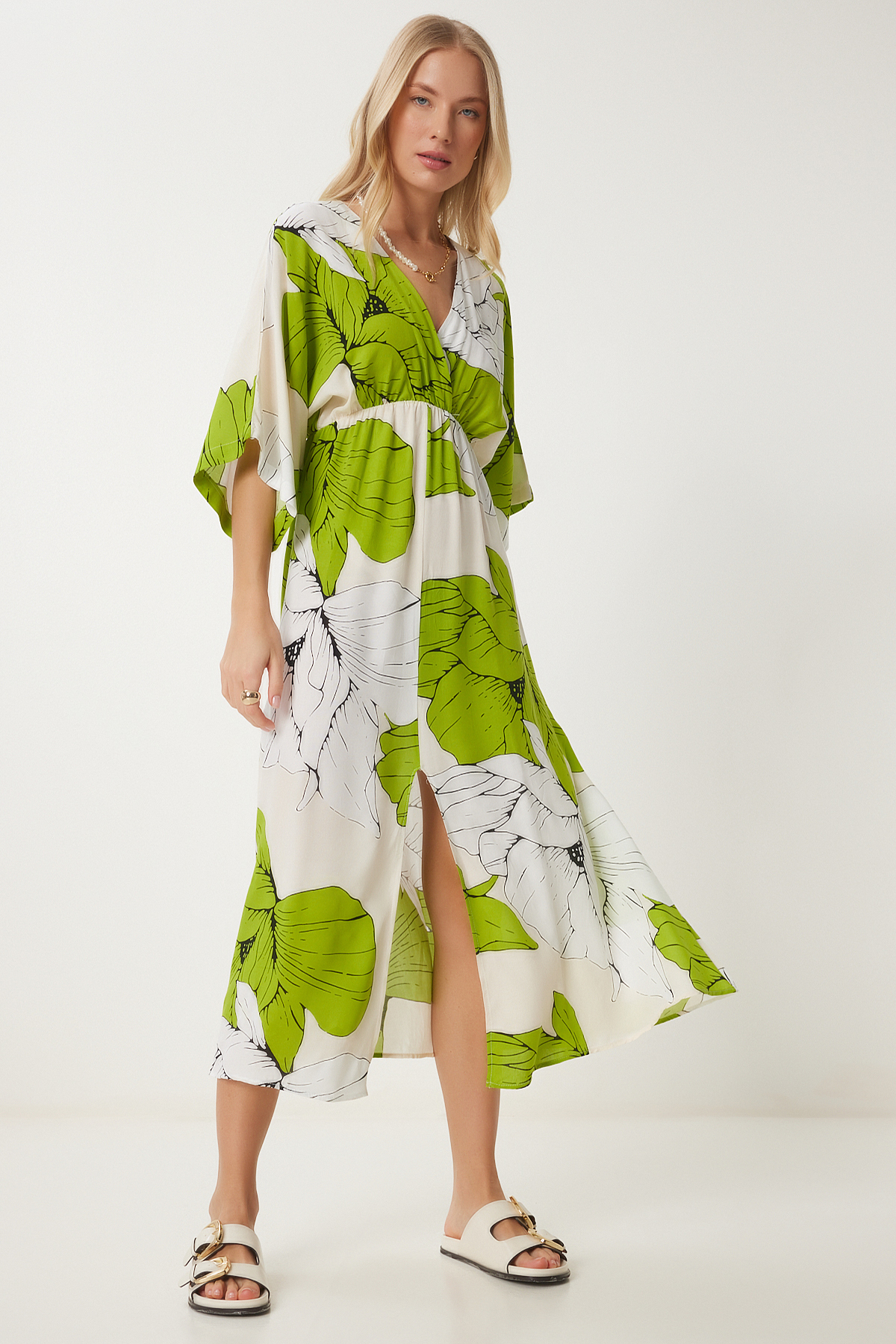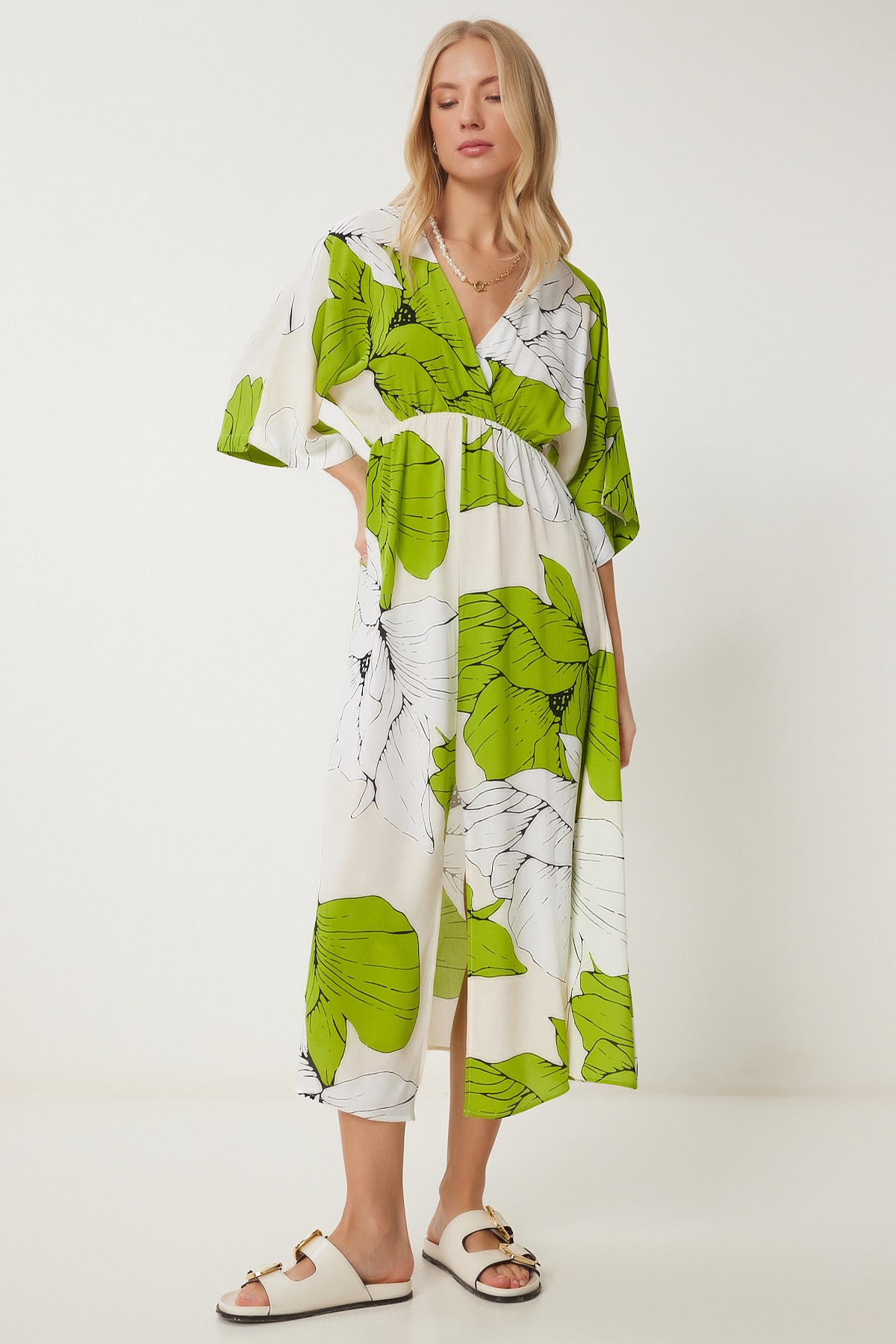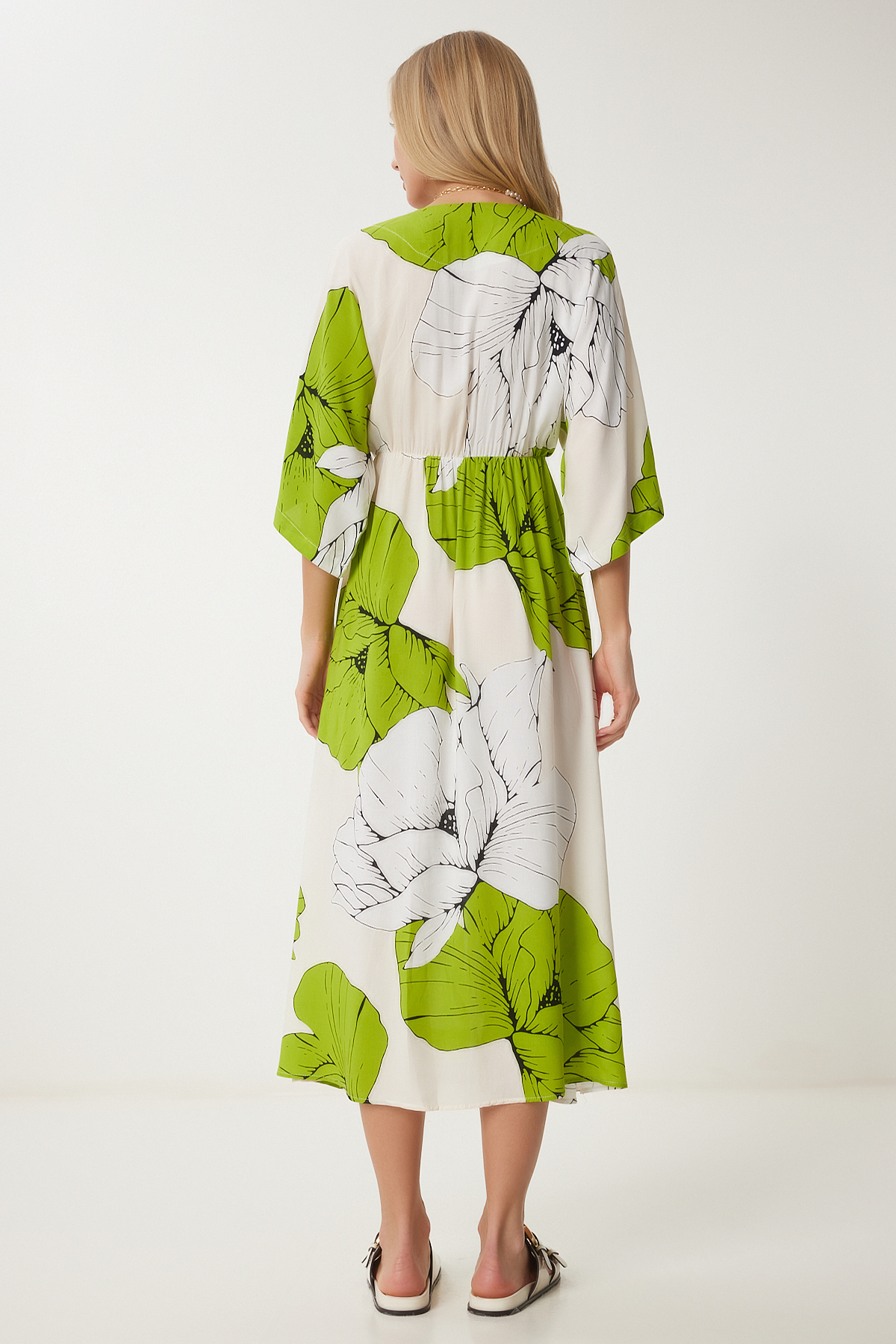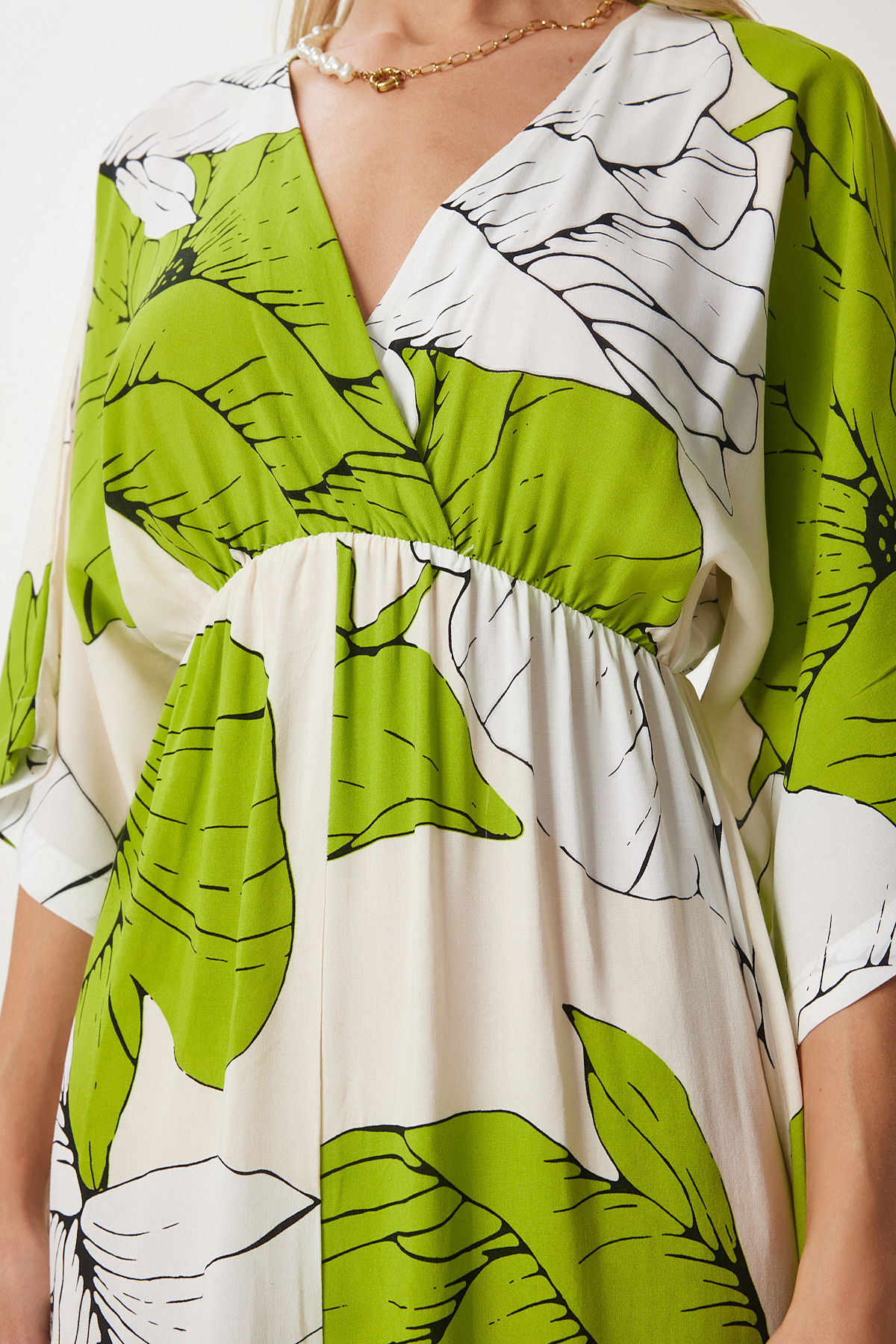 Happiness İstanbul Women's Green White Anvelop Neck Patterned Summer Viscose Dress DK00166 | ByTR