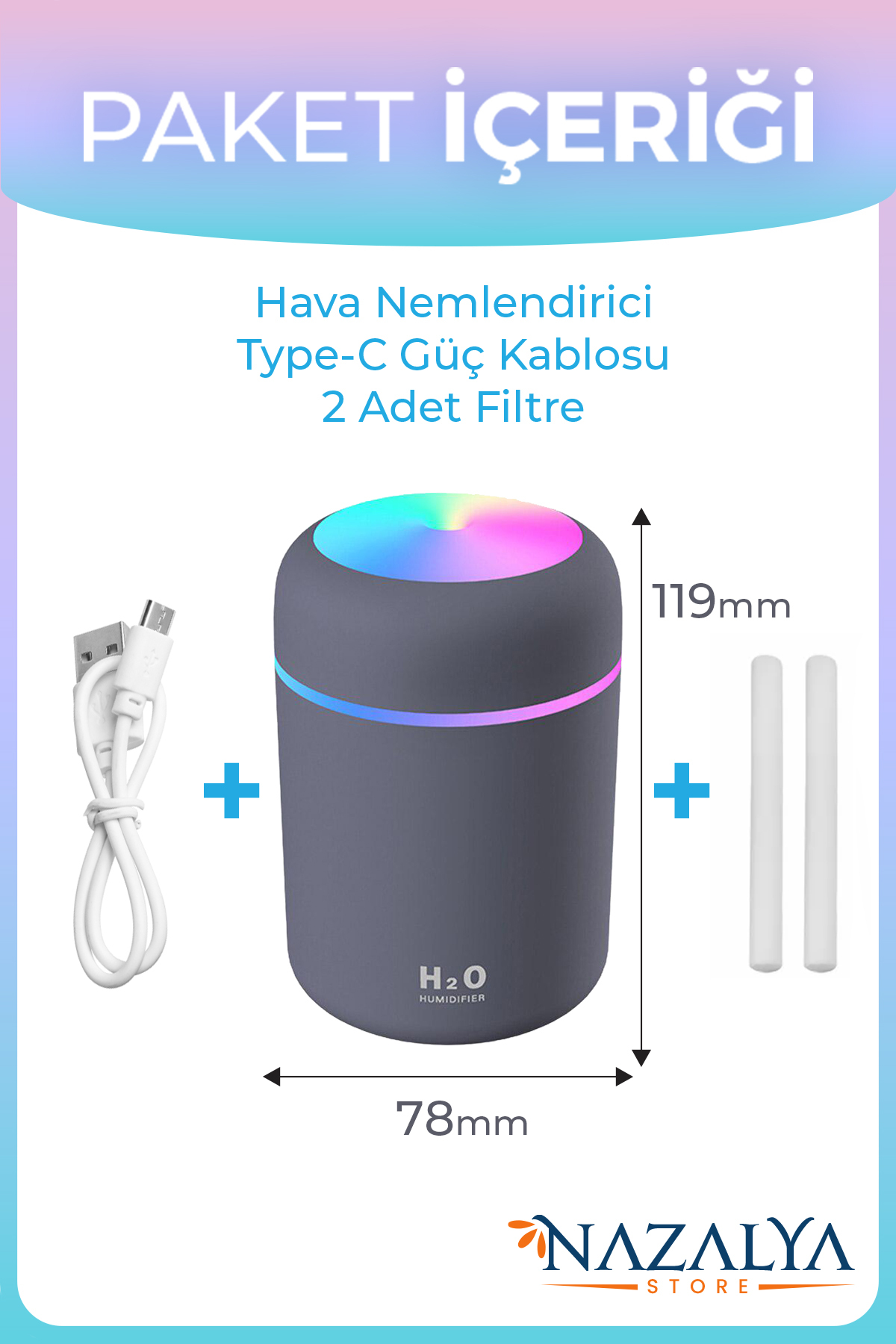 - Low noise level • Powerful Steam • RGB Led lighting • Intermittent steam mode • 300ml Capacity • Auto-off • 6 hours of work • Aroma diffuser • Voltage : DC5V / 1-2A • Operating current : 250-350mA • Color : White / Anthracite / Pink • Size : 1197878mm