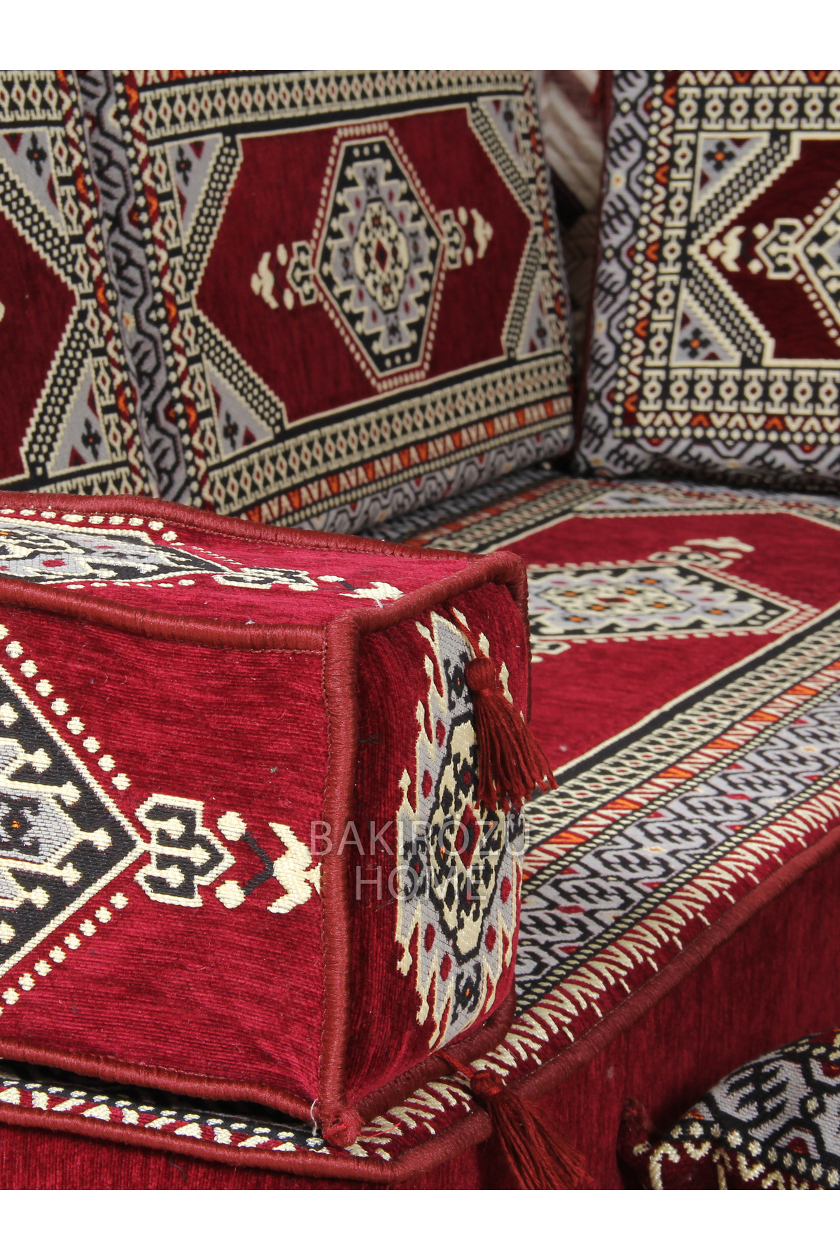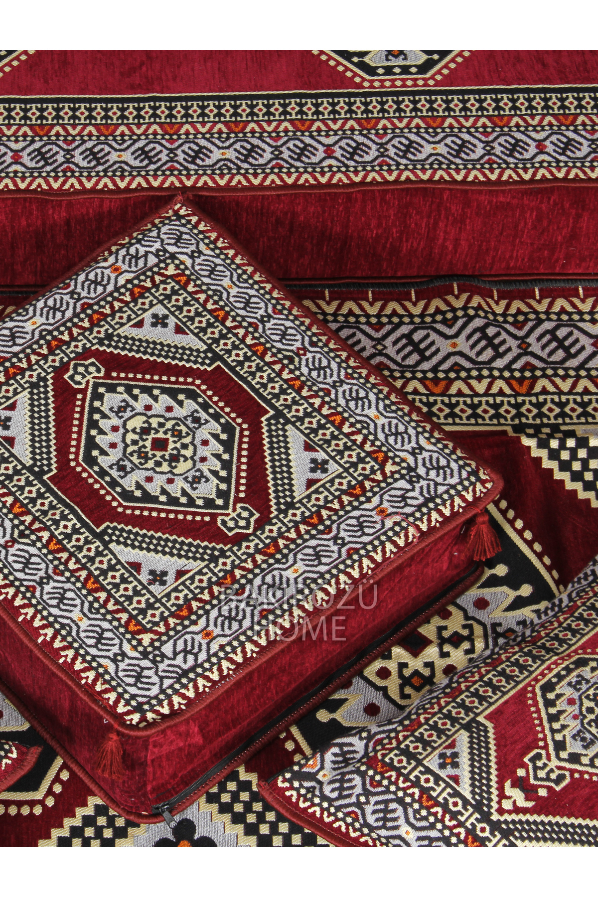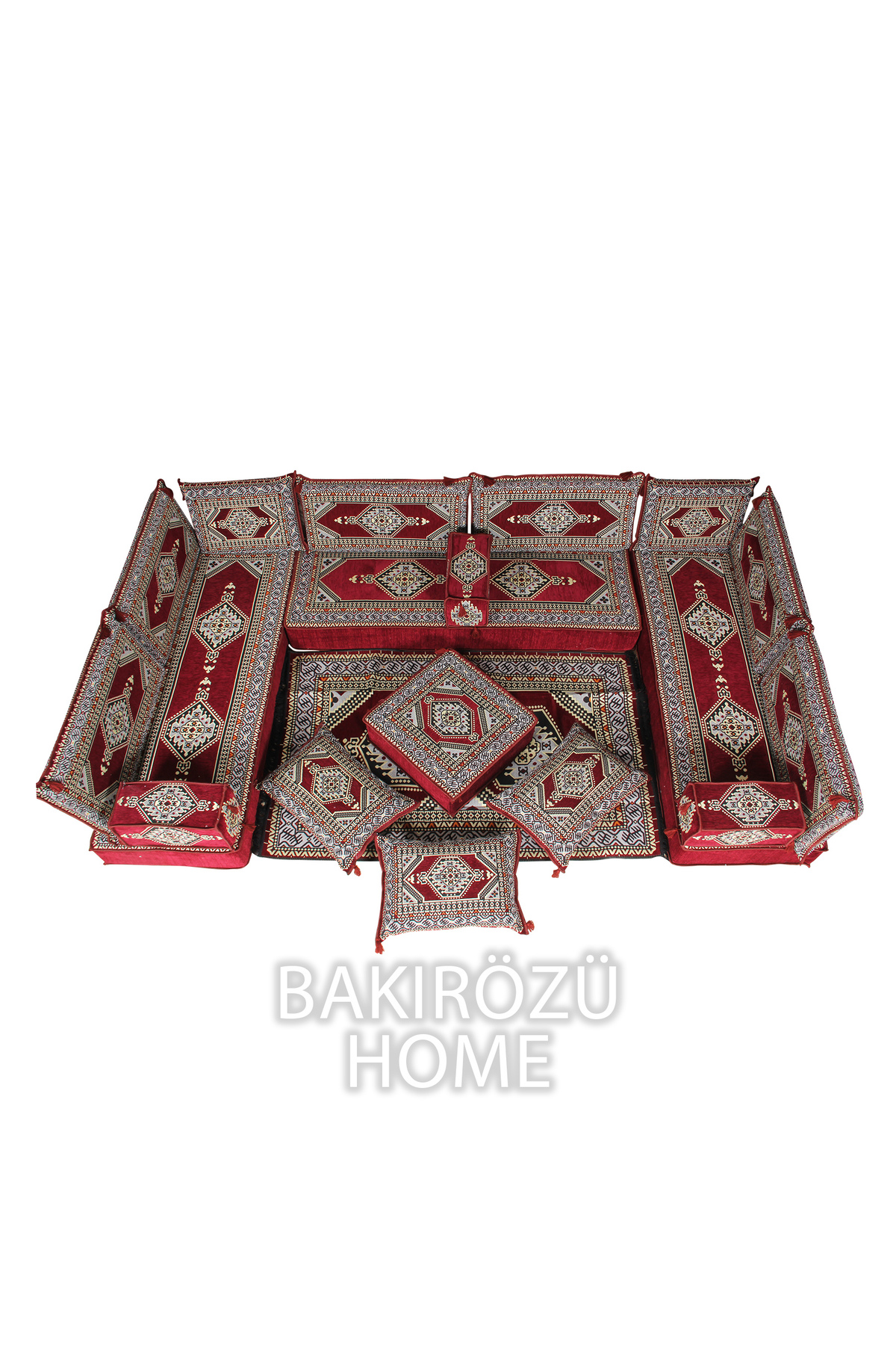 It consists of a total of 19 pieces, including 3 long sitting cushions (70 x 190 x 20 cm), 6 back cushions (42 x 92 x 10 cm), 2 intermediate back cushions (42 x 60 x 10 cm) , 3 armrest cushions (22 x 22 x 50 cm), 1 ottoman sponge pouffe table (60 x 60 x 20 cm), 3 filled floor cushions (45 x 65 cm) and 1 rug ( 120 cm x 180 cm ).
