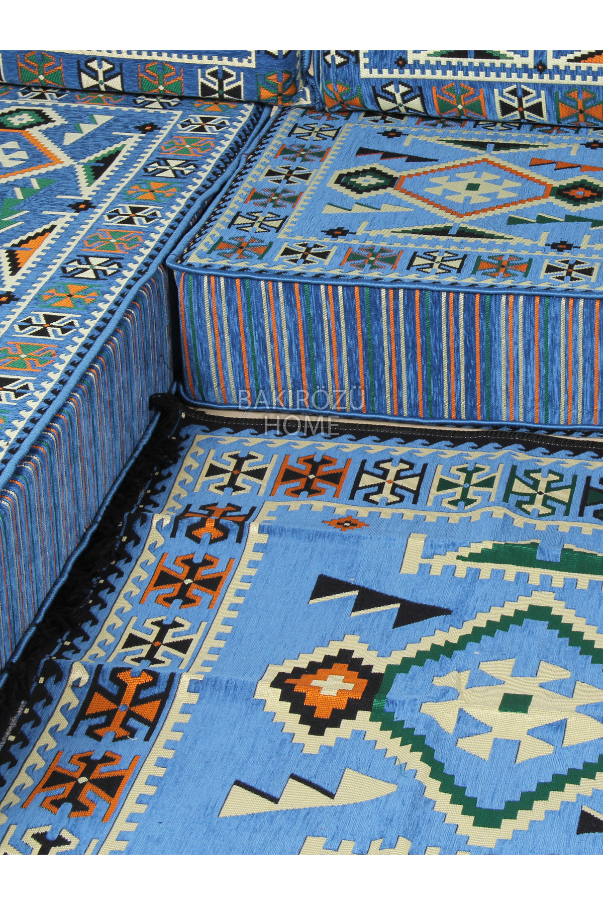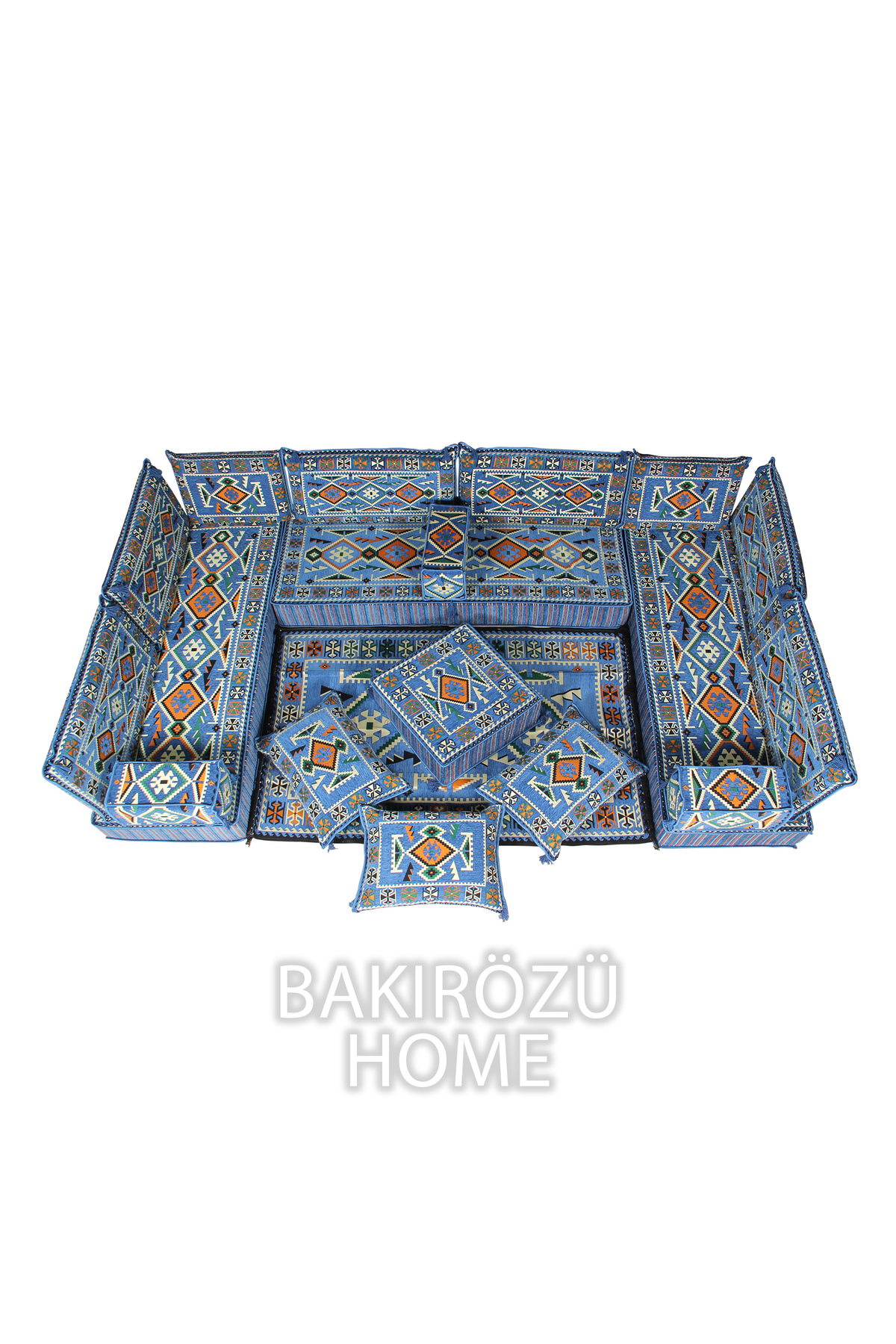 It consists of a total of 19 pieces, including 3 long sitting cushions (70 x 190 x 20 cm), 6 back cushions (42 x 92 x 10 cm), 2 intermediate back cushions (42 x 60 x 10 cm) , 3 armrest cushions (22 x 22 x 50 cm), 1 ottoman sponge pouffe table (60 x 60 x 20 cm), 3 filled floor cushions (45 x 65 cm) and 1 rug ( 120 cm x 180 cm ).