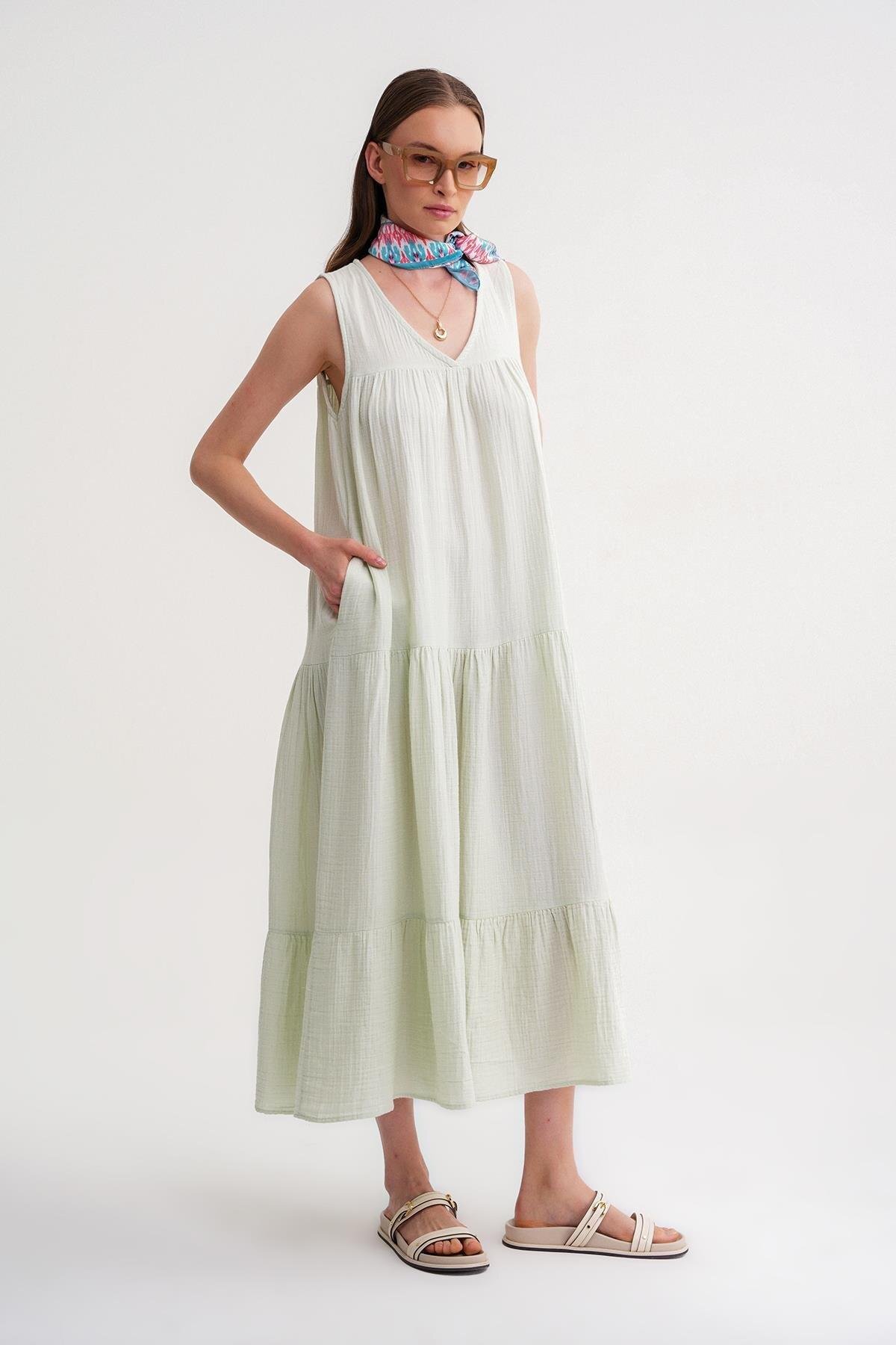 Mixray 4673 Women's Shirring Detailed Muslin Dress Sage | ByTR