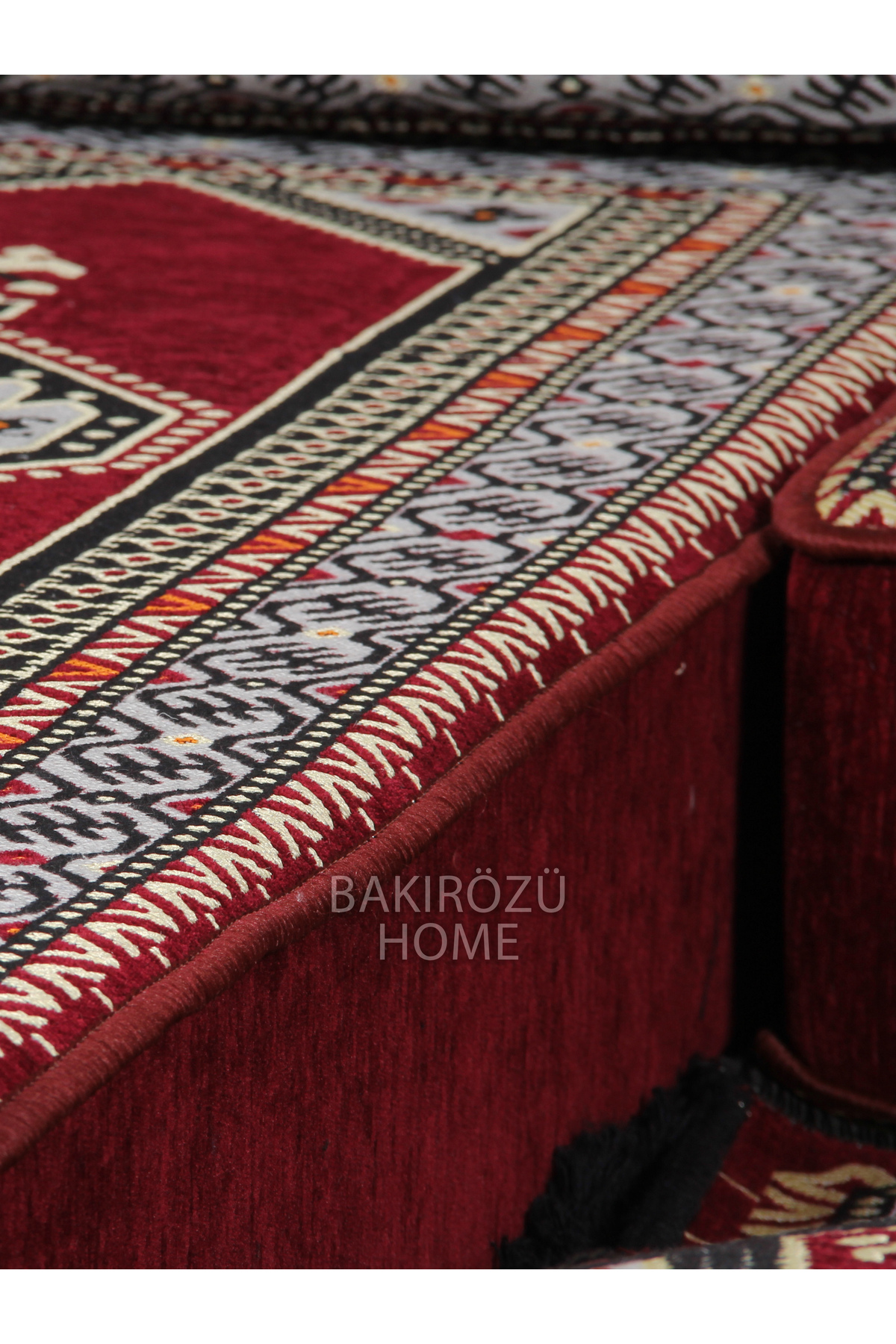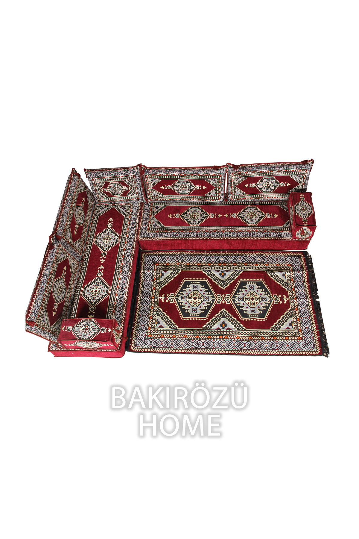 It consists of a total of 10 pieces, including 2 long sitting cushions (70 x 190 x 20 cm), 4 back cushions (42 x 92 x 10 cm), 1 intermediate back cushion (42 x 60 x 10 cm) , 2 armrest cushions (22 x 22 x 50 cm), 1 rug ( 120 cm x 180 cm ).