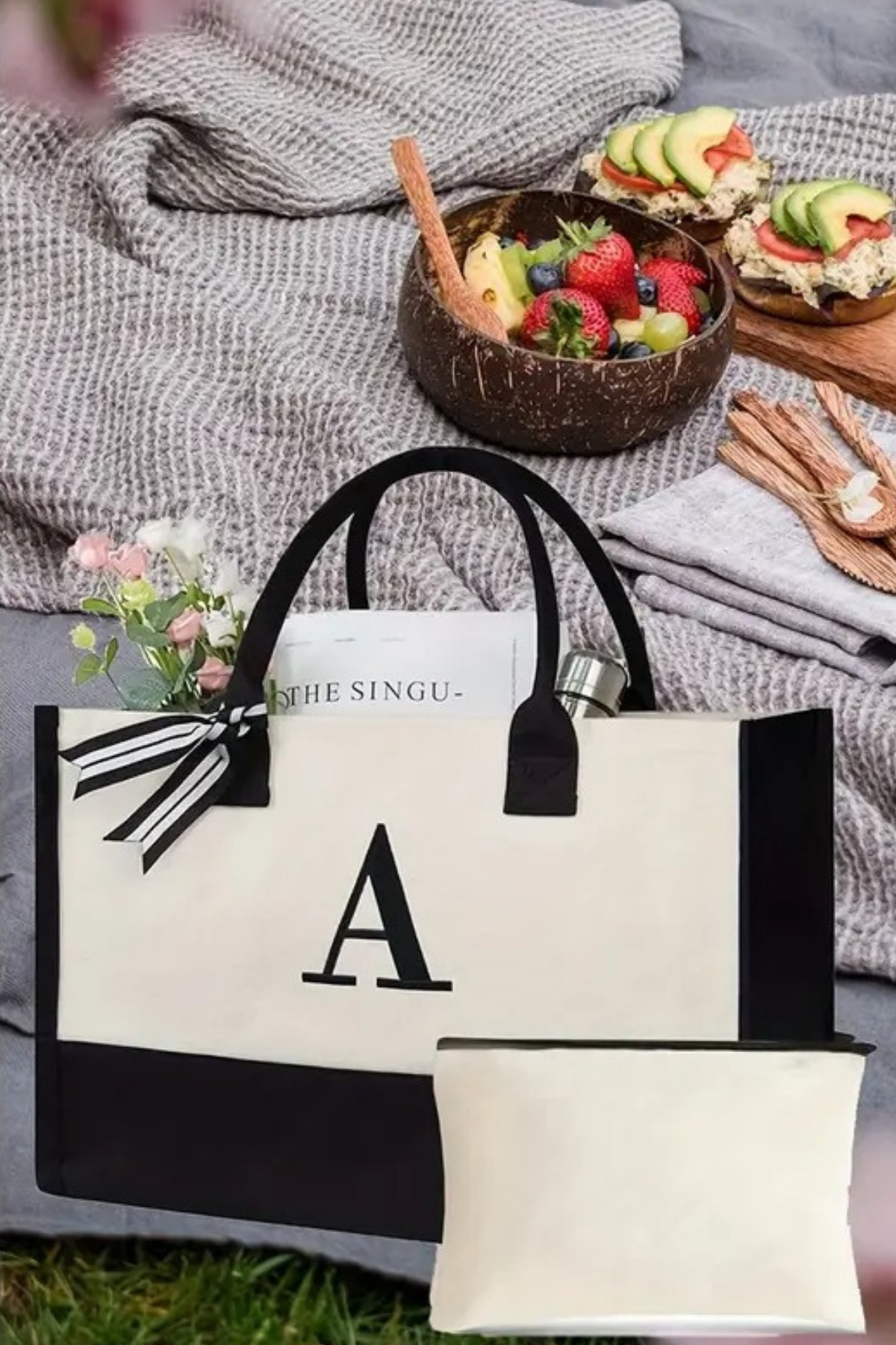 Printed Canvas Fabric Beach Bag with Initials of Your Name - Makeup Bag with Gift