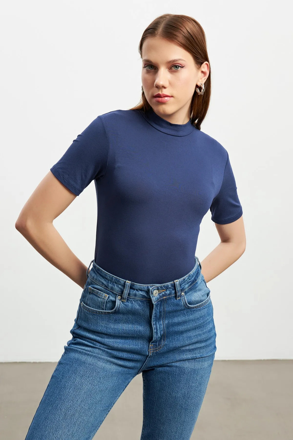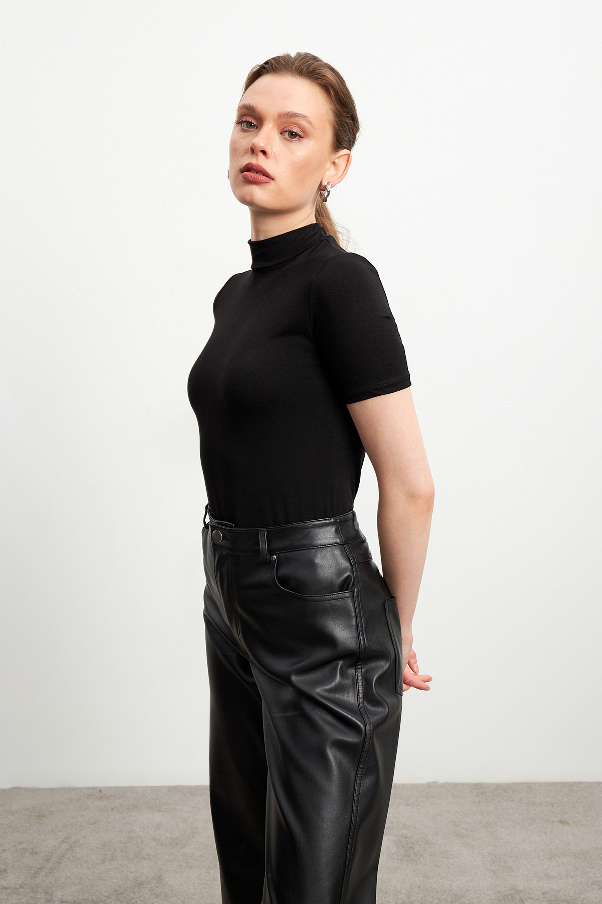 While adding an elegant touch to your neck with its half turtleneck, its short-sleeved structure is ideal for the summer months.