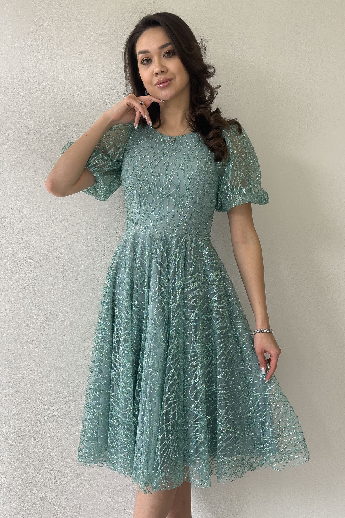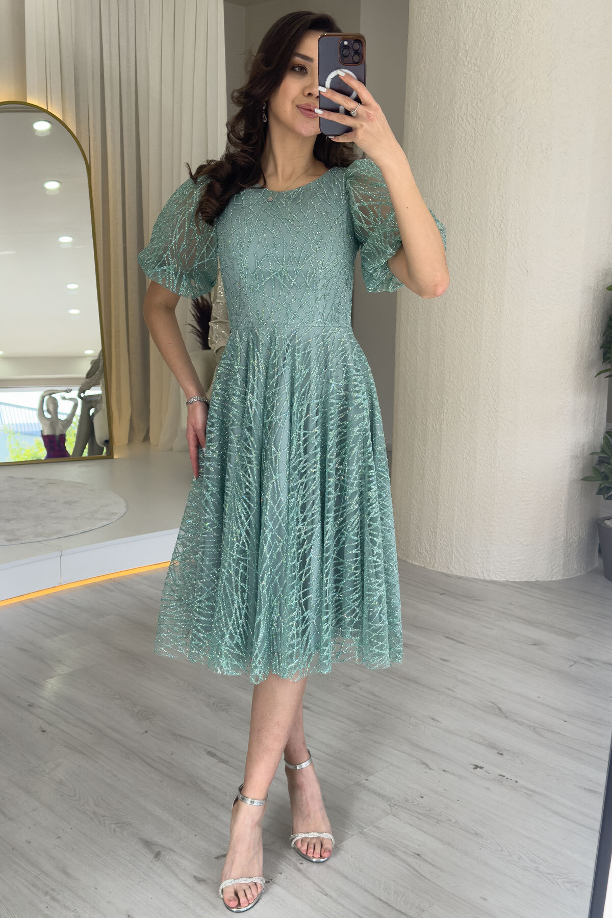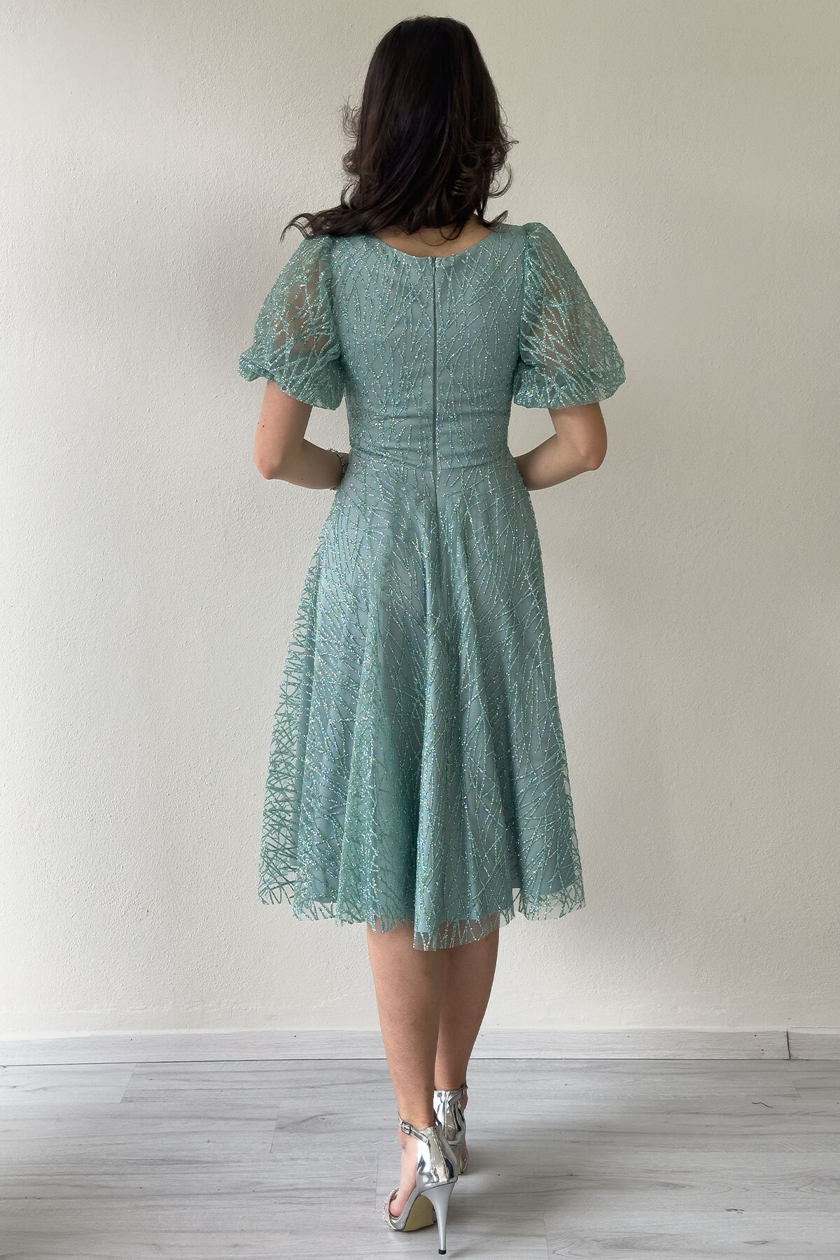 Balloon Sleeve Silvery Flared Midi Evening Dress Features Elegance at every step with flared skirt cut Nostalgic touch with balloon sleeves A glitter that follows the light with silvery fabric Comfort and confidence thanks to a modern and classic style Lined structure In harmony with your body type This model is especially suitable for apple-type or pear-type bodies.