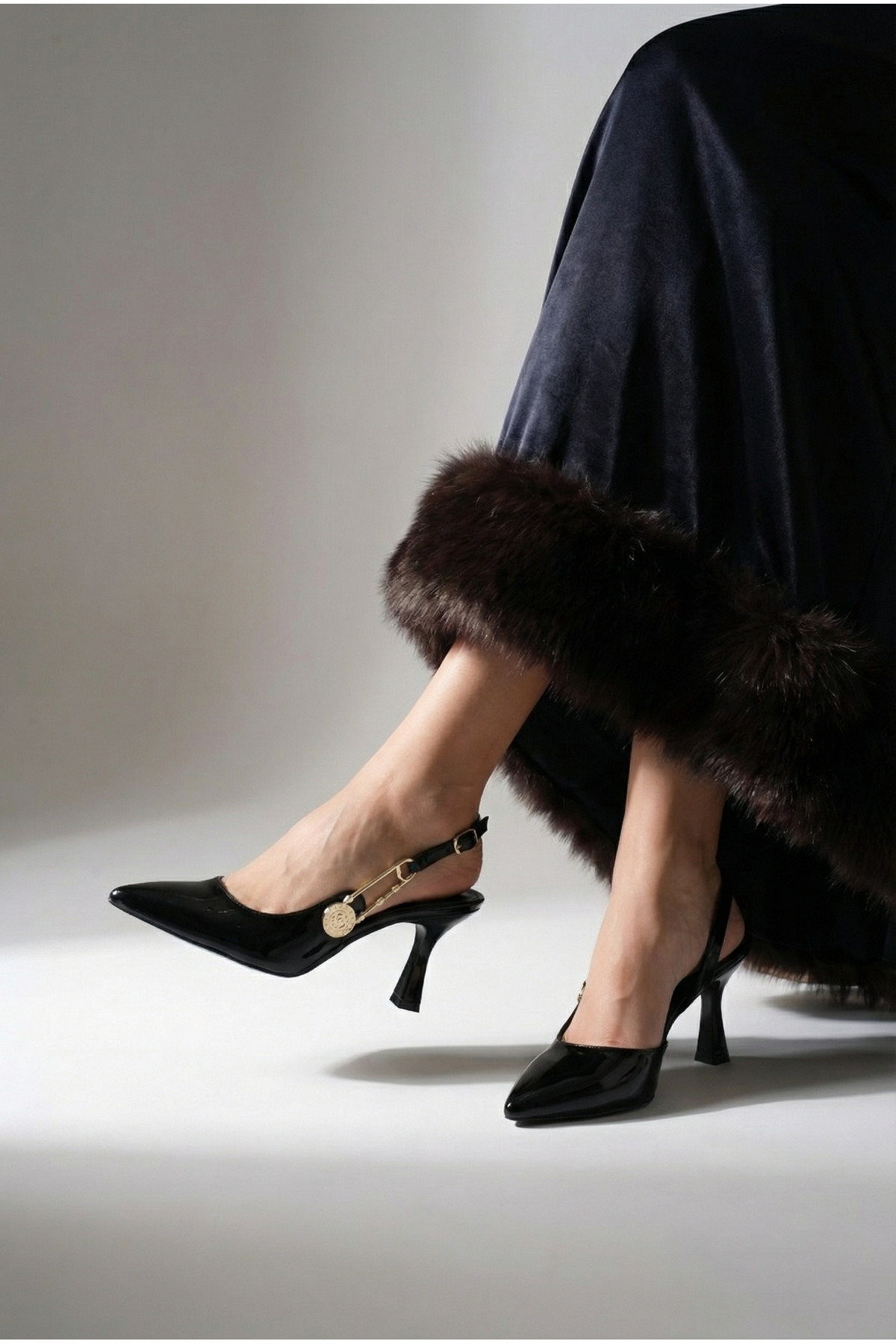 Brielfy Women's Pointed Toe Tapered 7cm Heel Black Slingback Summer Graduation Shoes with Side Buckle | ByTR