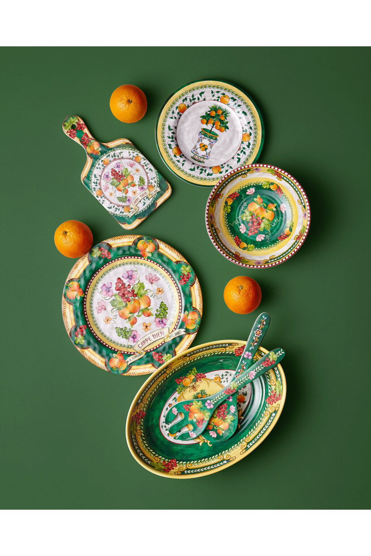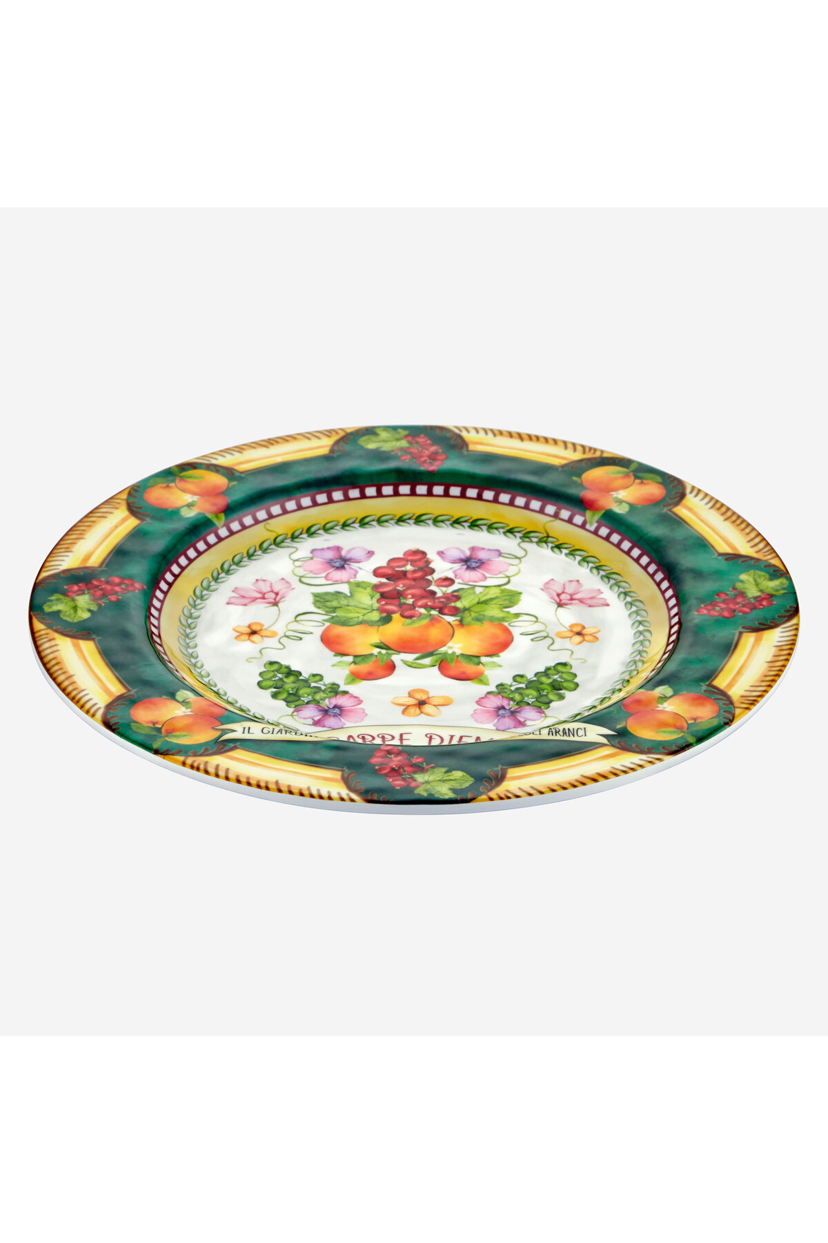 The green melamine dinner plate, decorated with currant, orange and flowers on a white background by Chiara Alessi Carpe Diem, is designed for long-term use, extra resistant to breakage and scratching, and BPA free.