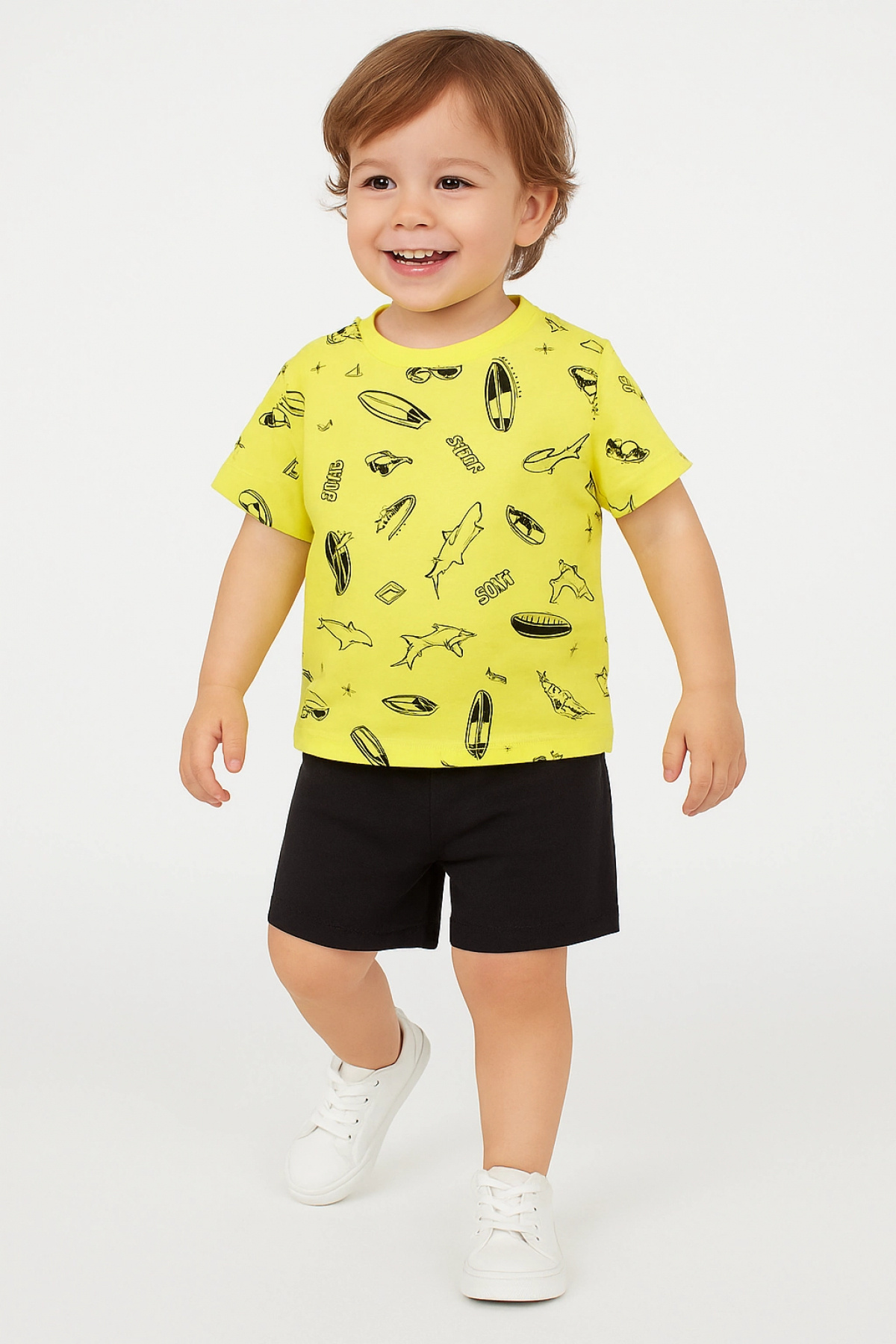 Boys Set 100% Cotton Yellow Printed T-Shirt and Black Shorts Bottom Top Set