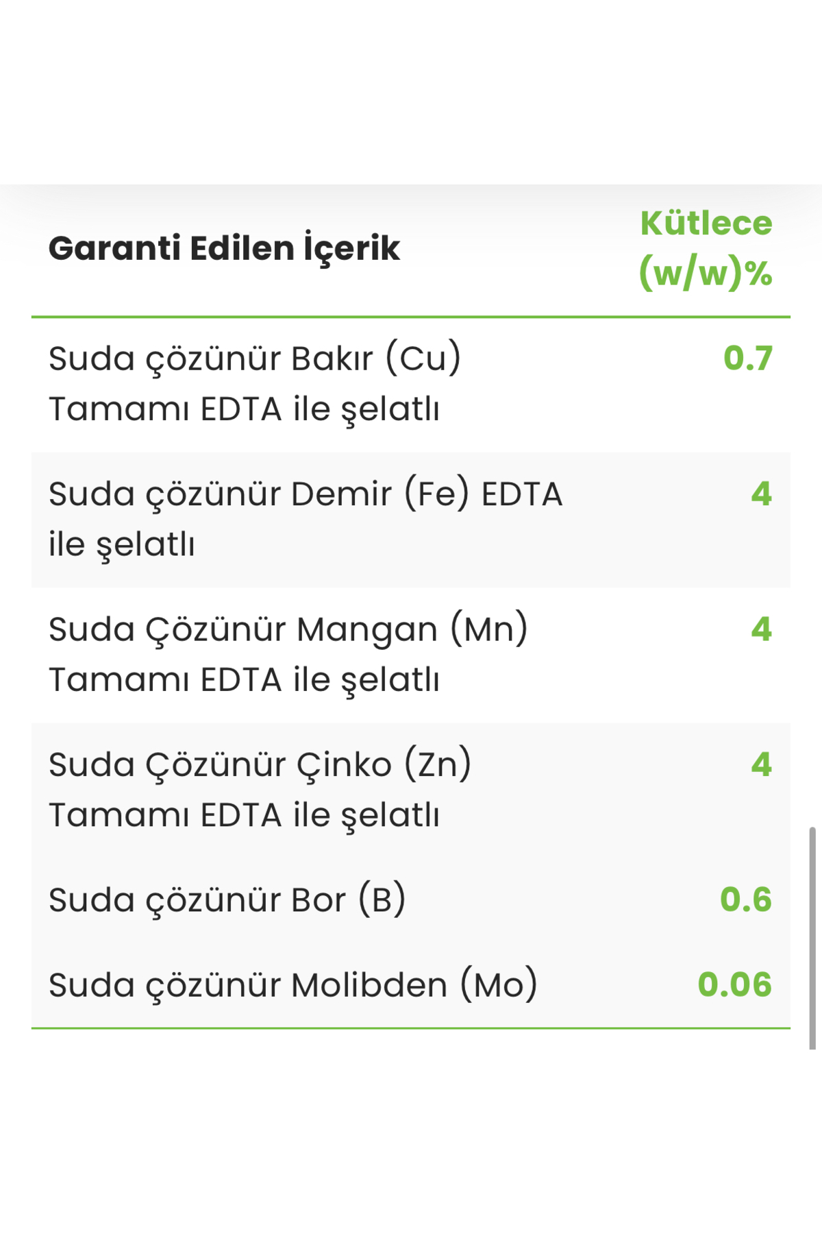Thanks to the zinc (Zn), iron (Fe), manganese (Mn), copper (Cu) and other trace elements 🔸 it contains: • Prevents yellowing and developmental retardation • Increases fruit retention • Strengthens 📦 the immunity of the plant Uses: Vegetables, fruit trees, cereals, vineyards and ornamental plants 📏 Usage: Leaf 100-150 cc / 100 lt water 1-2 lt / da 💬 Note: The effect is observed in a short time after the first use.